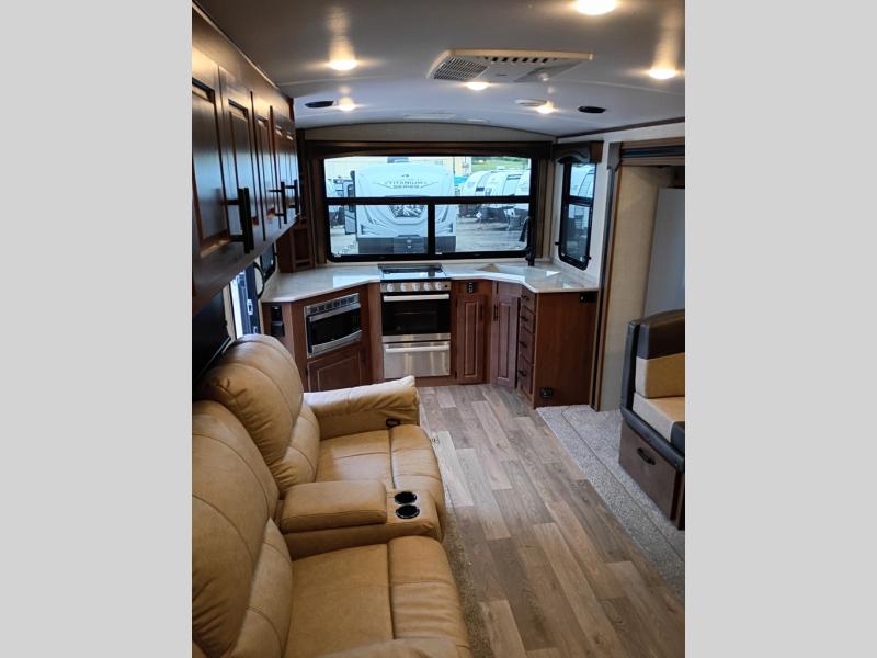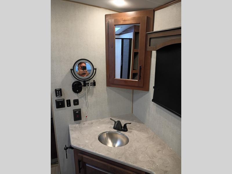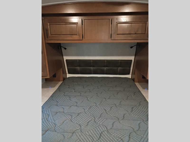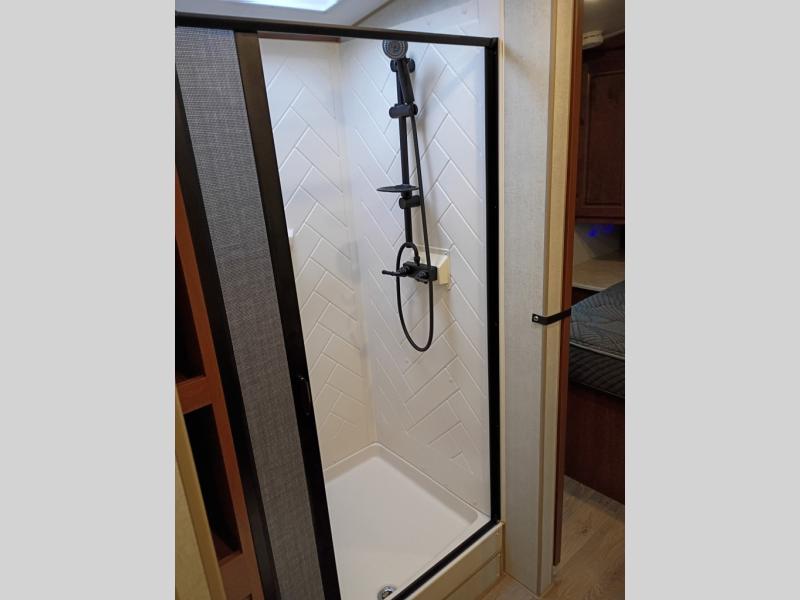 Pack your bags and escape the city life for weekend camping trips in this dual entry travel trailer. When you arrive at the campsite, take a hike to stretch your legs, then come back to prepare lunch on the three burner cooktop. You'll find plenty of counter space in the kitchen, plus a 10 cu. ft. refrigerator for cold drinks and perishables. The dual lounge chairs will have you feeling right at home, or you can choose the optional sofa with built-in recliners, or the optional sleeper sofa if you need more sleeping space. This model includes a walk-through bath that is both spacious and convenient since it leads to to the front master bedroom. You can't beat a queen bed, dual bedroom wardrobes, and your own exterior entry door!