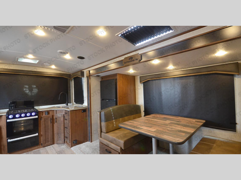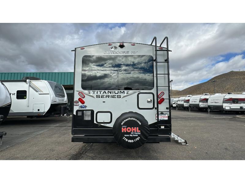 With any Timber Ridge Titanium Series travel trailer by Outdoors RV you will enjoy the sleek design frameless thermal pane windows, along with the silver fiberglass front cap and Titanium Series graphics package. The rugged 8' chassis with 5,100 lb. axles and XL ground clearance will make maneuvering tougher terrain easier than ever, and there is a wireless rear, side(s) turn camera system for hassle-free parking. Each model includes LG solid surface countertops, mountain lodge interiors, hardwood slide out fascia(s), and many more comforts!