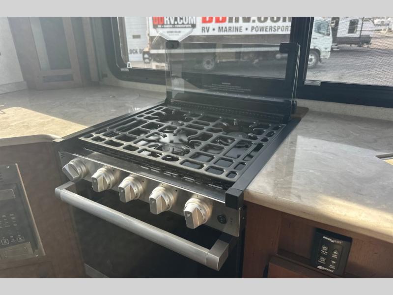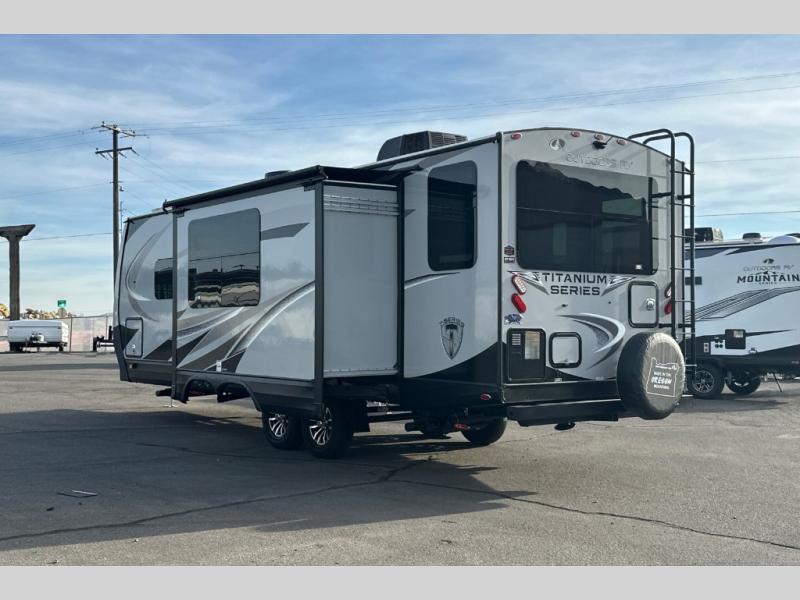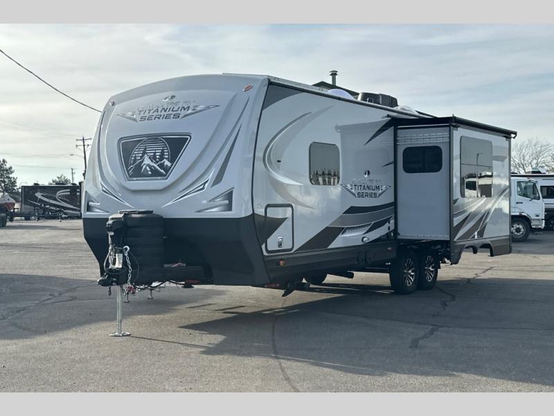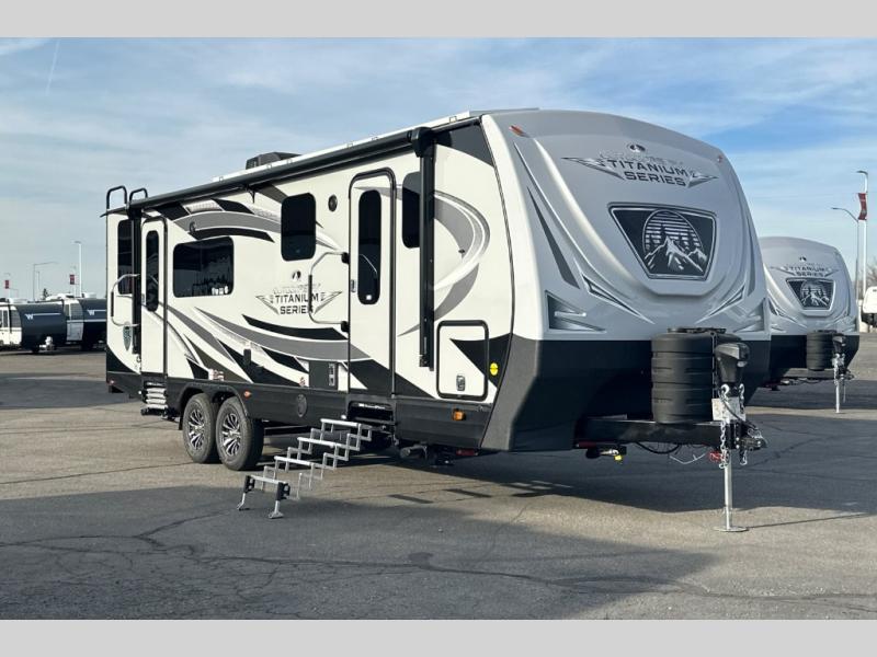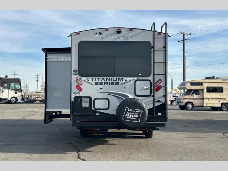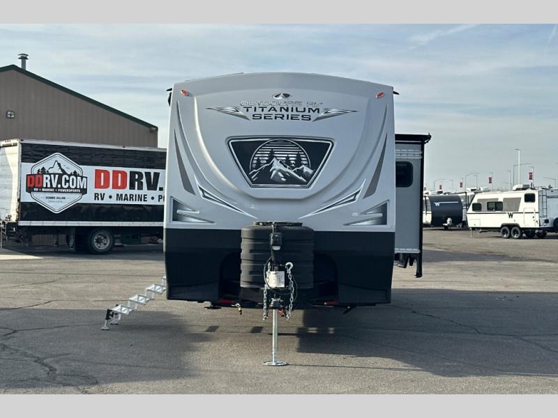 With any Timber Ridge Titanium Series travel trailer by Outdoors RV you will enjoy the sleek design frameless thermal pane windows, along with the silver fiberglass front cap and Titanium Series graphics package. The rugged 8' chassis with 5,100 lb. axles and XL ground clearance will make maneuvering tougher terrain easier than ever, and there is a wireless rear, side(s) turn camera system for hassle-free parking. Each model includes LG solid surface countertops, mountain lodge interiors, hardwood slide out fascia(s), and many more comforts!