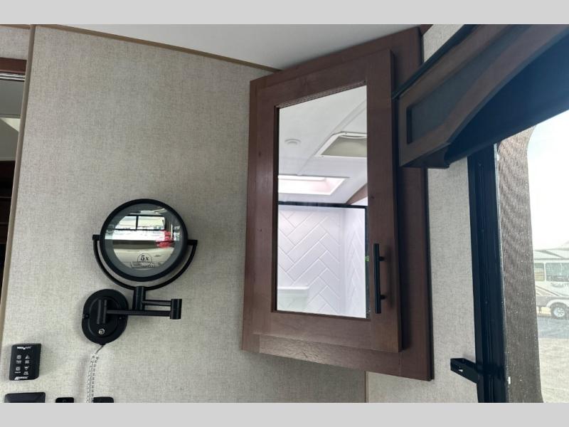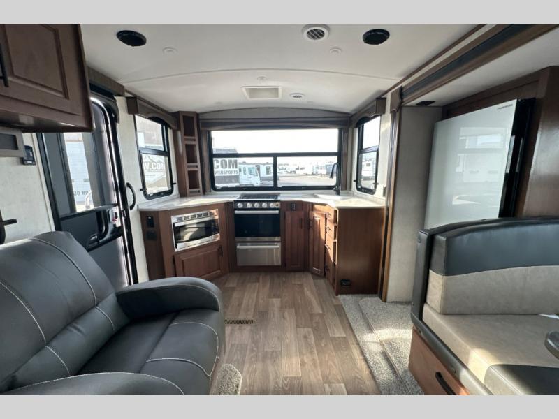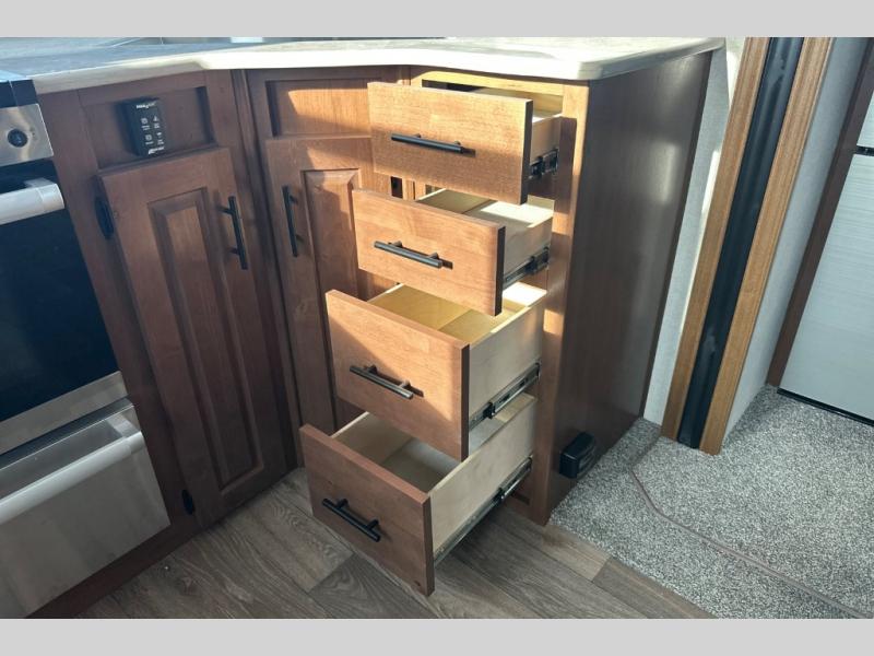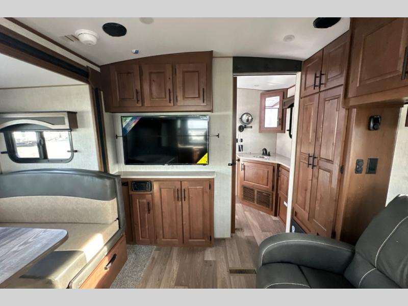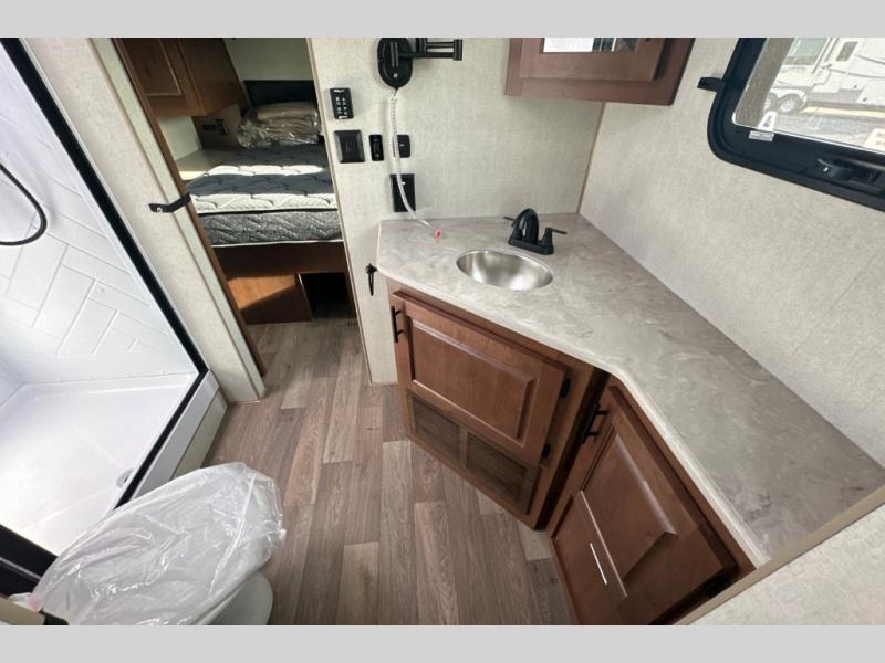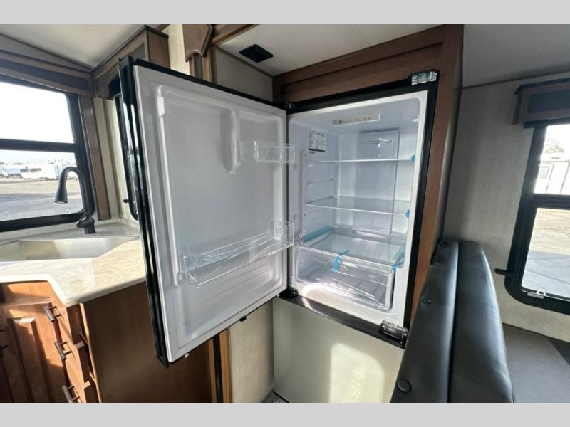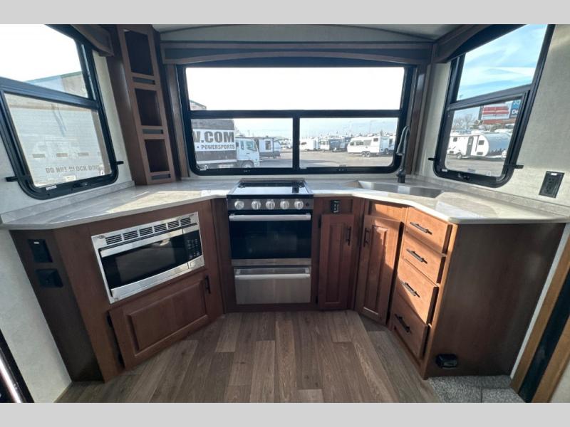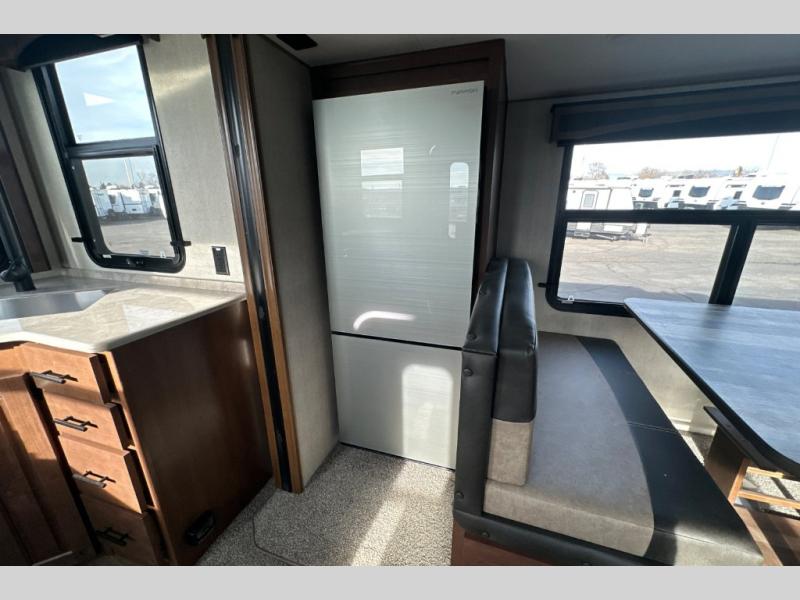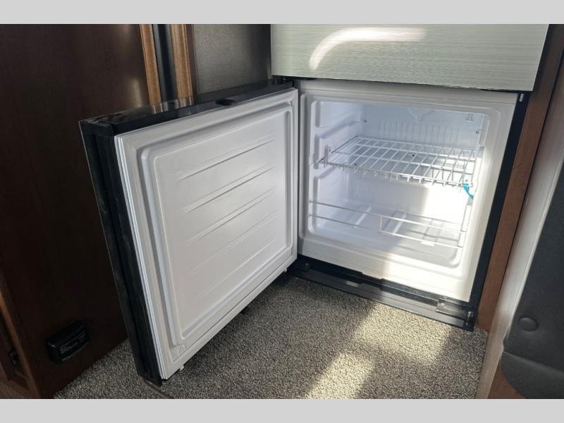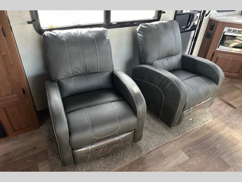 Pack your bags and escape the city life for weekend camping trips in this dual entry travel trailer. When you arrive at the campsite, take a hike to stretch your legs, then come back to prepare lunch on the three burner cooktop. You'll find plenty of counter space in the kitchen, plus a 10 cu. ft. refrigerator for cold drinks and perishables. The dual lounge chairs will have you feeling right at home, or you can choose the optional sofa with built-in recliners, or the optional sleeper sofa if you need more sleeping space. This model includes a walk-through bath that is both spacious and convenient since it leads to to the front master bedroom. You can't beat a queen bed, dual bedroom wardrobes, and your own exterior entry door!