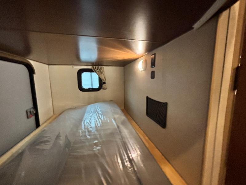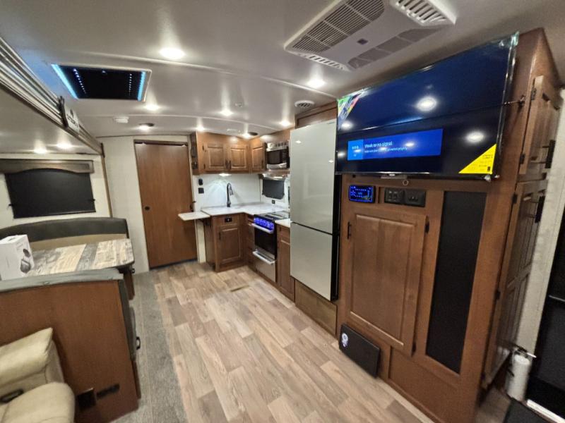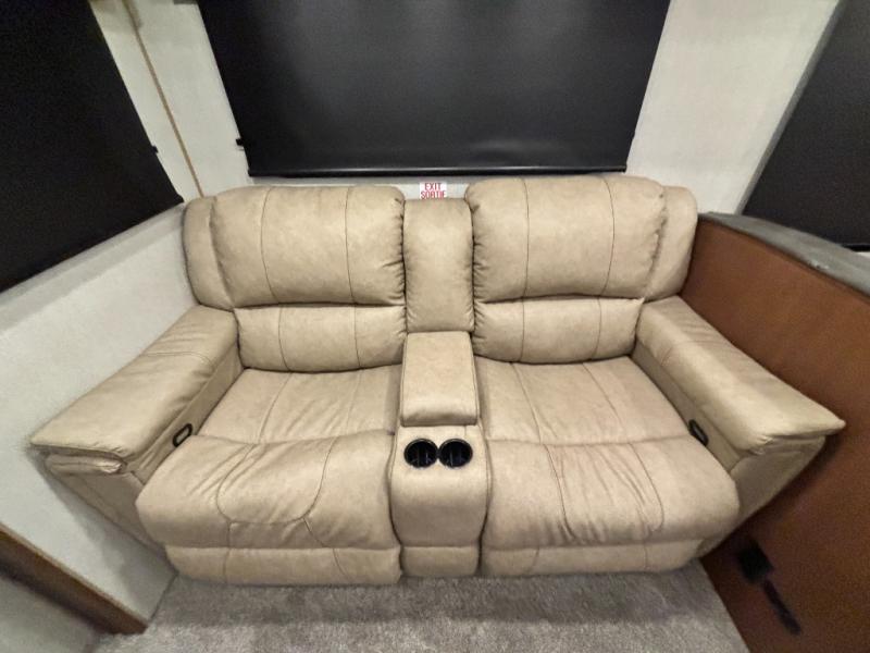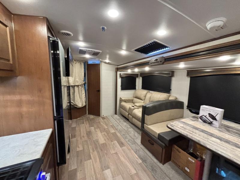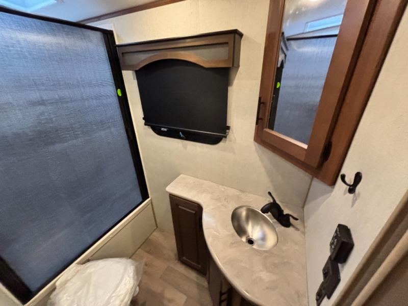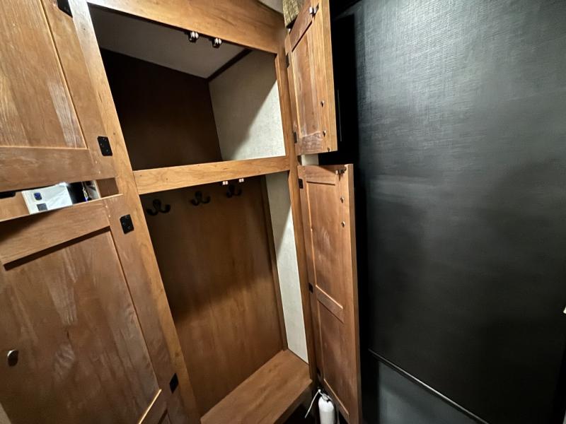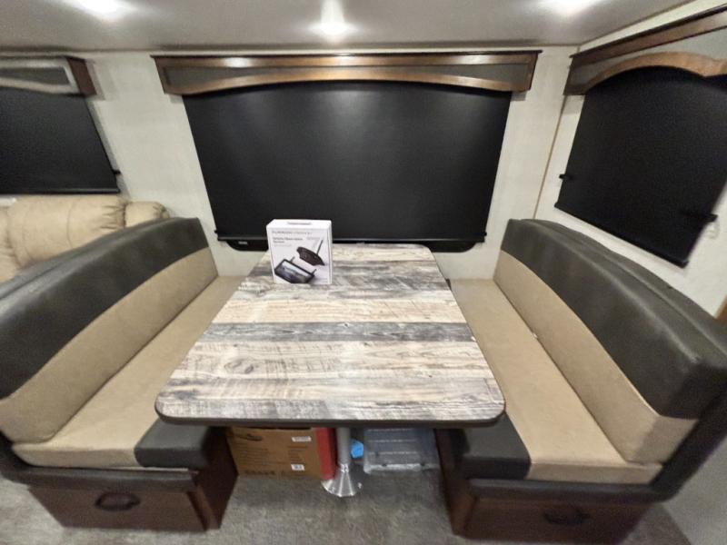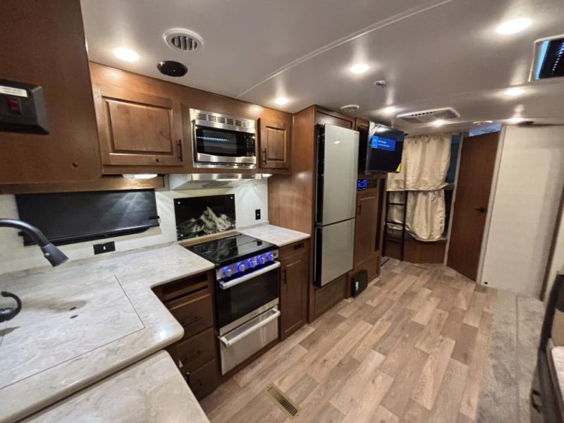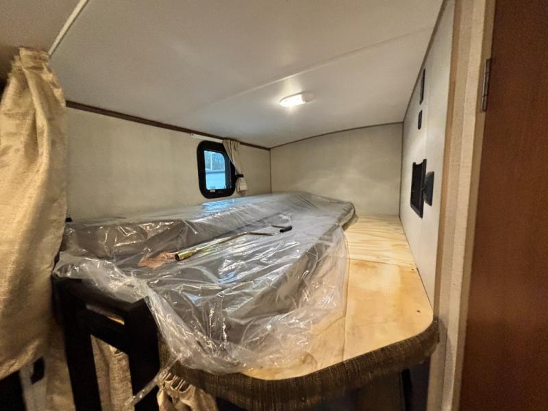 How does double-size bunks sound for your next camping trip? The kids are sure to love them, while you enjoy the queen bed in the front bedroom. There is a garage storage door that will be perfect for luggage, lawn chairs, and coolers, plus there is plenty of storage inside as well. The chef of your group will love cooking in the kitchen with its flip-up counter, three burner cooktop, and large pantry for dry goods. The large slide out in the main living area will provide space to let the dog rest on the floor, and your crew can get comfortable on the sleeper sofa or play a game at the mountain dinette.