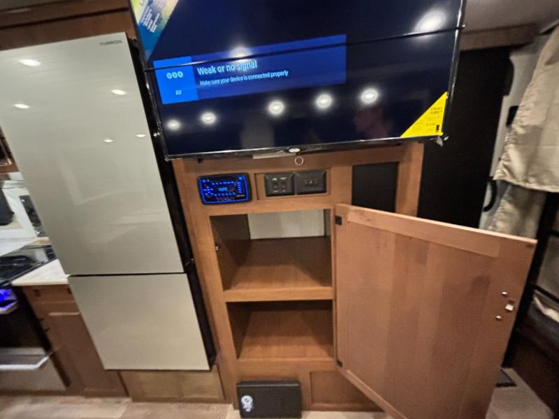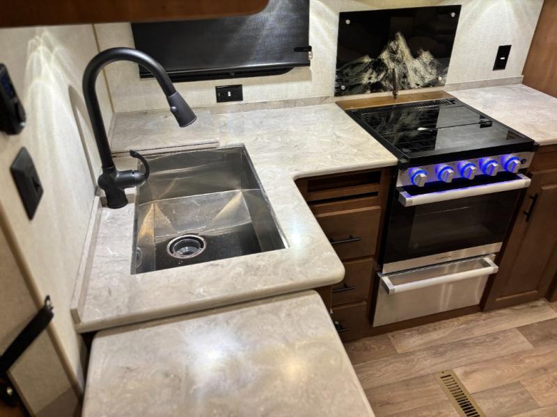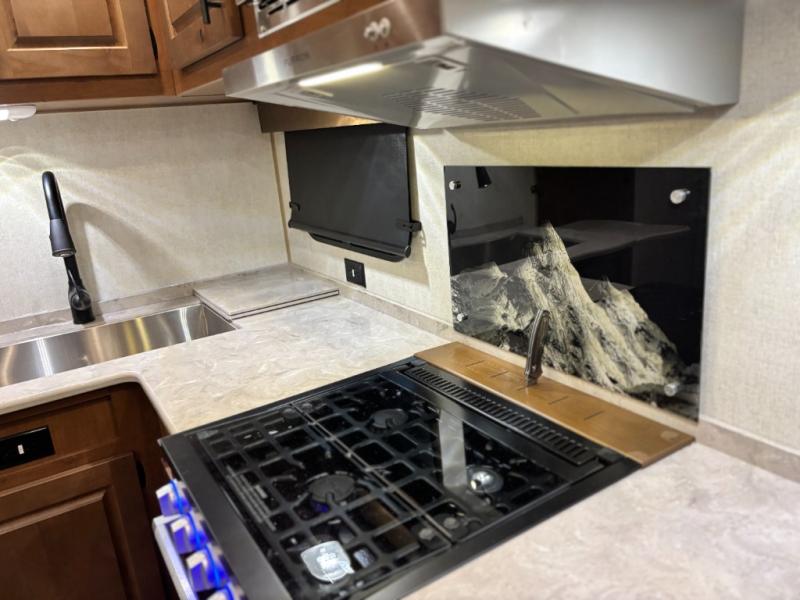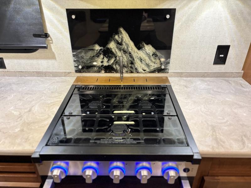 With any Timber Ridge Titanium Series travel trailer by Outdoors RV you will enjoy the sleek design frameless thermal pane windows, along with the silver fiberglass front cap and Titanium Series graphics package. The rugged 8' chassis with 5,100 lb. axles and XL ground clearance will make maneuvering tougher terrain easier than ever, and there is a wireless rear, side(s) turn camera system for hassle-free parking. Each model includes LG solid surface countertops, mountain lodge interiors, hardwood slide out fascia(s), and many more comforts!