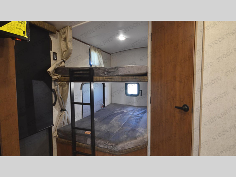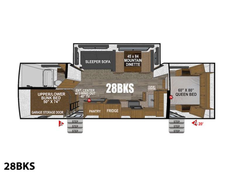 How does double-size bunks sound for your next camping trip? The kids are sure to love them, while you enjoy the queen bed in the front bedroom. There is a garage storage door that will be perfect for luggage, lawn chairs, and coolers, plus there is plenty of storage inside as well. The chef of your group will love cooking in the kitchen with its flip-up counter, three burner cooktop, and large pantry for dry goods. The large slide out in the main living area will provide space to let the dog rest on the floor, and your crew can get comfortable on the sleeper sofa or play a game at the mountain dinette.