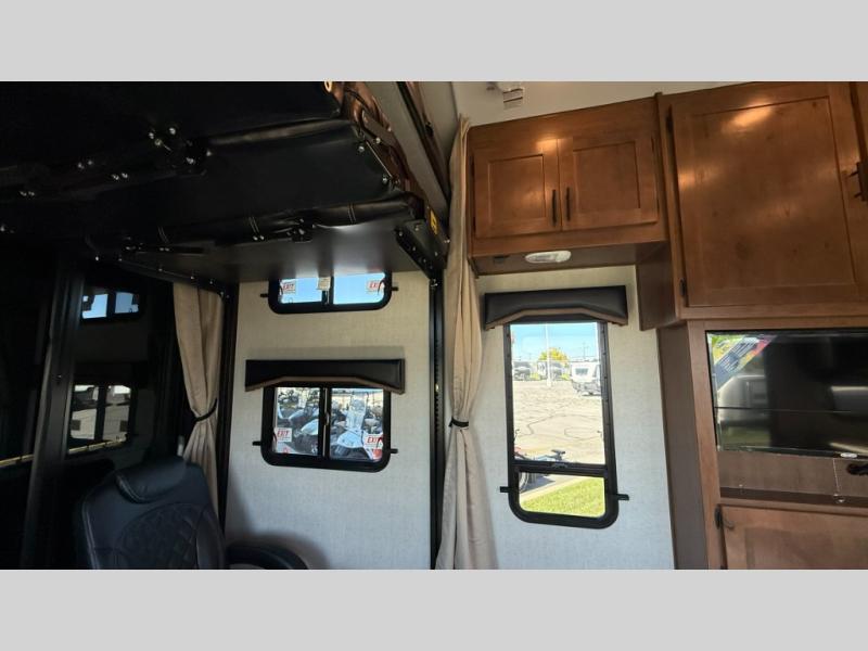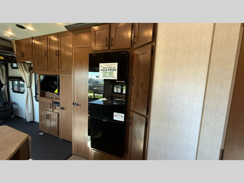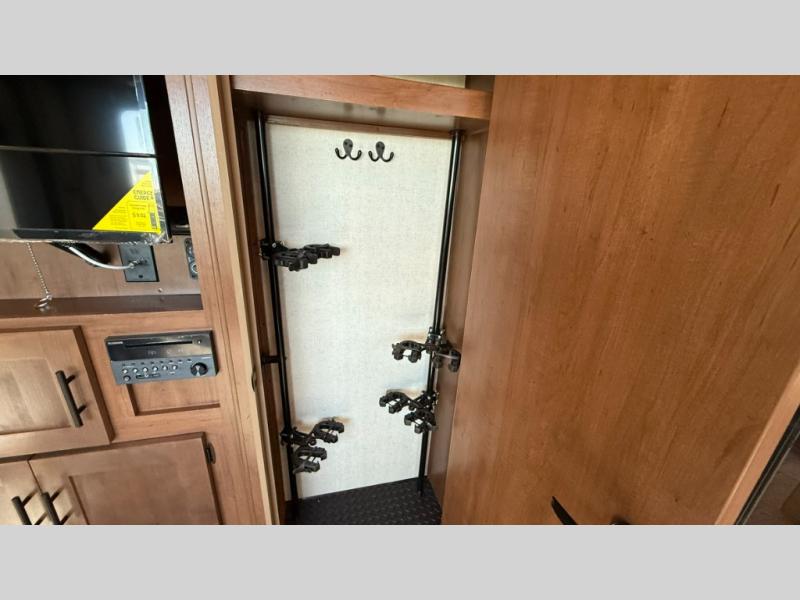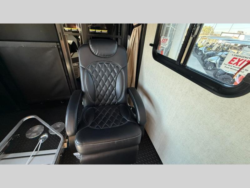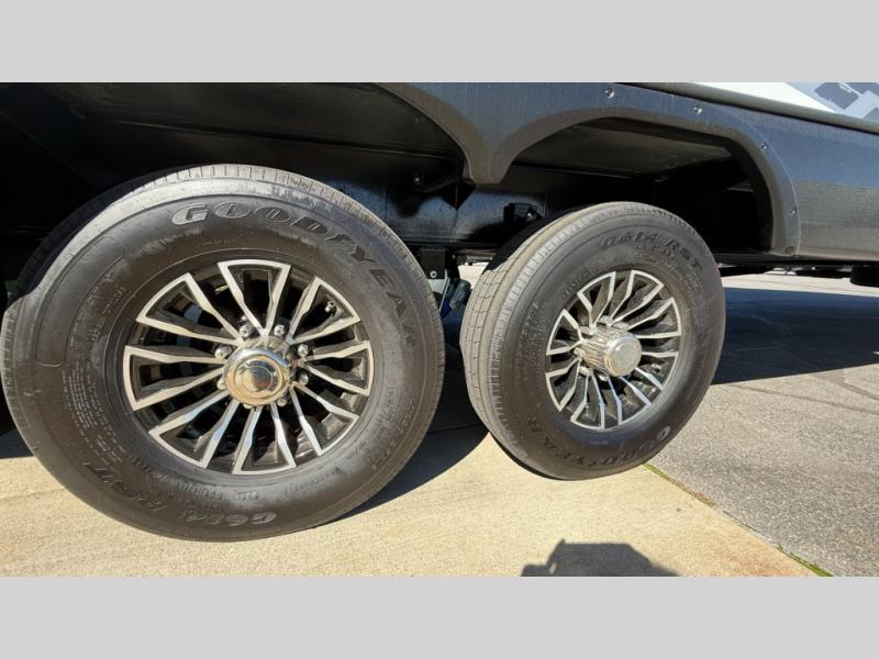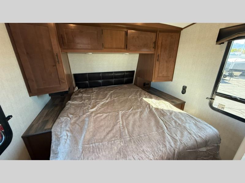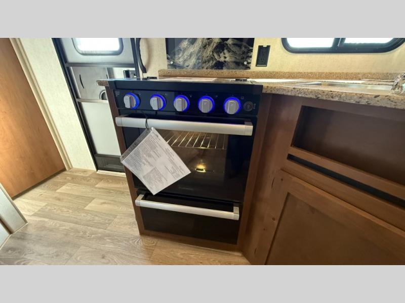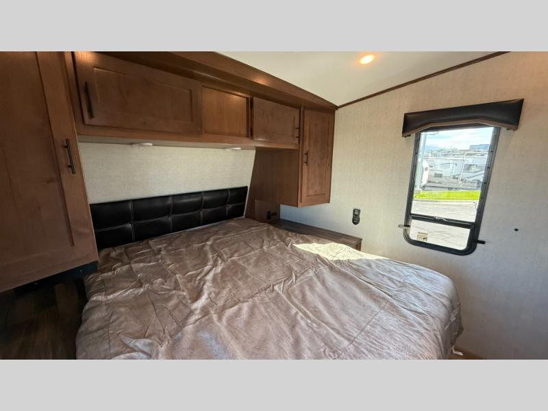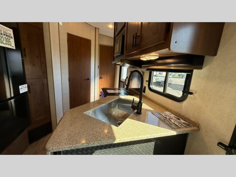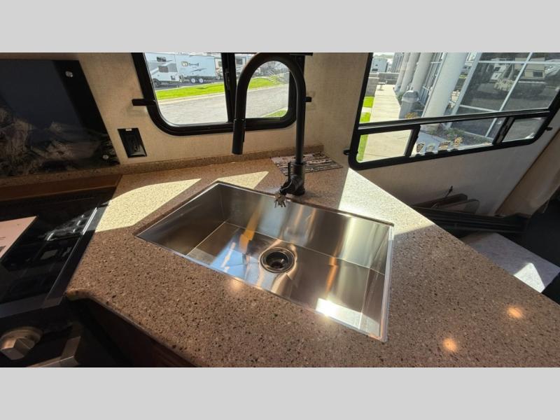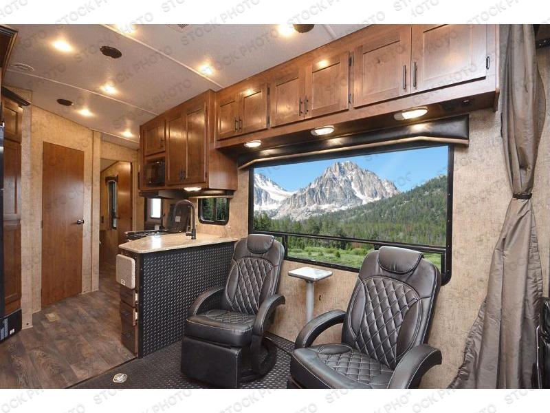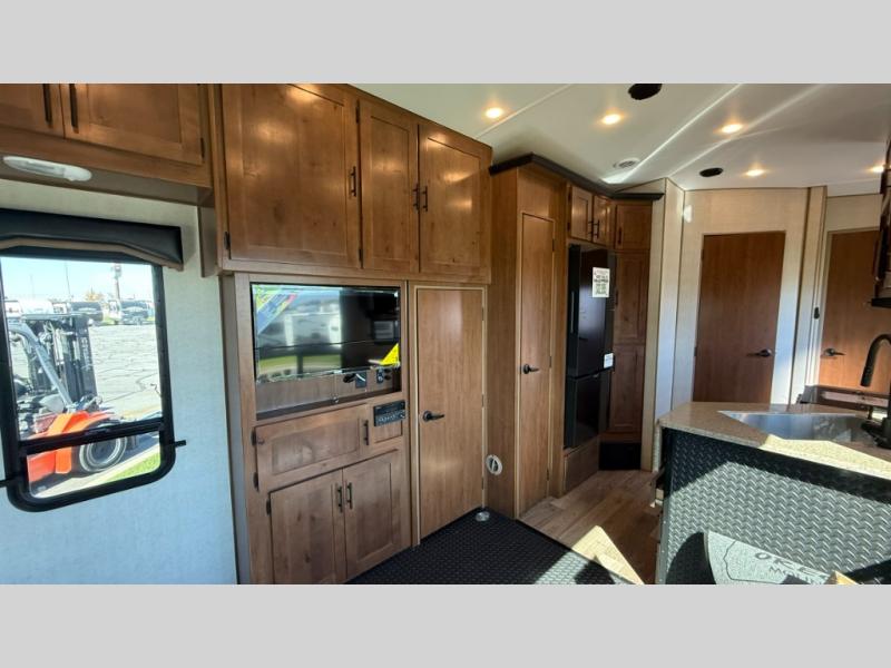 The kids will be begging you to go camping with this toy hauler! They can sleep on the loft queen bed in the 13' 4" garage area above dual opposing sofas with a table in between, and you can sleep comfortably in the front private bedroom with the queen bed. The bedroom also has an entrance into the dual entry bathroom which has a neo-angled shower with a skylight above for added natural lighting as you get ready. Keep everyone's bellies full with the fully equipped kitchen and entertained with the entertainment center that has a 32" swing out TV. Across from the entertainment center are two recliners to relax in each night too. The in-floor tool box makes life easier and the high pressure exterior spray washer is handy after trail riding through the mud!