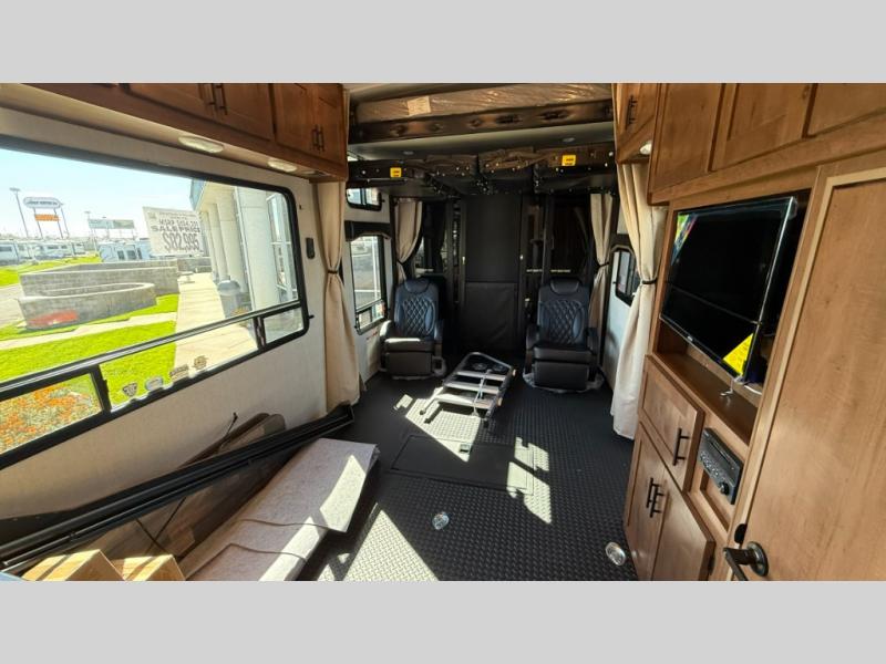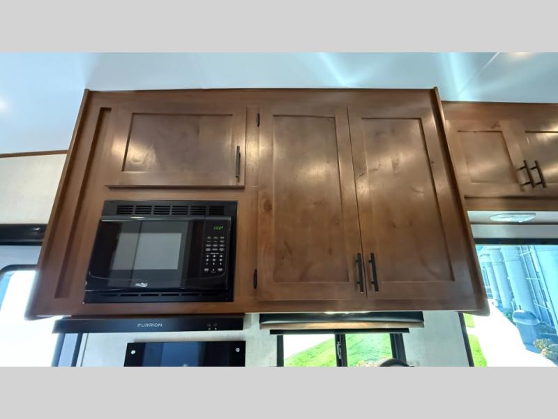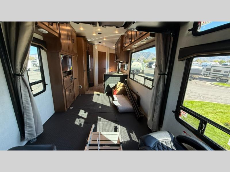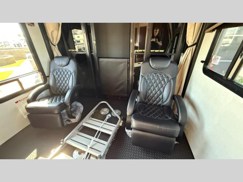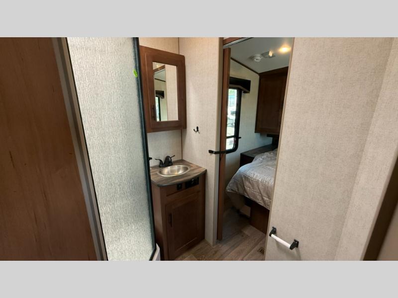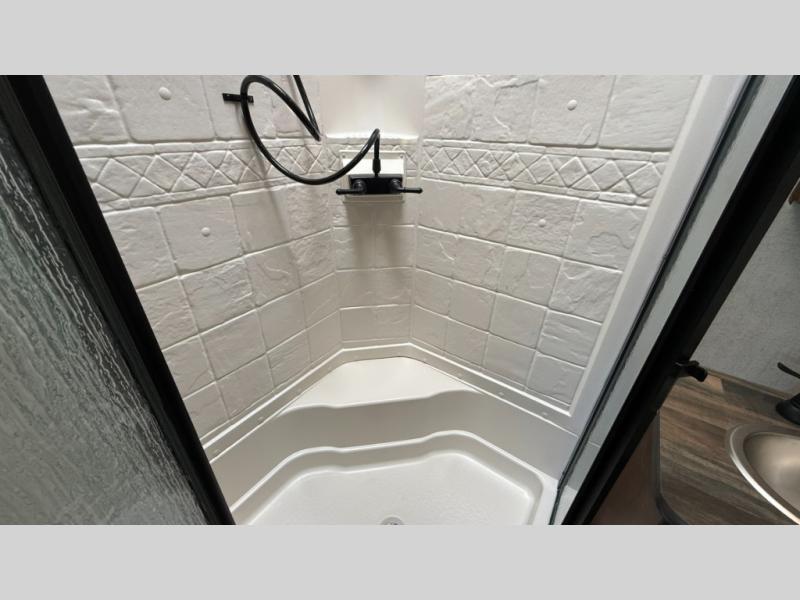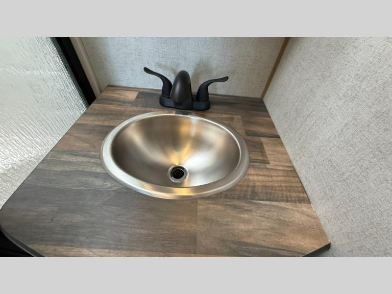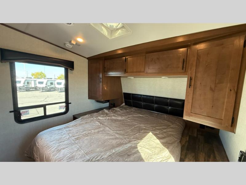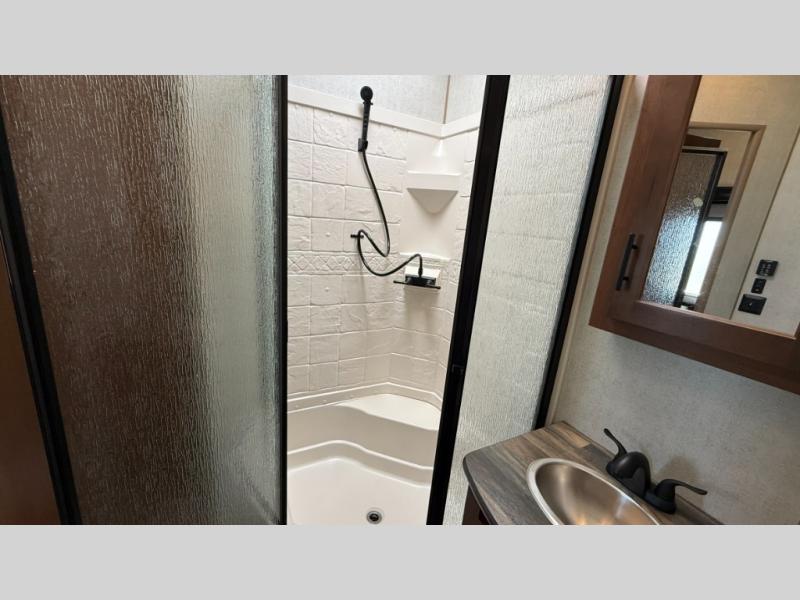 The kids will be begging you to go camping with this toy hauler! They can sleep on the loft queen bed in the 13' 4" garage area above dual opposing sofas with a table in between, and you can sleep comfortably in the front private bedroom with the queen bed. The bedroom also has an entrance into the dual entry bathroom which has a neo-angled shower with a skylight above for added natural lighting as you get ready. Keep everyone's bellies full with the fully equipped kitchen and entertained with the entertainment center that has a 32" swing out TV. Across from the entertainment center are two recliners to relax in each night too. The in-floor tool box makes life easier and the high pressure exterior spray washer is handy after trail riding through the mud!