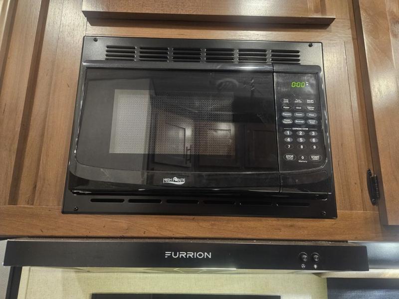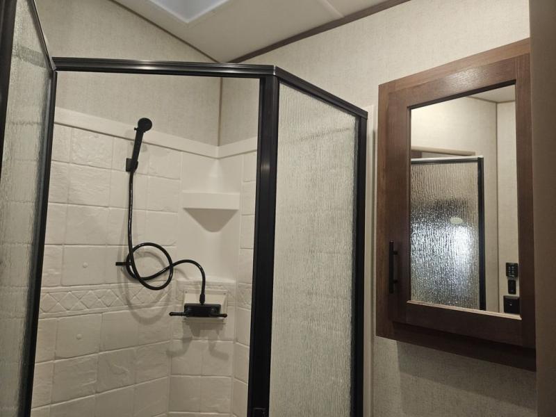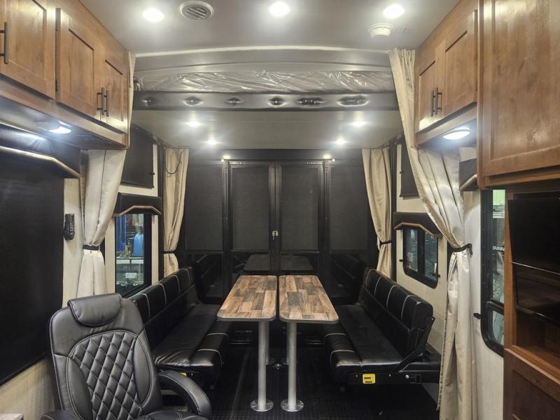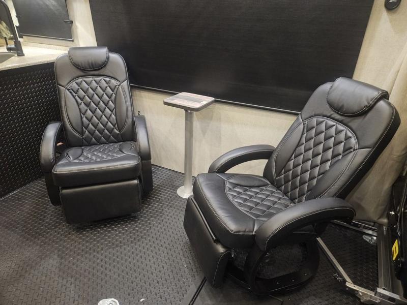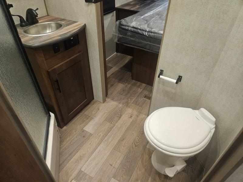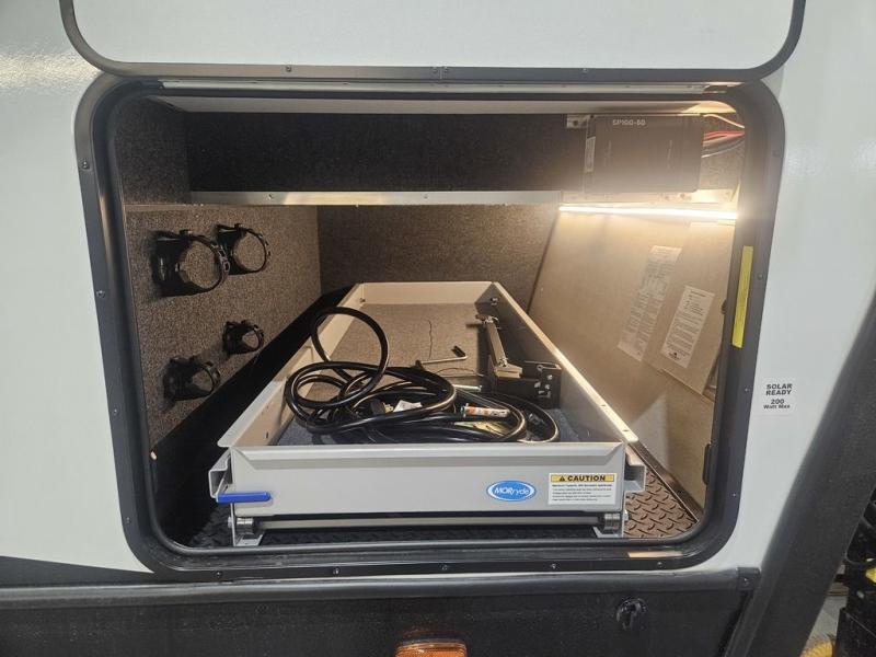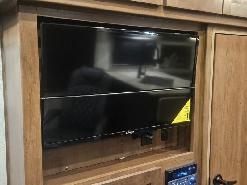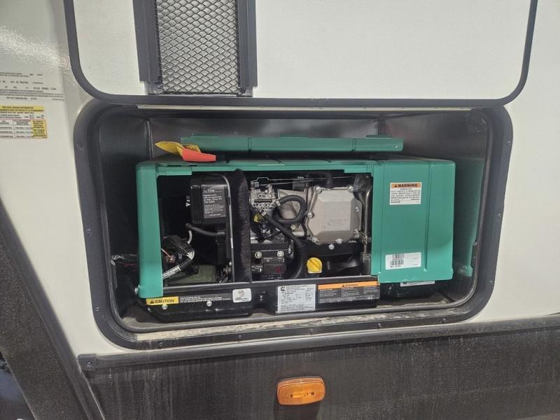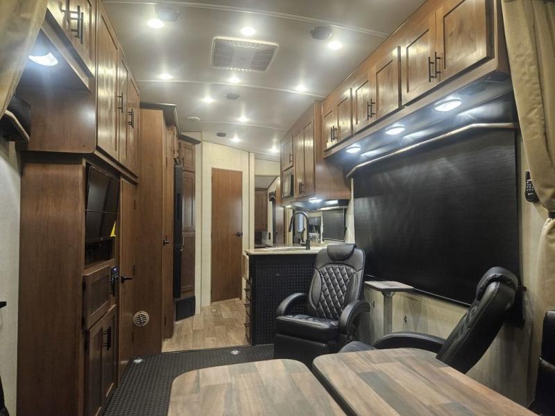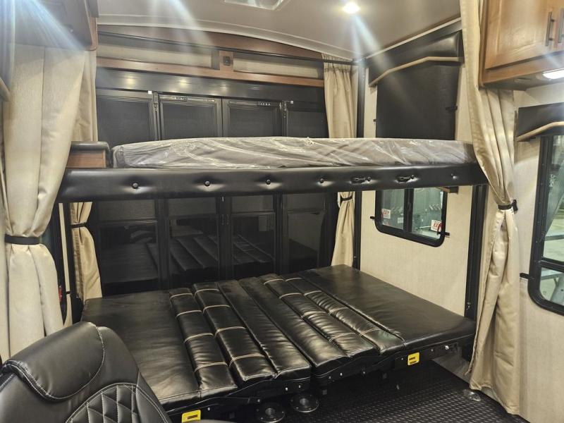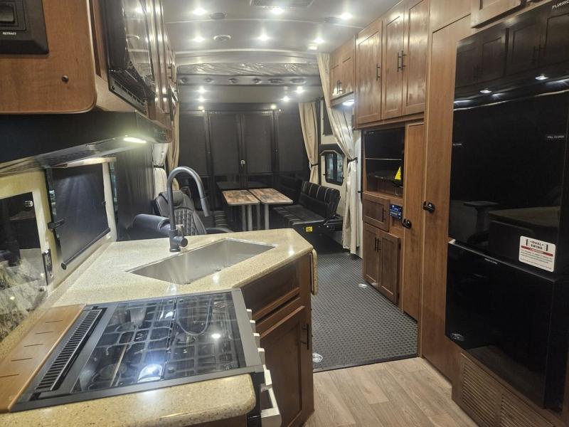 The kids will be begging you to go camping with this toy hauler! They can sleep on the loft queen bed in the 13' 4" garage area above dual opposing sofas with a table in between, and you can sleep comfortably in the front private bedroom with the queen bed. The bedroom also has an entrance into the dual entry bathroom which has a neo-angled shower with a skylight above for added natural lighting as you get ready. Keep everyone's bellies full with the fully equipped kitchen and entertained with the entertainment center that has a 32" swing out TV. Across from the entertainment center are two recliners to relax in each night too. The in-floor tool box makes life easier and the high pressure exterior spray washer is handy after trail riding through the mud!