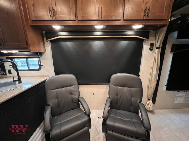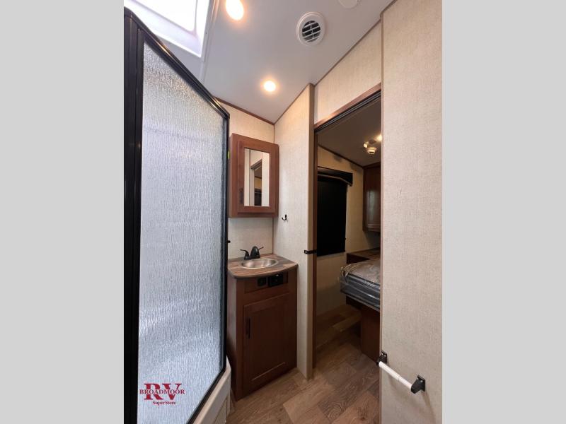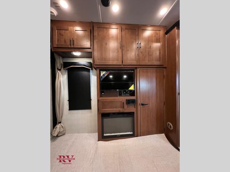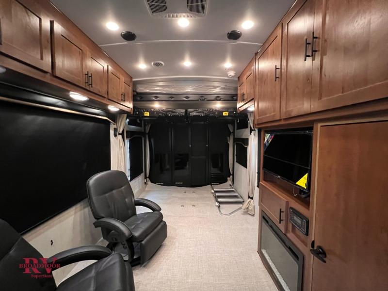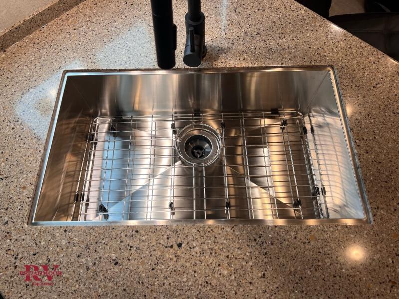 The kids will be begging you to go camping with this toy hauler! They can sleep on the loft queen bed in the 13' 4" garage area above dual opposing sofas with a table in between, and you can sleep comfortably in the front private bedroom with the queen bed. The bedroom also has an entrance into the dual entry bathroom which has a neo-angled shower with a skylight above for added natural lighting as you get ready. Keep everyone's bellies full with the fully equipped kitchen and entertained with the entertainment center that has a 32" swing out TV. Across from the entertainment center are two recliners to relax in each night too. The in-floor tool box makes life easier and the high pressure exterior spray washer is handy after trail riding through the mud!