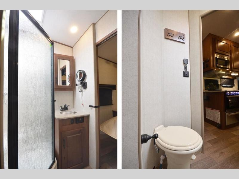 The whole family will have a fun time camping in this toy hauler! With a 10' 10" garage area, you can bring along your two seater side by side, kayaks or other toys for fun while at the campground. There is a loft queen bed for two to sleep at night with opposing sofas with a table in between to enjoy your meals prepared in the fully equipped kitchen. Clean the dirt out of your hair with the neo-angled shower in the dual entry bathroom then head directly into the front private bedroom and change into the clothes stored in the wardrobes on either side of the queen bed.