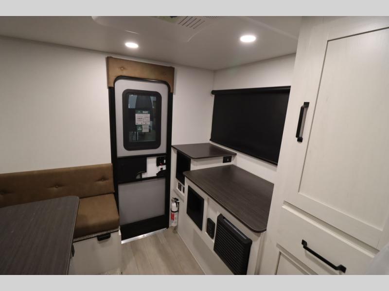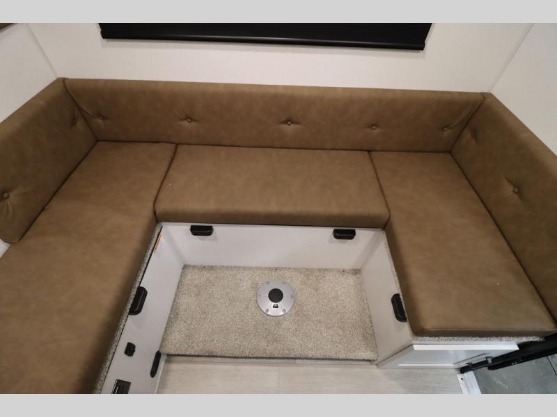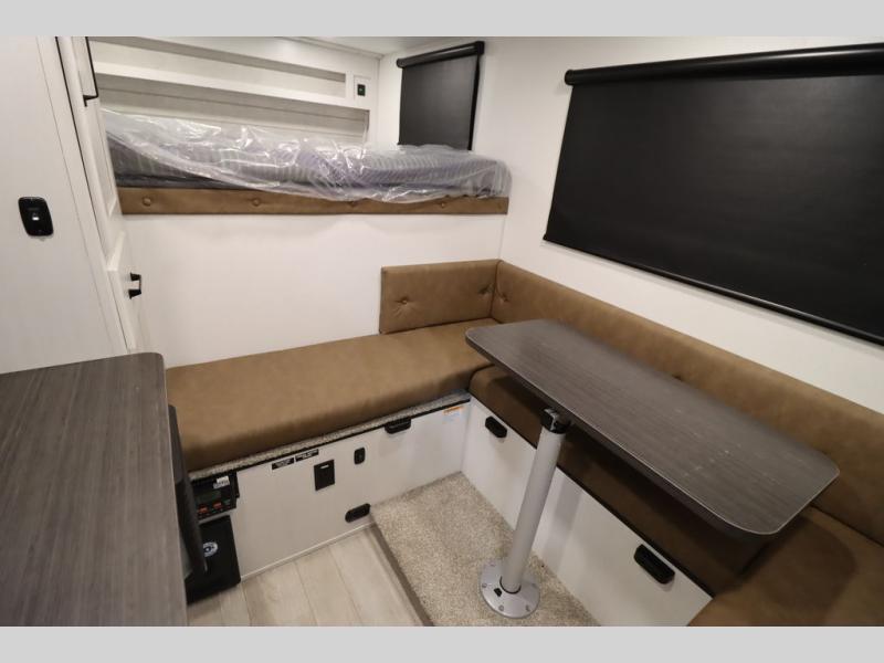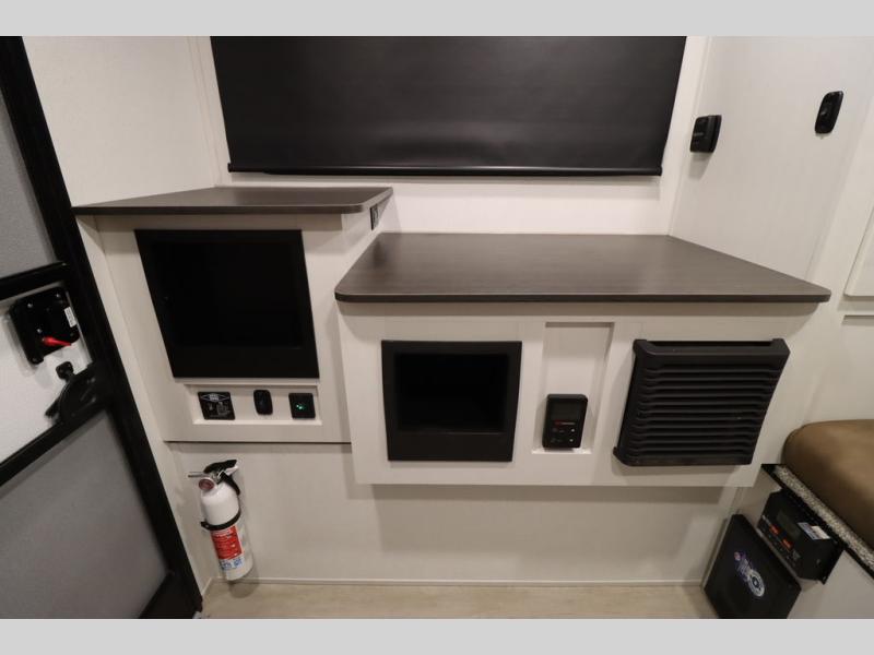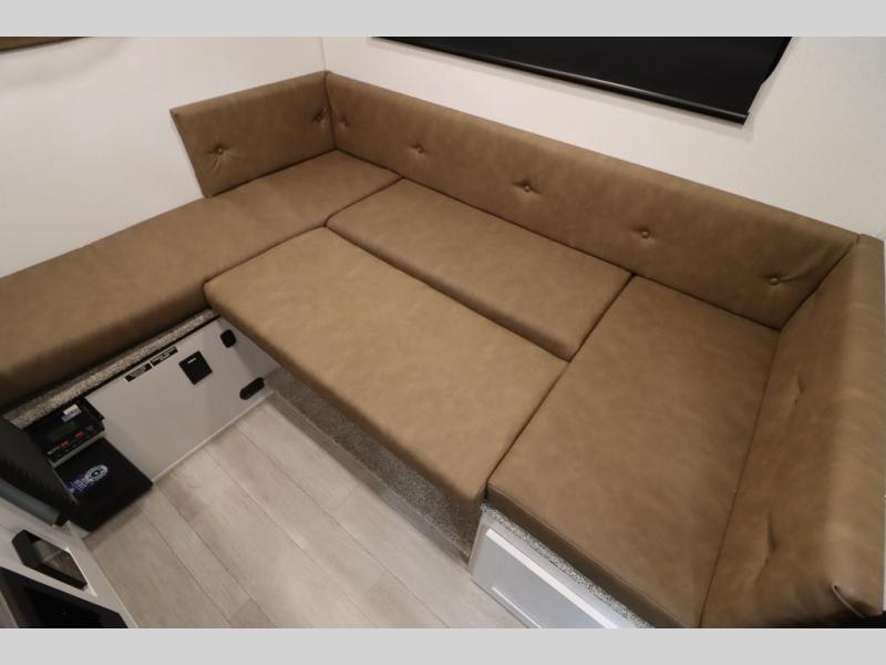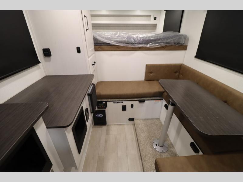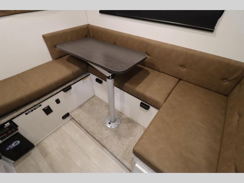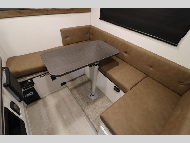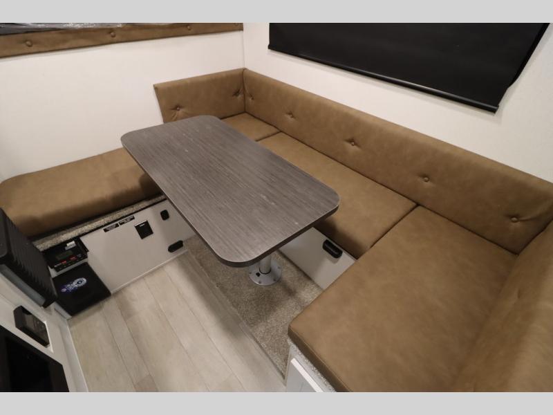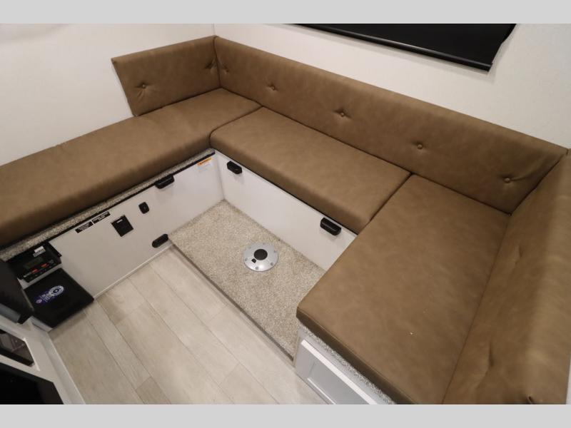 This Overland Vehicle Equipped is perfect for all your outdoor adventures! Enjoy a good night's rest on the front queen bed with a 5" mattress. A Maxx air vent keeps the air circulating and an optional A/C can be added for more comfort. The U-shaped dinette is great for enjoying meals and even has a storage area for a toilet, and you can add the cooler option to keep food fresh.