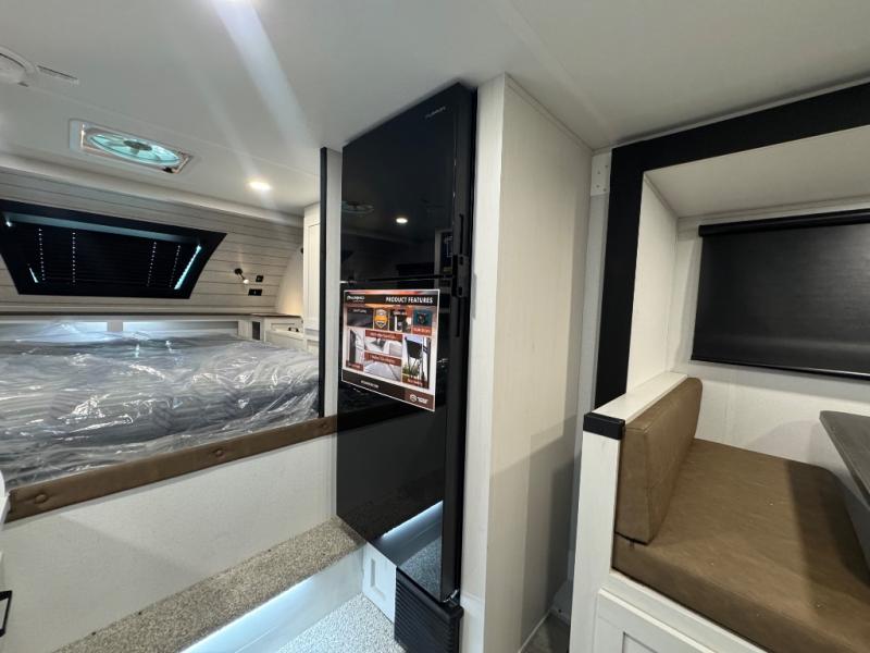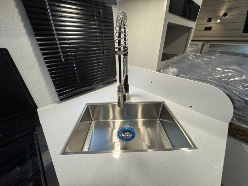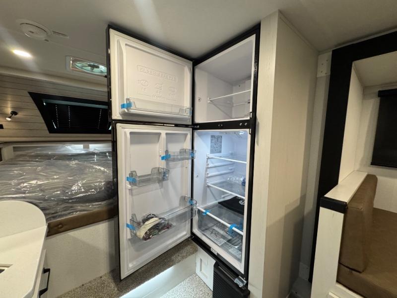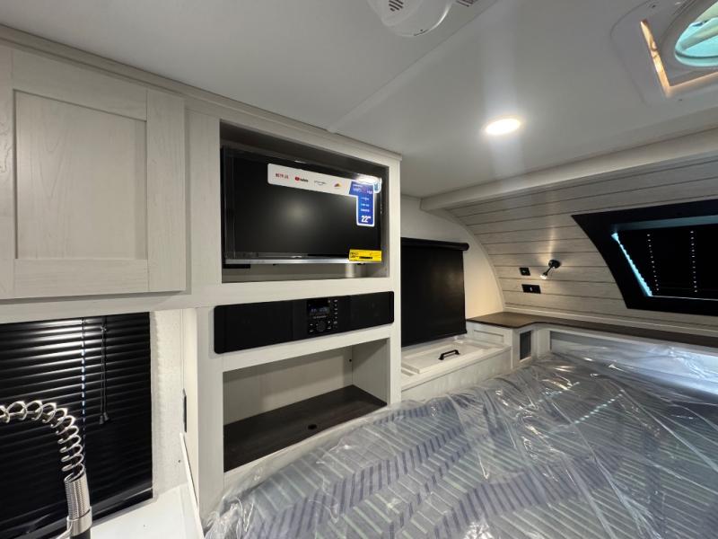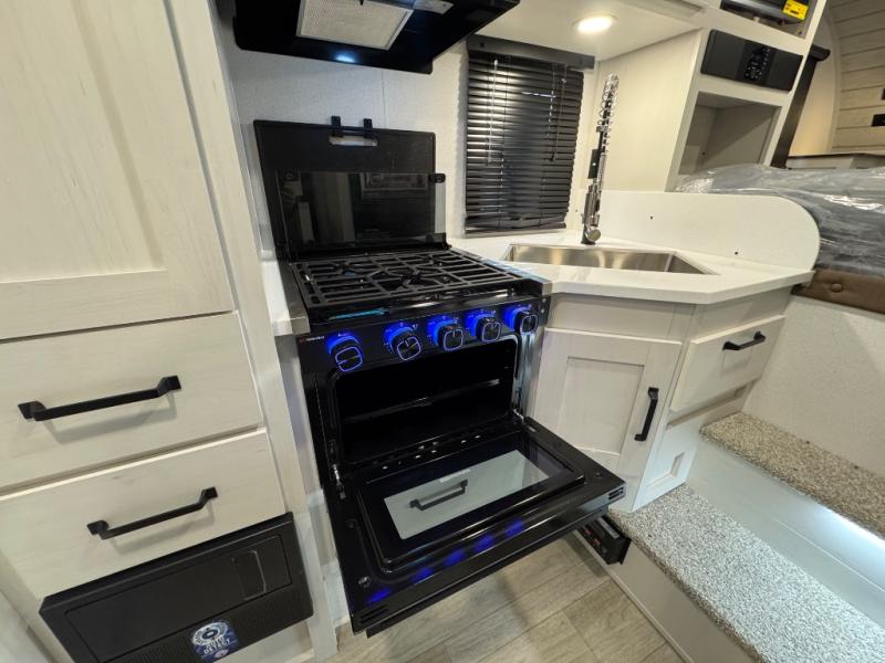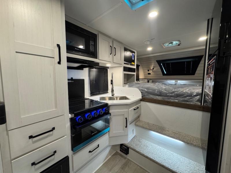 Each Backpack Edition truck camper by Palomino is constructed with high-density block foam insulation, an alpha super flex membrane roof, and Azdel substrate for added durability. You will also love the white or grey hi-gloss exterior fiberglass that is eye-catching and easy to keep clean. Inside, you'll find solid surface countertops, white cabinets, an undermount sink, and more comforts. The 400-watts of solar power and 100 Amp lithium battery will keep you powered up, and the electric jacks will have you set up at camp in no-time!