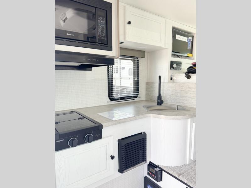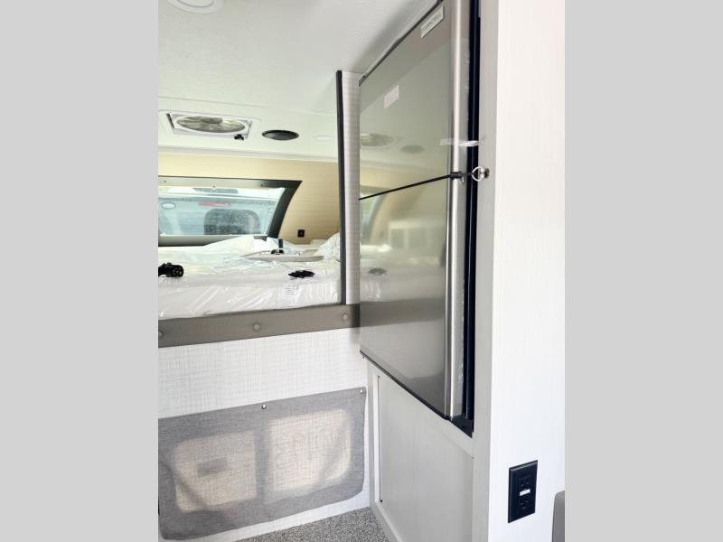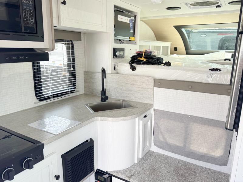 You will have everything you need for a comfortable trip in this hard side truck camper! There is a front queen bed to lay your head on at night with storage next to it and an entertainment center if you choose to add the optional TV. Above the two burner cooktop and sink are overhead cabinets to store your cooking essentials. The 60" x 22" jackknife sofa is not only a comfortable place to enjoy your meals, but also for transforming into an extra sleeping space, plus it has overhead cabinets to store your games. You even have a wet bath to freshen up in each morning!