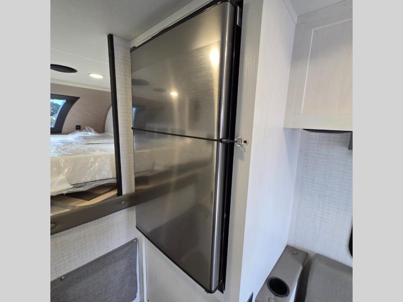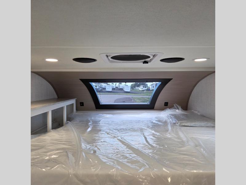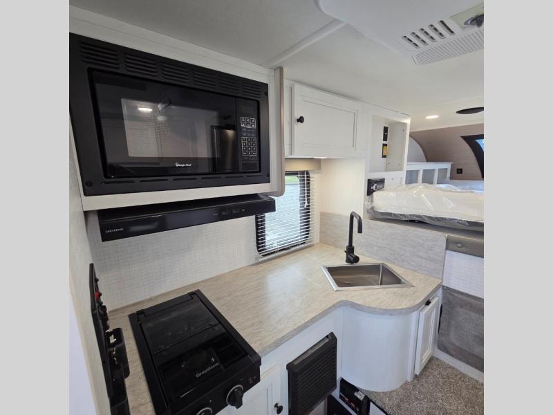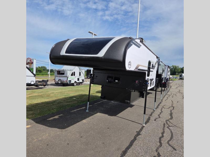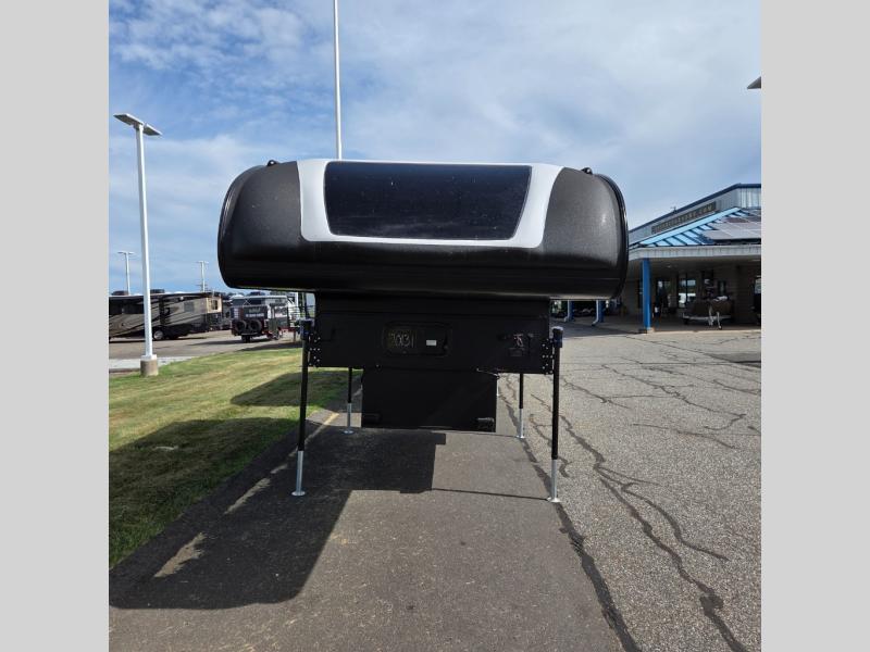 You will have everything you need for a comfortable trip in this hard side truck camper! There is a front queen bed to lay your head on at night with storage next to it and an entertainment center if you choose to add the optional TV. Above the two burner cooktop and sink are overhead cabinets to store your cooking essentials. The 60" x 22" jackknife sofa is not only a comfortable place to enjoy your meals, but also for transforming into an extra sleeping space, plus it has overhead cabinets to store your games. You even have a wet bath to freshen up in each morning!