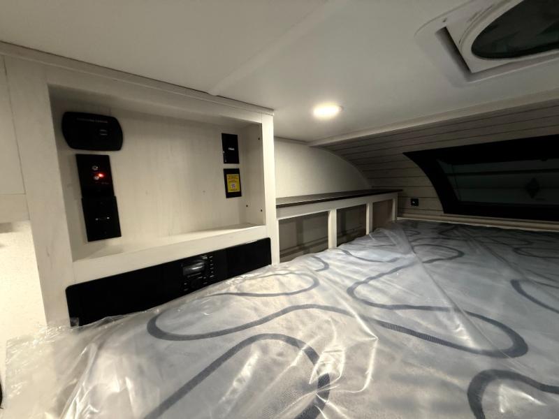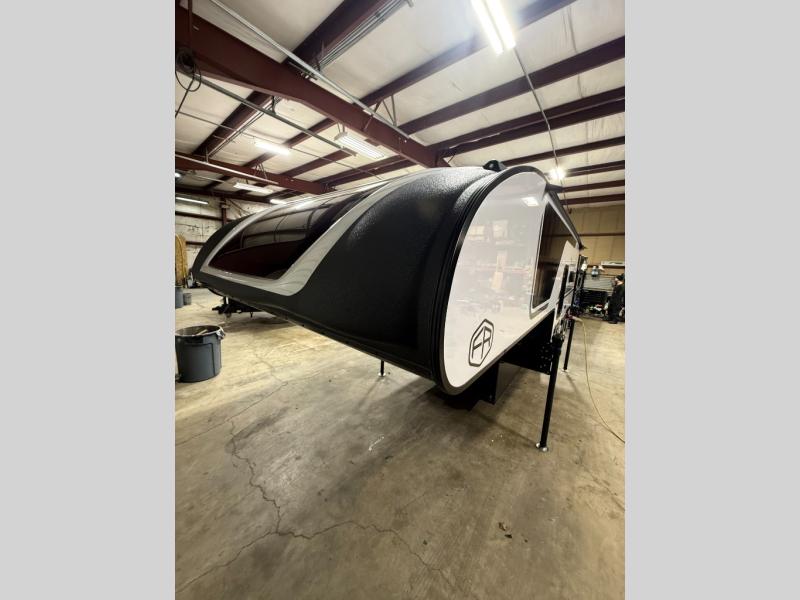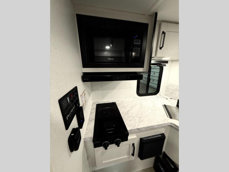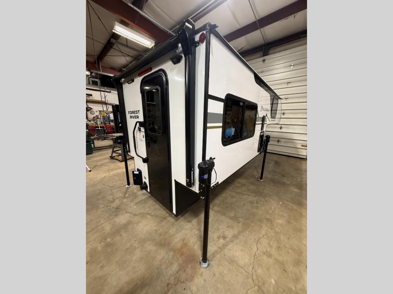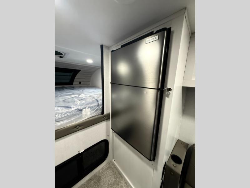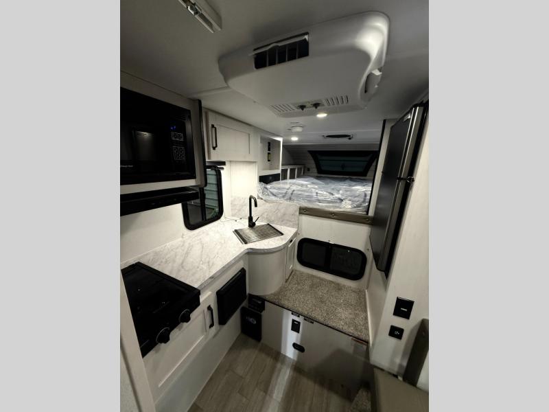 You will have everything you need for a comfortable trip in this hard side truck camper! There is a front queen bed to lay your head on at night with storage next to it and an entertainment center if you choose to add the optional TV. Above the two burner cooktop and sink are overhead cabinets to store your cooking essentials. The 60" x 22" jackknife sofa is not only a comfortable place to enjoy your meals, but also for transforming into an extra sleeping space, plus it has overhead cabinets to store your games. You even have a wet bath to freshen up in each morning!