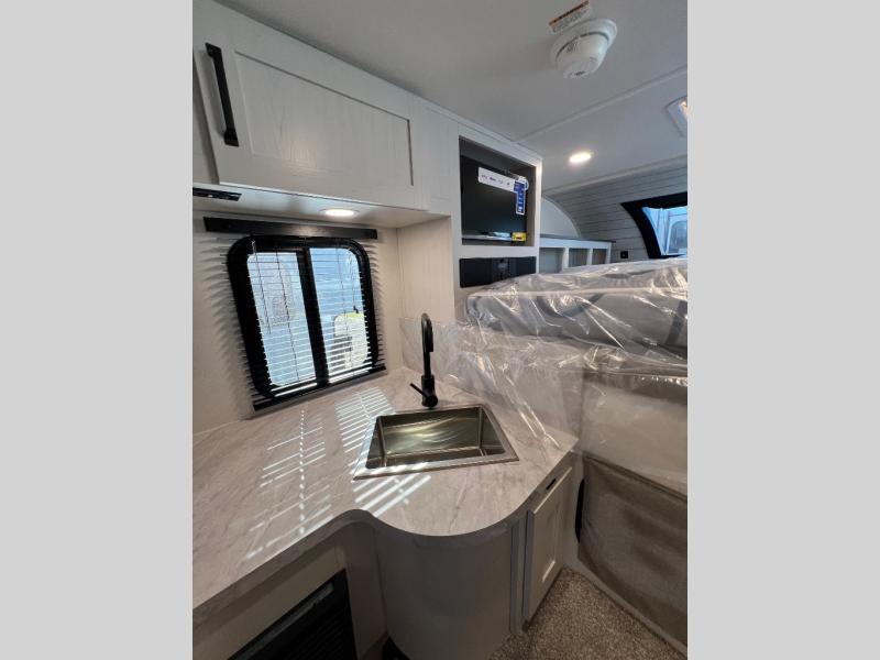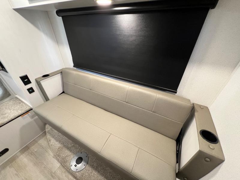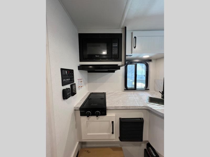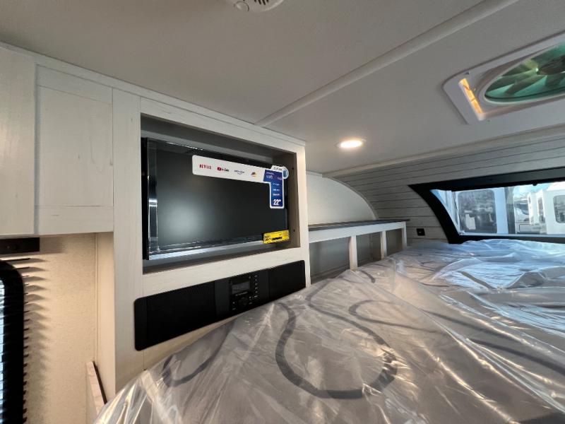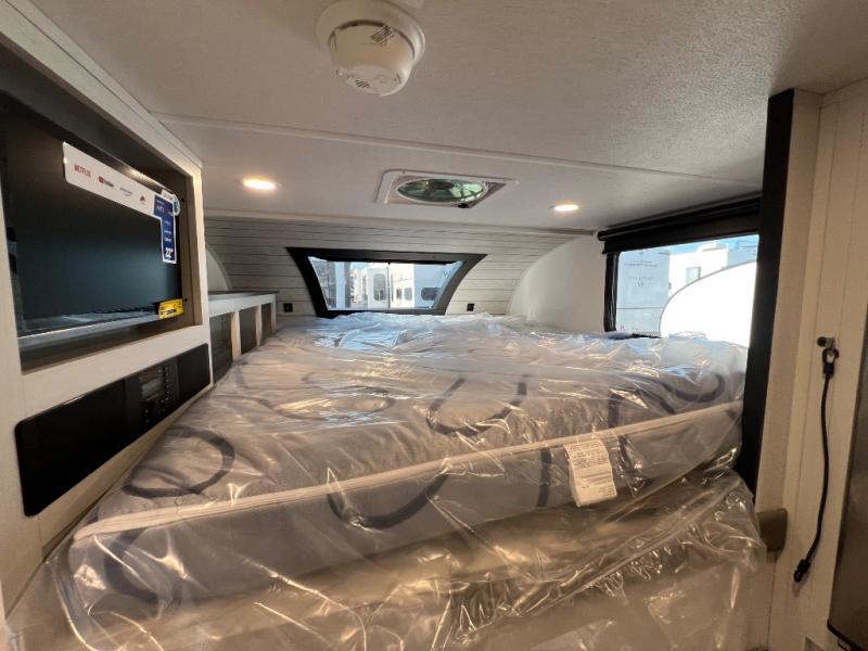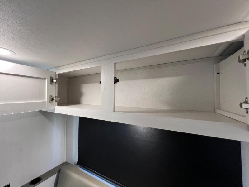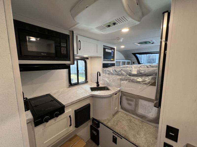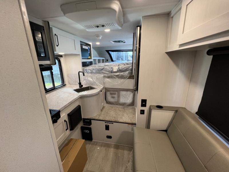 You will have everything you need for a comfortable trip in this hard side truck camper! There is a front queen bed to lay your head on at night with storage next to it and an entertainment center if you choose to add the optional TV. Above the two burner cooktop and sink are overhead cabinets to store your cooking essentials. The 60" x 22" jackknife sofa is not only a comfortable place to enjoy your meals, but also for transforming into an extra sleeping space, plus it has overhead cabinets to store your games. You even have a wet bath to freshen up in each morning!