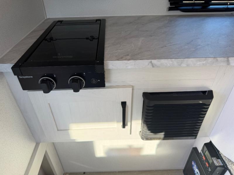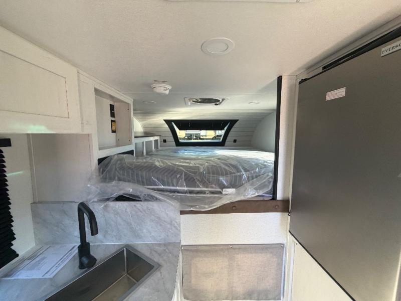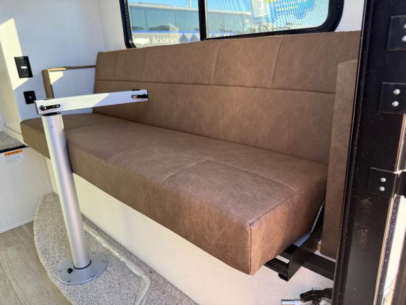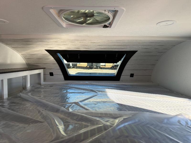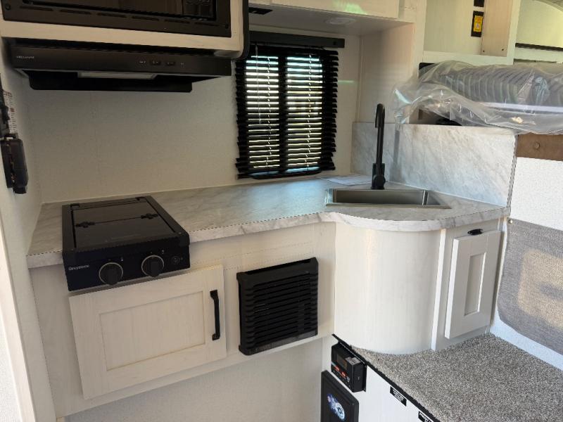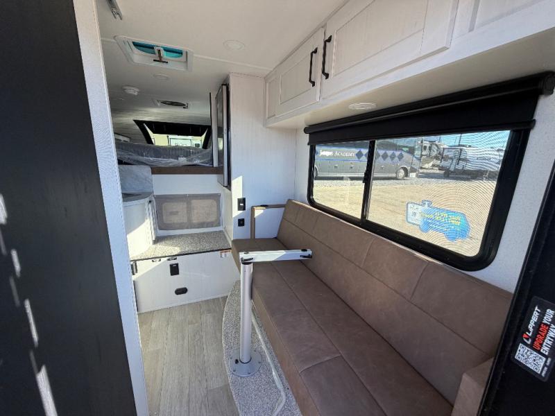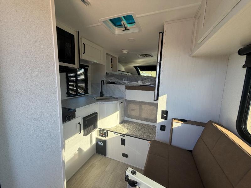 You will have everything you need for a comfortable trip in this hard side truck camper! There is a front queen bed to lay your head on at night with storage next to it and an entertainment center if you choose to add the optional TV. Above the two burner cooktop and sink are overhead cabinets to store your cooking essentials. The 60" x 22" jackknife sofa is not only a comfortable place to enjoy your meals, but also for transforming into an extra sleeping space, plus it has overhead cabinets to store your games. You even have a wet bath to freshen up in each morning!