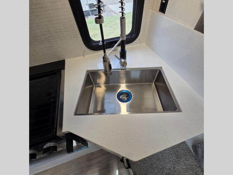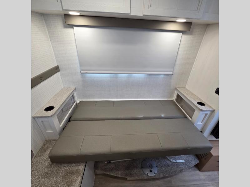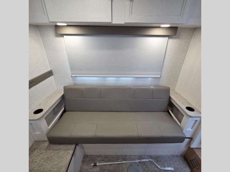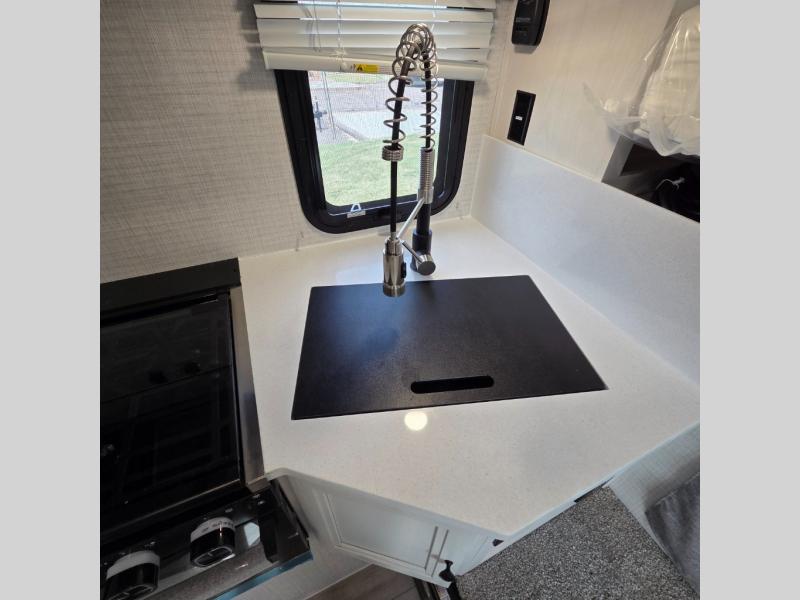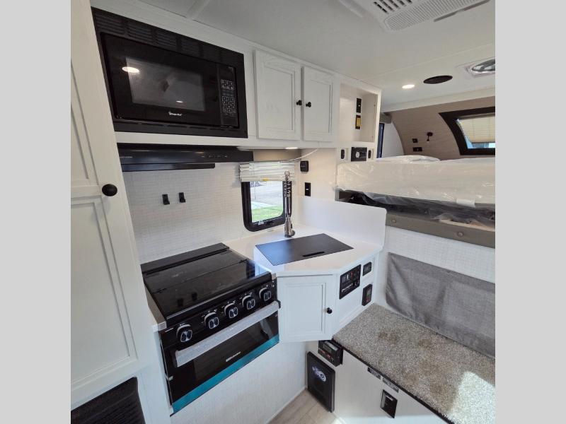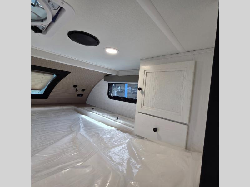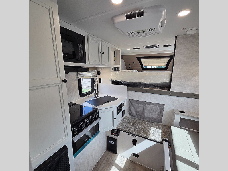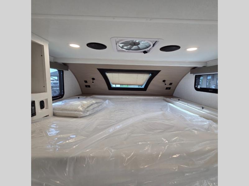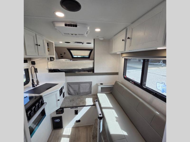 Pick your favorite fishing spot and load up this hard side truck camper! You can fry your catch of the day on the cooktop and enjoy a cold beverage from the refrigerator while you cook it. The 60" jackknife sofa offers a comfortable place for an afternoon nap or for an extra guest to sleep at night while you sleep on the front queen bed which has a wrap around nightstand, storage chests on either side, and a closet to keep your clothes wrinkle-free. If you're needing more sleeping space, you might consider adding the optional drop-down bunk above the sofa!