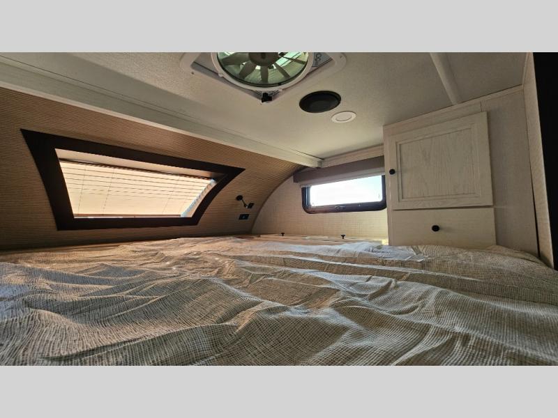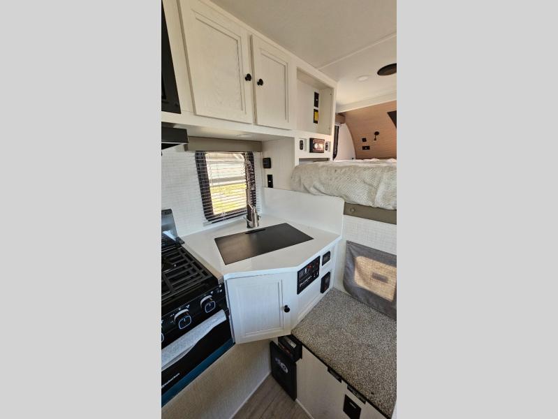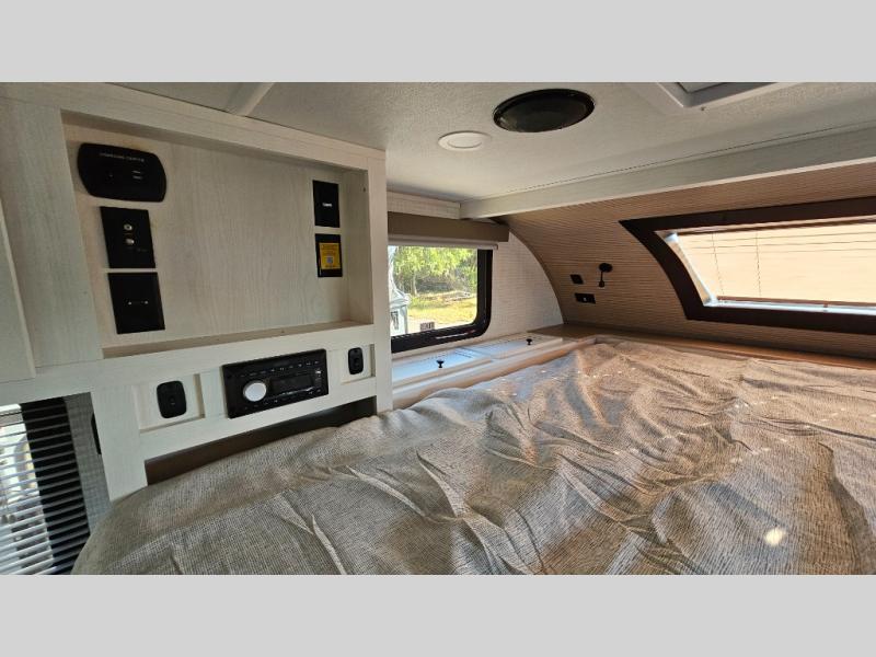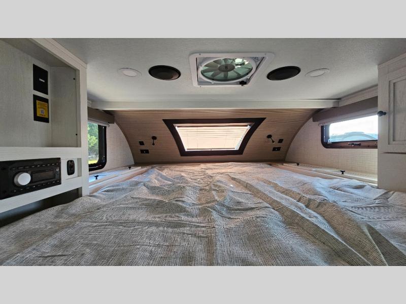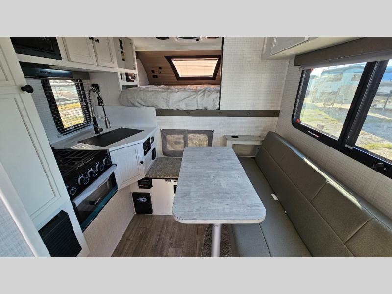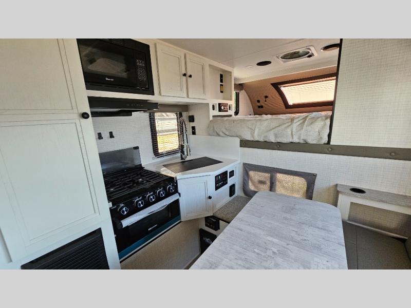 Pick your favorite fishing spot and load up this hard side truck camper! You can fry your catch of the day on the cooktop and enjoy a cold beverage from the refrigerator while you cook it. The 60" jackknife sofa offers a comfortable place for an afternoon nap or for an extra guest to sleep at night while you sleep on the front queen bed which has a wrap around nightstand, storage chests on either side, and a closet to keep your clothes wrinkle-free. If you're needing more sleeping space, you might consider adding the optional Euro bunk above the sofa!