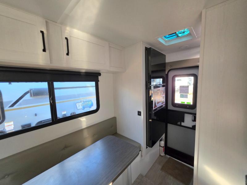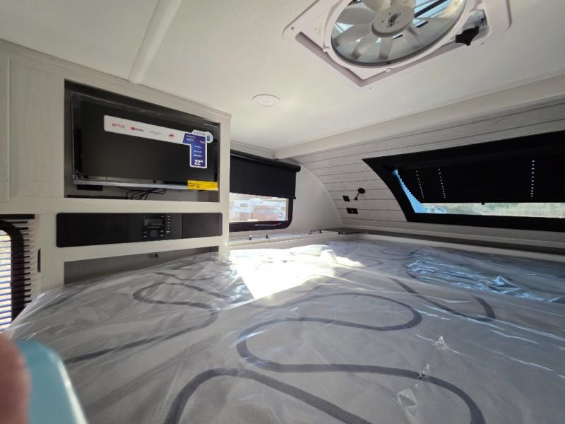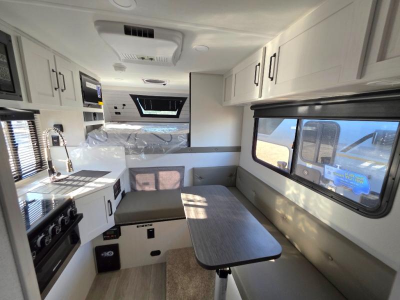 Pick your favorite fishing spot and load up this hard side truck camper! You can fry your catch of the day on the cooktop and enjoy a cold beverage from the refrigerator while you cook it. The 60" jackknife sofa offers a comfortable place for an afternoon nap or for an extra guest to sleep at night while you sleep on the front queen bed which has a wrap around nightstand, storage chests on either side, and a closet to keep your clothes wrinkle-free. If you're needing more sleeping space, you might consider adding the optional Euro bunk above the sofa!