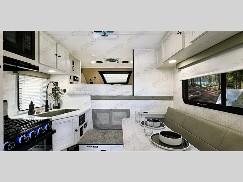 Pick your favorite fishing spot and load up this hard side truck camper! You can fry your catch of the day on the cooktop and enjoy a cold beverage from the refrigerator while you cook it. The 60" jackknife sofa offers a comfortable place for an afternoon nap or for an extra guest to sleep at night while you sleep on the front queen bed which has a wrap around nightstand, storage chests on either side, and a closet to keep your clothes wrinkle-free. If you're needing more sleeping space, you might consider adding the optional Euro bunk above the sofa!