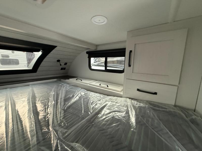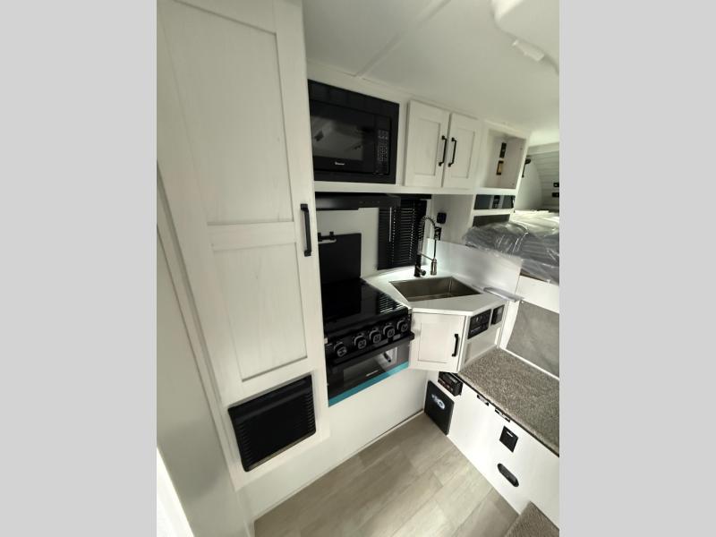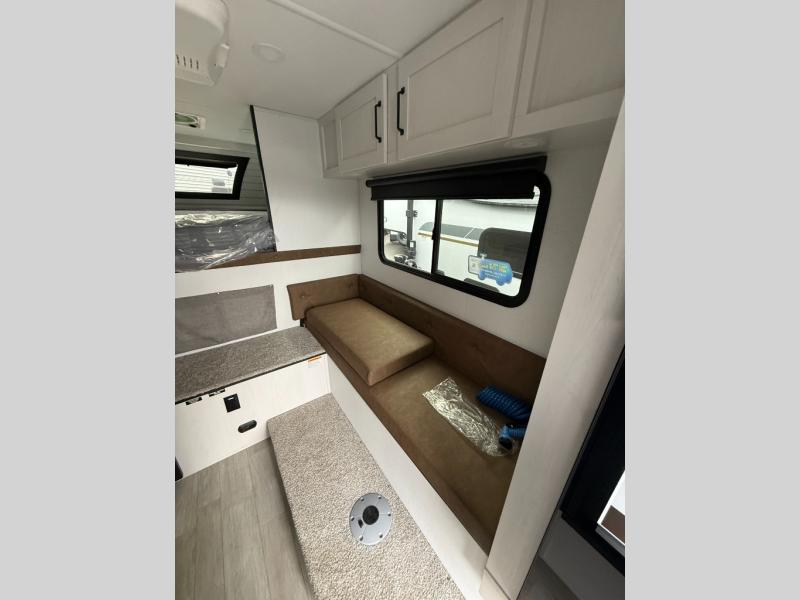 Pick your favorite fishing spot and load up this hard side truck camper! You can fry your catch of the day on the cooktop and enjoy a cold beverage from the refrigerator while you cook it. The 60" jackknife sofa offers a comfortable place for an afternoon nap or for an extra guest to sleep at night while you sleep on the front queen bed which has a wrap around nightstand, storage chests on either side, and a closet to keep your clothes wrinkle-free. If you're needing more sleeping space, you might consider adding the optional Euro bunk above the sofa!