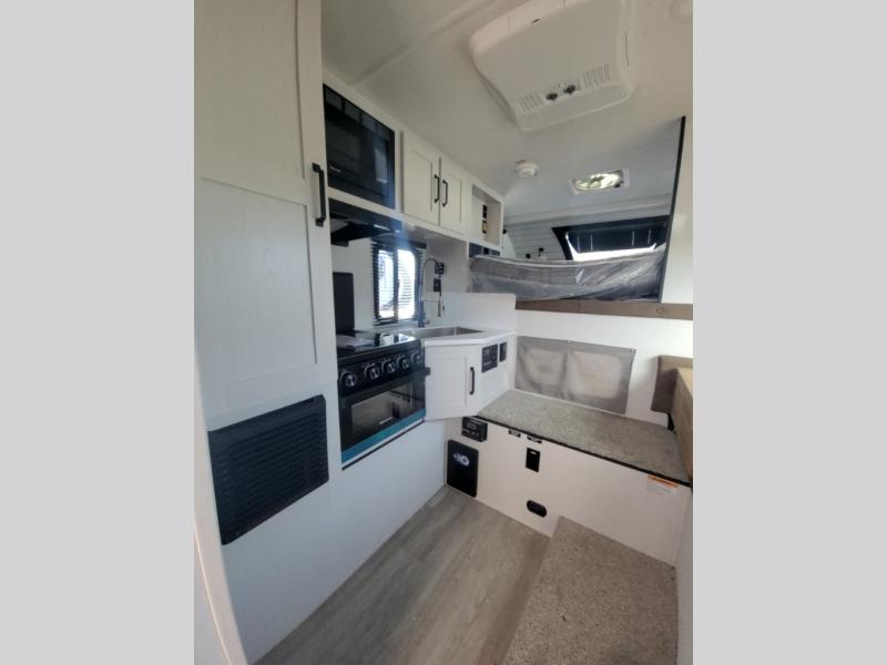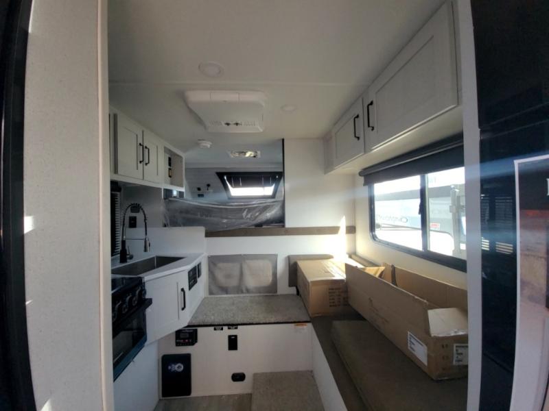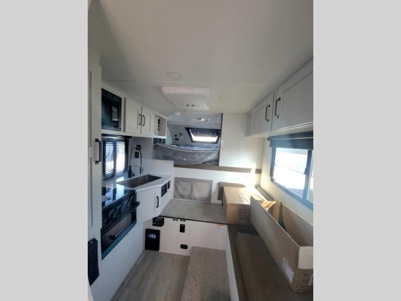 Pick your favorite fishing spot and load up this hard side truck camper! You can fry your catch of the day on the cooktop and enjoy a cold beverage from the refrigerator while you cook it. The 60" jackknife sofa offers a comfortable place for an afternoon nap or for an extra guest to sleep at night while you sleep on the front queen bed which has a wrap around nightstand, storage chests on either side, and a closet to keep your clothes wrinkle-free. If you're needing more sleeping space, you might consider adding the optional Euro bunk above the sofa!
