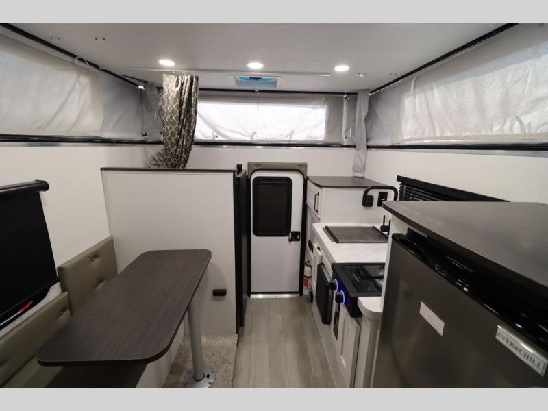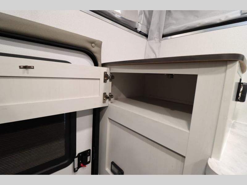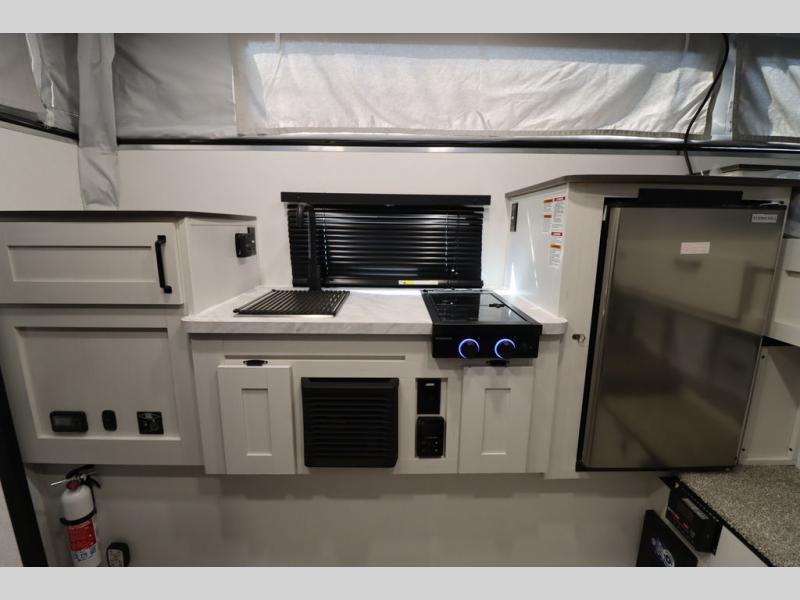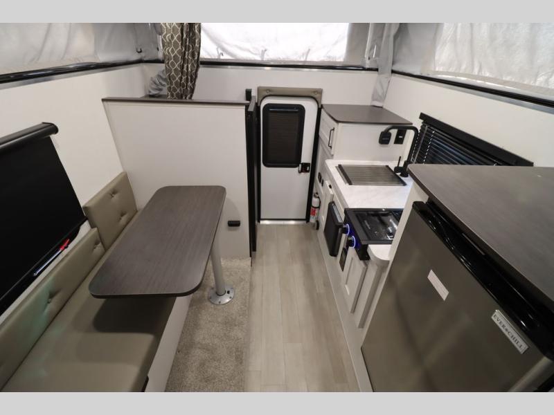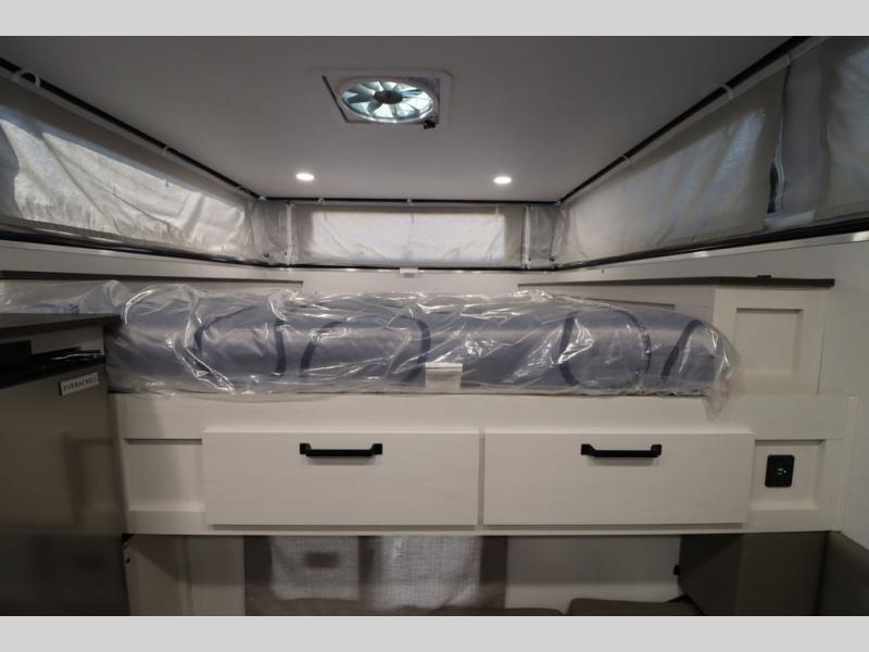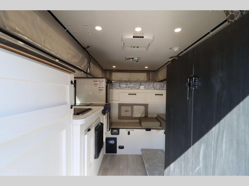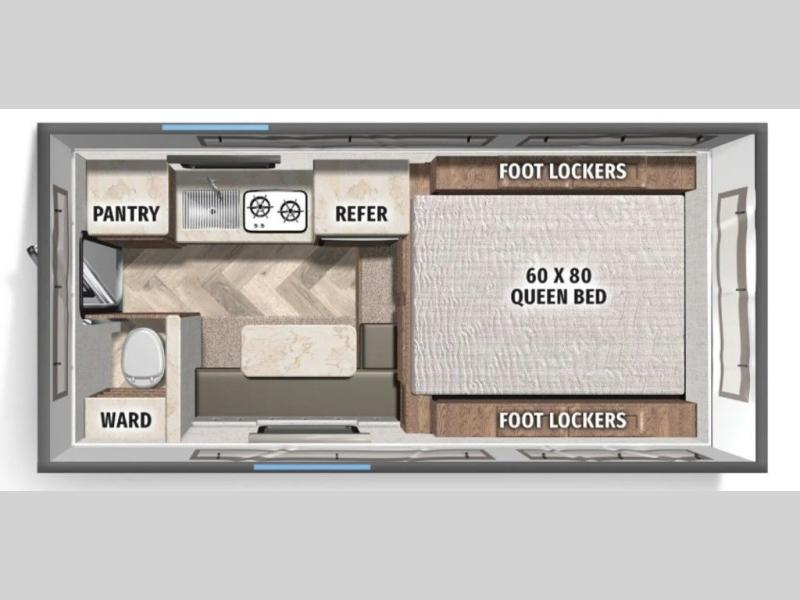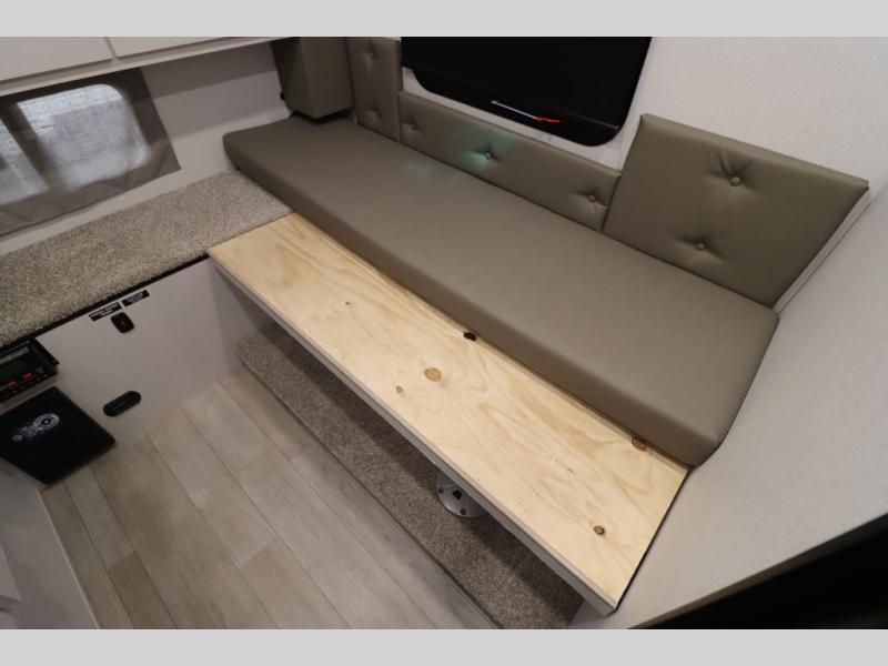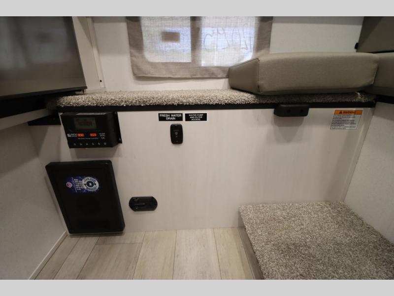 An electric roof lift with a remote will make setting up this soft side truck camper easy! Lay your head at night on the front queen bed with foot lockers and bedroom storage on either side of it to keep your items out of the way. Prepare your best meals with the two burner cooktop, store your canned goods in the pantry, and keep your beverages cold in the 12V refrigerator. The seating area comes with a table so you can enjoy your meals comfortably. There is also a wardrobe behind the private toilet for you to store your toiletries.