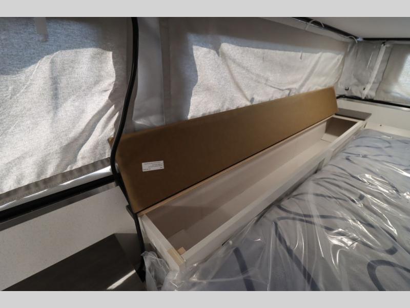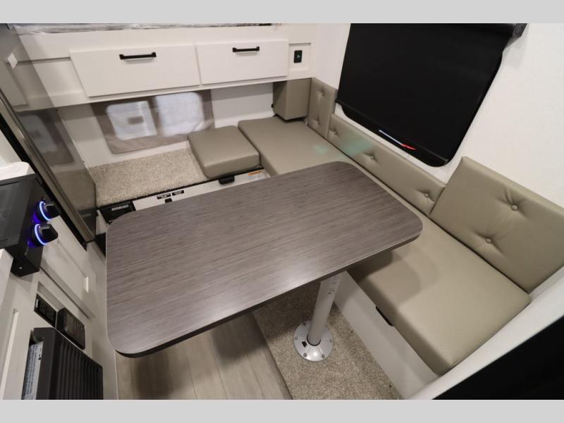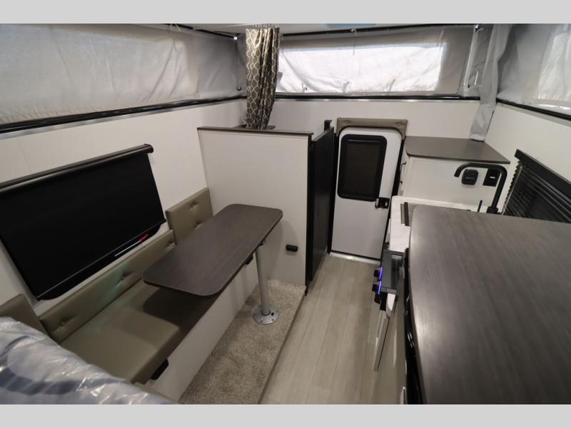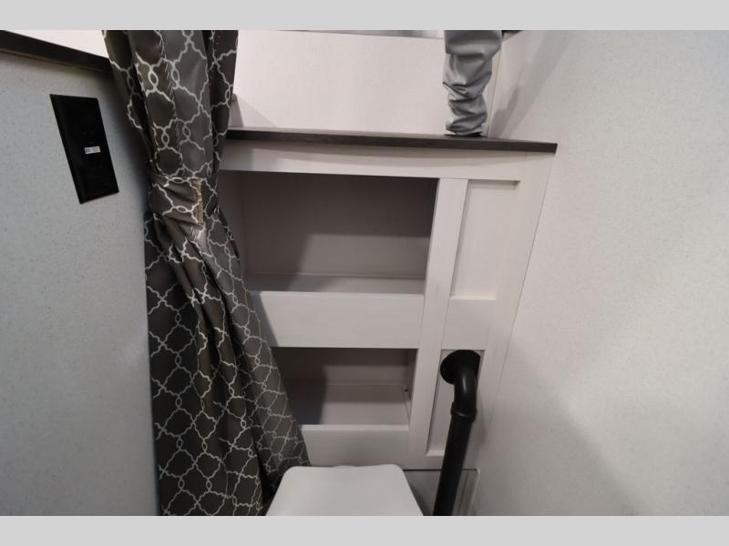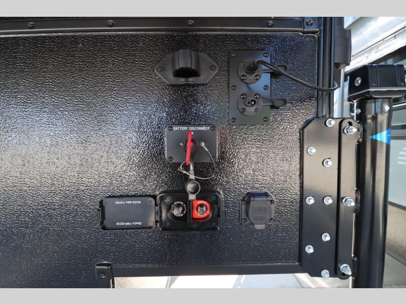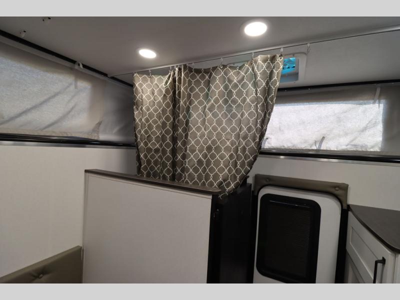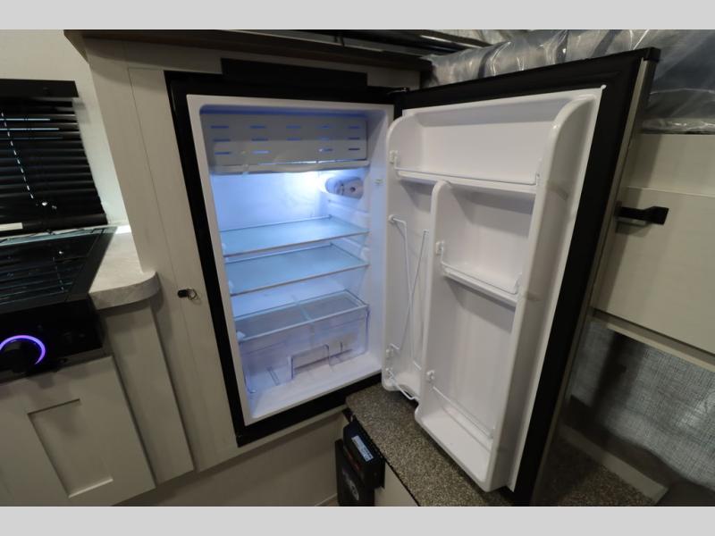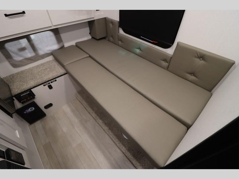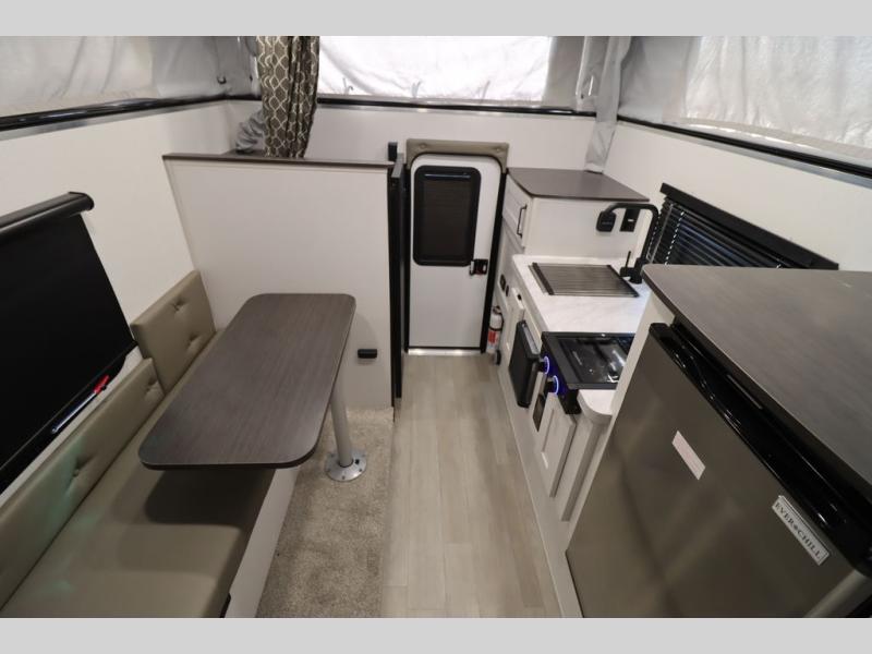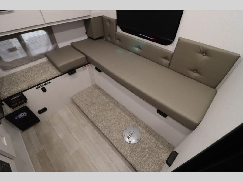 An electric roof lift with a remote will make setting up this soft side truck camper easy! Lay your head at night on the front queen bed with foot lockers and bedroom storage on either side of it to keep your items out of the way. Prepare your best meals with the two burner cooktop, store your canned goods in the pantry, and keep your beverages cold in the 12V refrigerator. The seating area comes with a table so you can enjoy your meals comfortably. There is also a wardrobe behind the private toilet for you to store your toiletries.