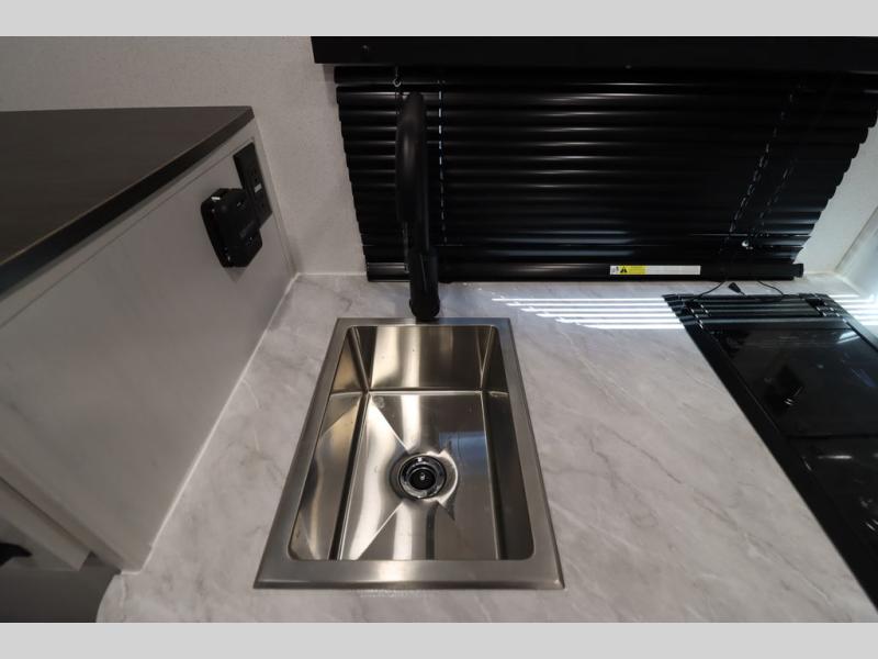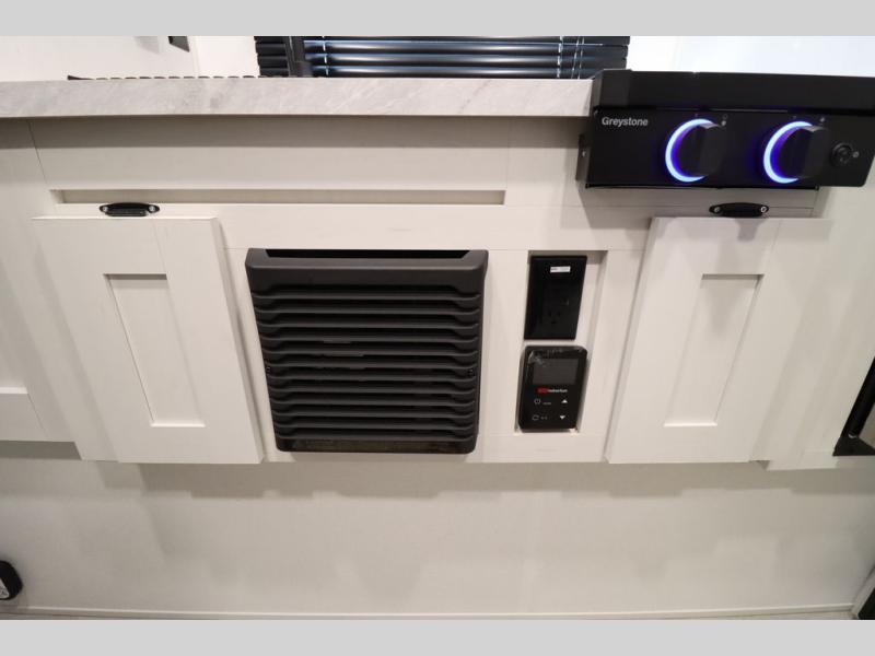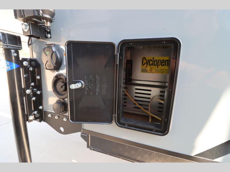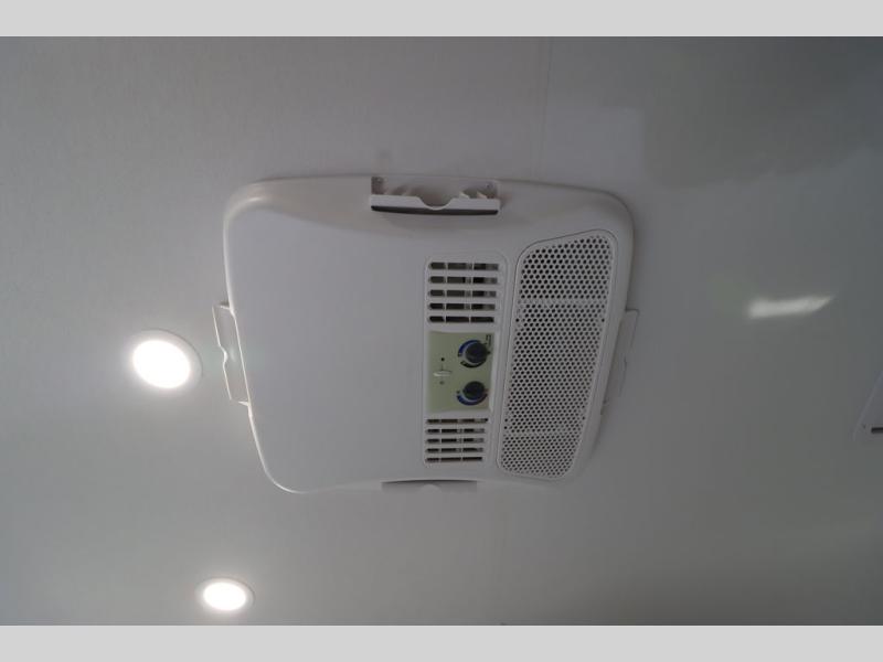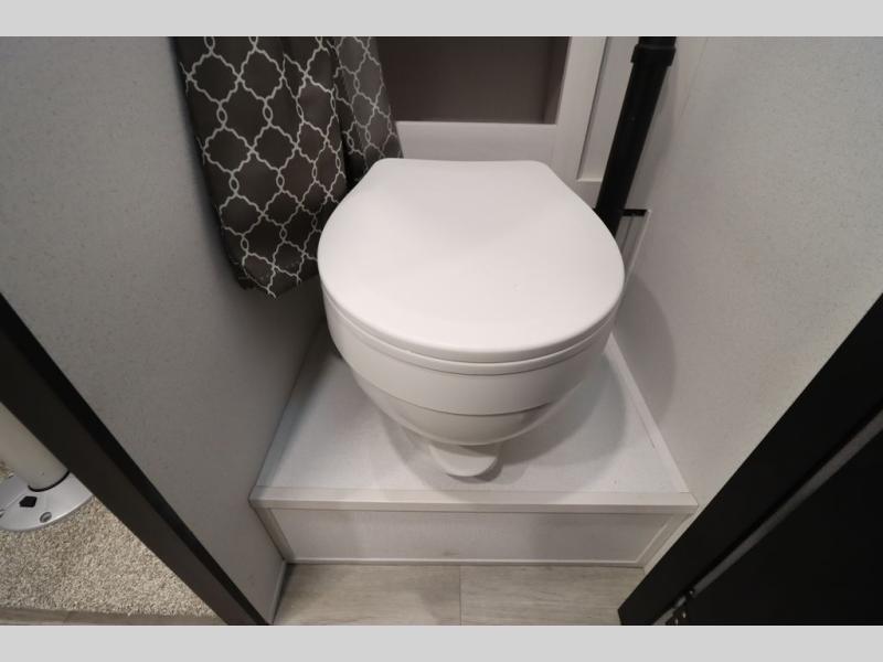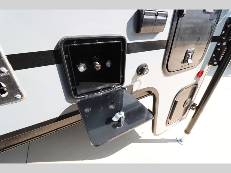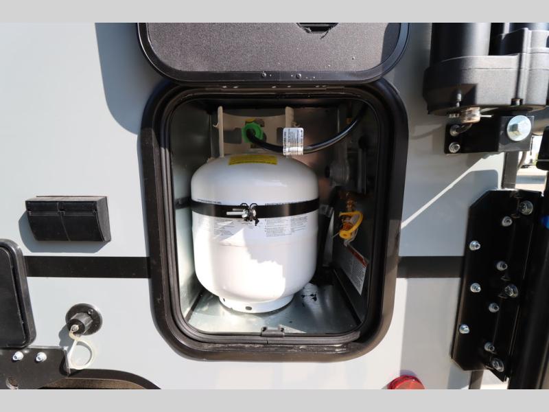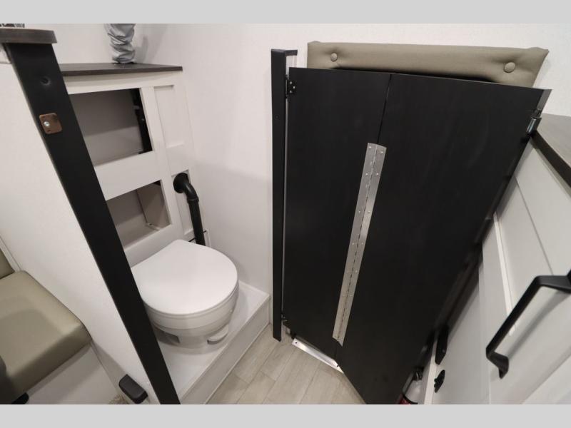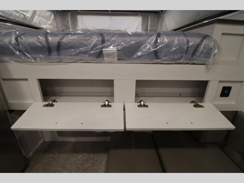 An electric roof lift with a remote will make setting up this soft side truck camper easy! Lay your head at night on the front queen bed with foot lockers and bedroom storage on either side of it to keep your items out of the way. Prepare your best meals with the two burner cooktop, store your canned goods in the pantry, and keep your beverages cold in the 12V refrigerator. The seating area comes with a table so you can enjoy your meals comfortably. There is also a wardrobe behind the private toilet for you to store your toiletries.