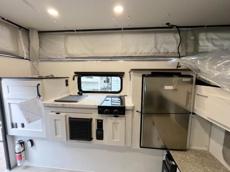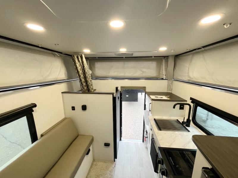 An electric roof lift with a remote will make setting up this soft side truck camper easy! Lay your head at night on the front queen bed with foot lockers and bedroom storage on either side of it to keep your items out of the way. Prepare your best meals with the two burner cooktop, store your canned goods in the pantry, and keep your beverages cold in the 12V refrigerator. The seating area comes with a table so you can enjoy your meals comfortably. There is also a wardrobe behind the private toilet for you to store your toiletries.