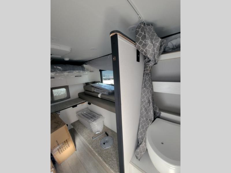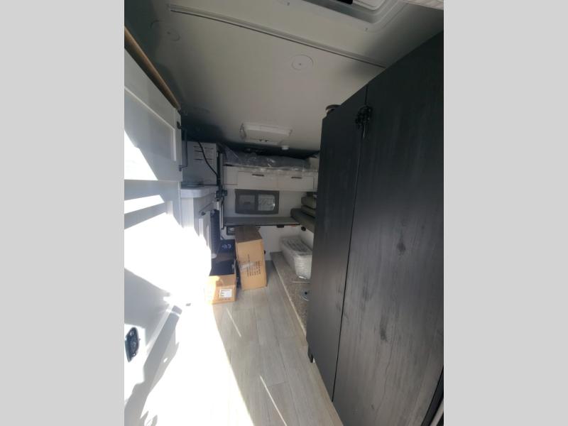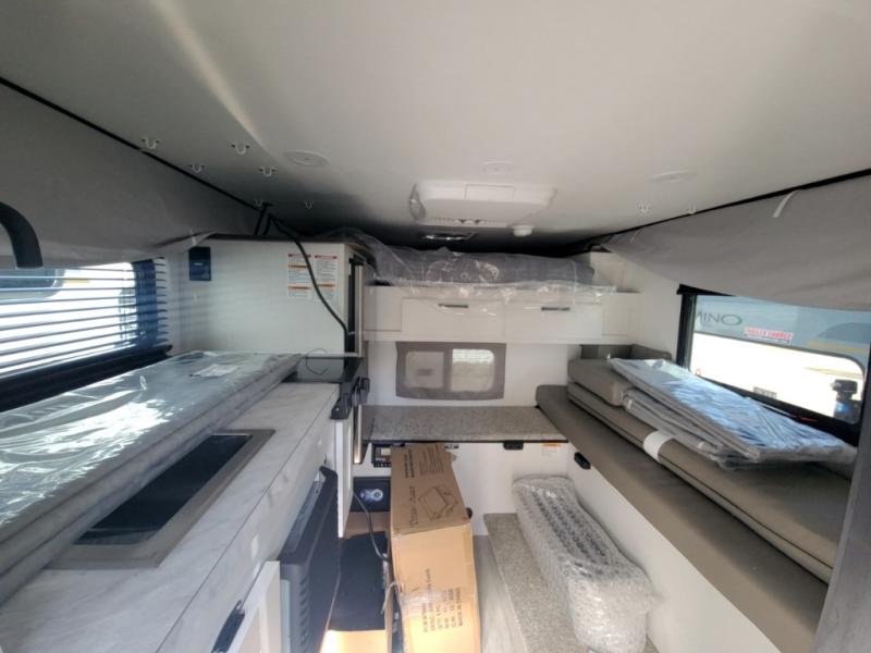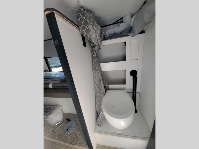 An electric roof lift with a remote will make setting up this soft side truck camper easy! Lay your head at night on the front queen bed with foot lockers and bedroom storage on either side of it to keep your items out of the way. Prepare your best meals with the two burner cooktop, store your canned goods in the pantry, and keep your beverages cold in the 12V refrigerator. The seating area comes with a table so you can enjoy your meals comfortably. There is also a wardrobe behind the private toilet for you to store your toiletries.