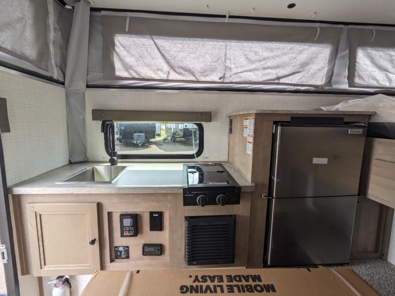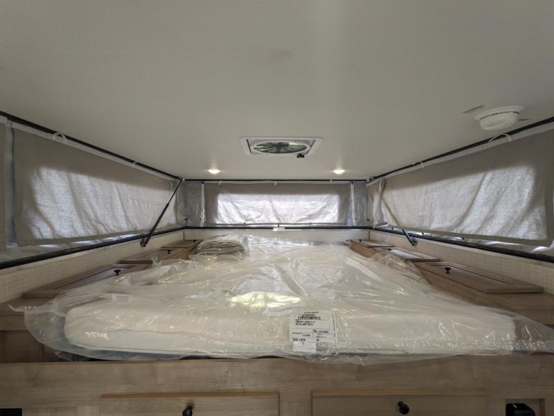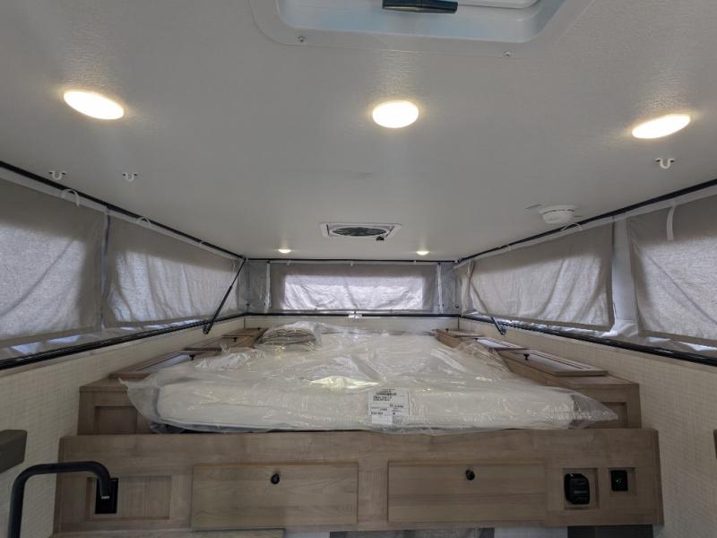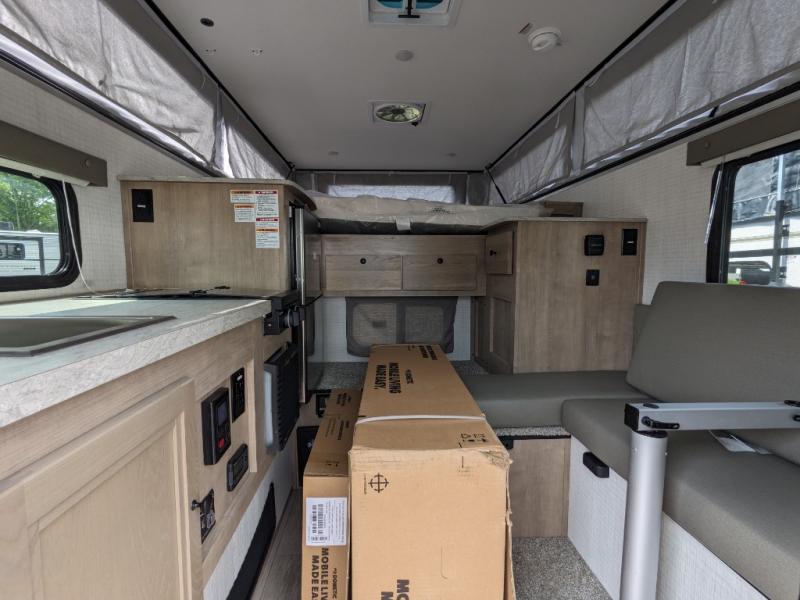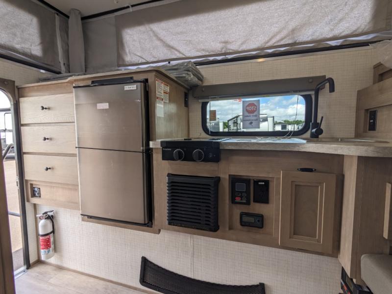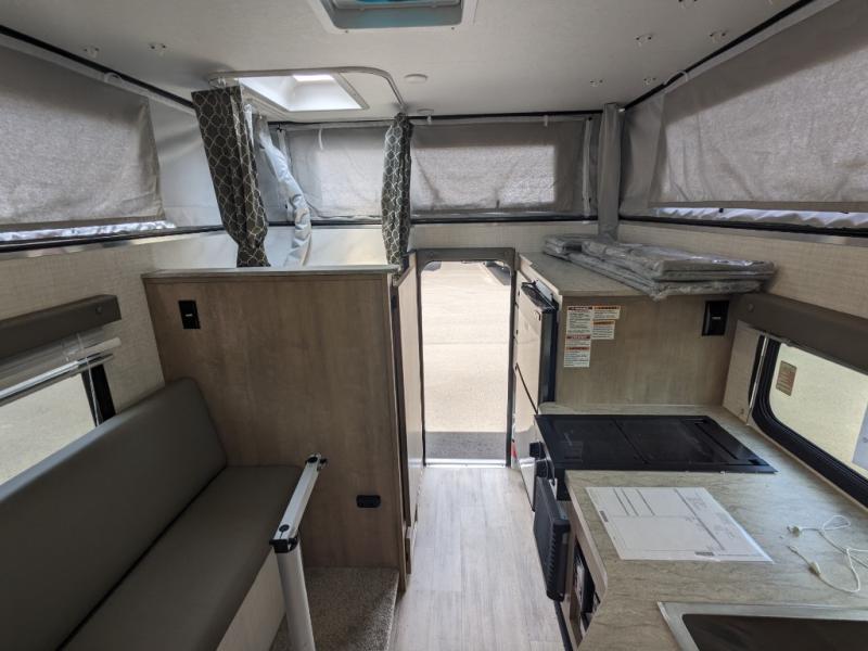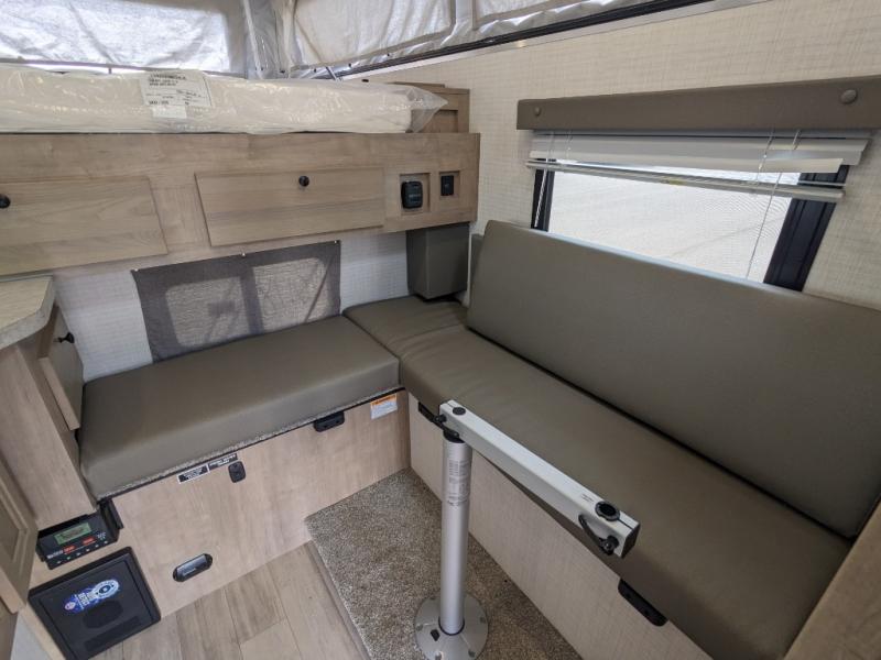 Make the most of all your adventures with this soft side truck camper! Start each morning feeling recharged after sleeping on the front queen bed with foot lockers and bedroom storage on either side of it, and freshen up in the wet bath with storage to keep your towel nearby. There is storage across from the bathroom for your canned goods, a refrigerator to keep your perishables fresh, and a two burner cooktop to prepare your best meals. Enjoy your meals at the seating area with a table then grab a board game from the storage area under the seating!