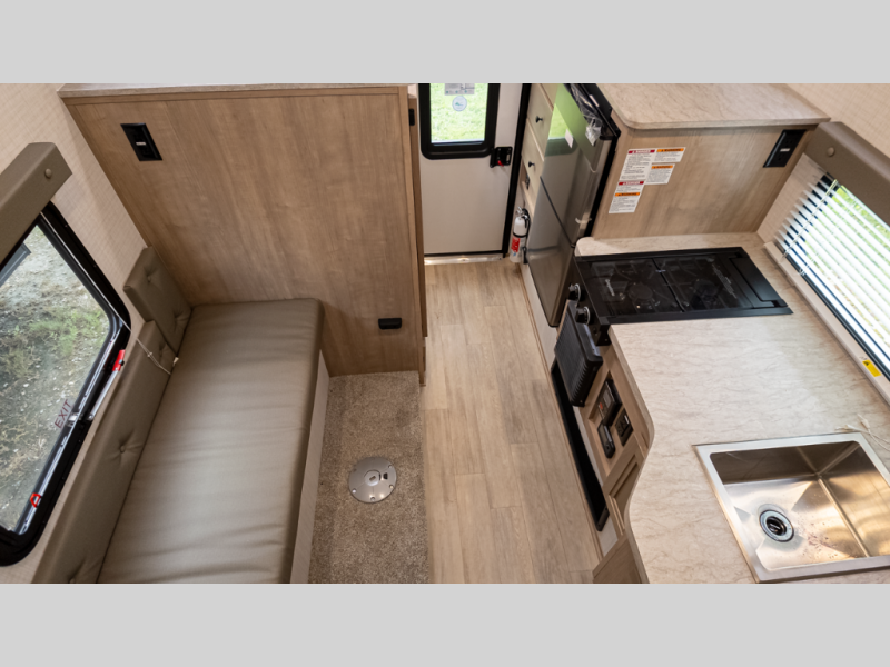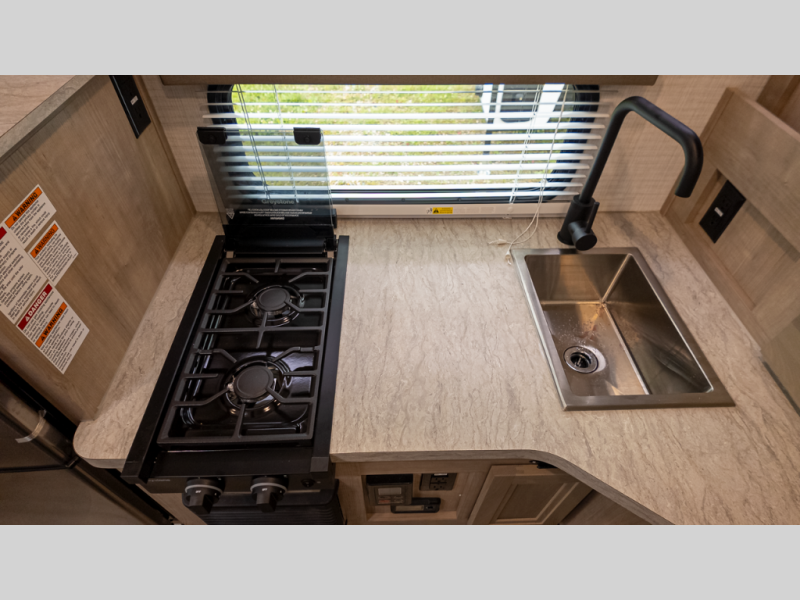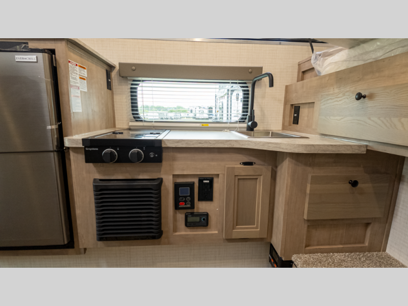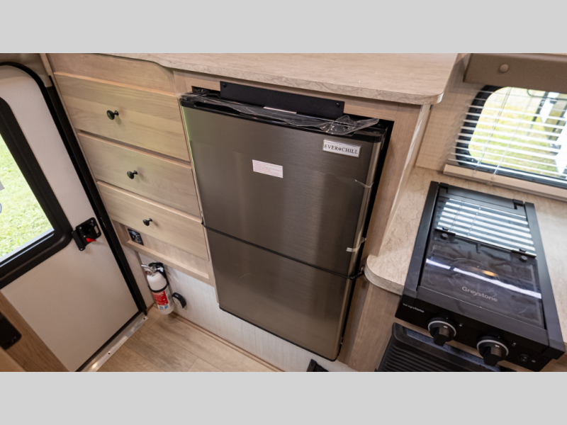 - Comfort essentials: Queen bed, wet bath, 3.3 cu ft fridge, two-burner cooktop, pantry and table