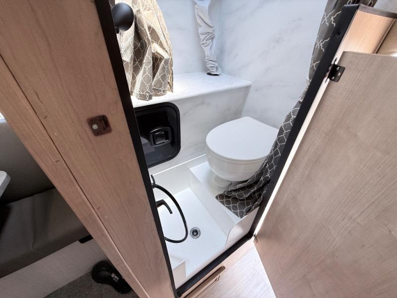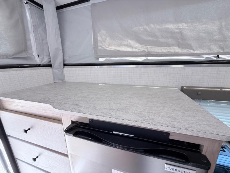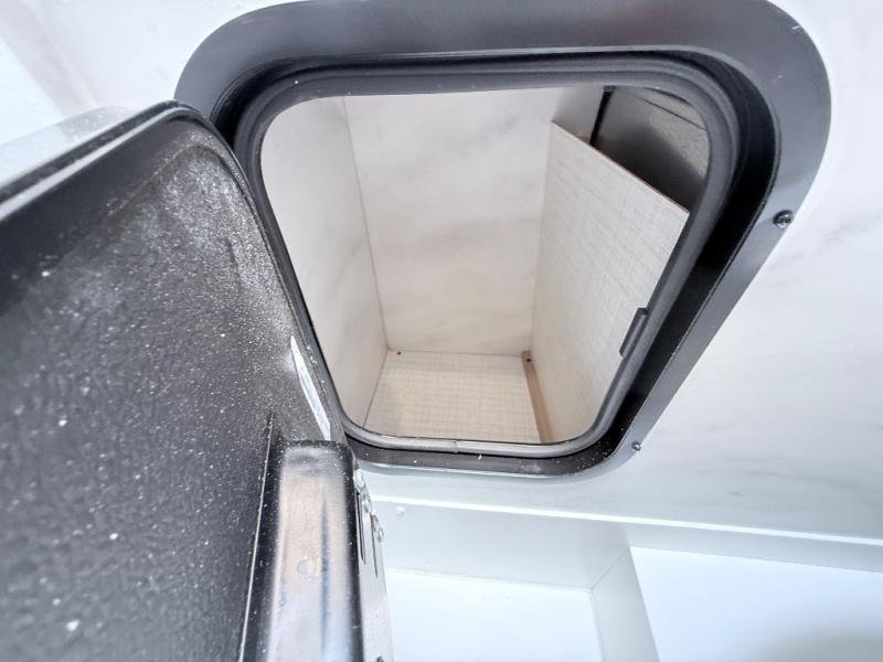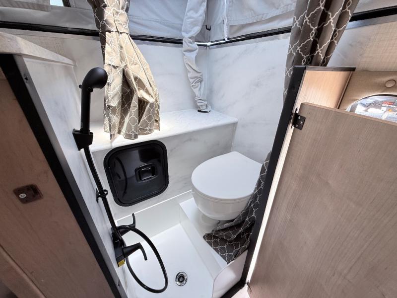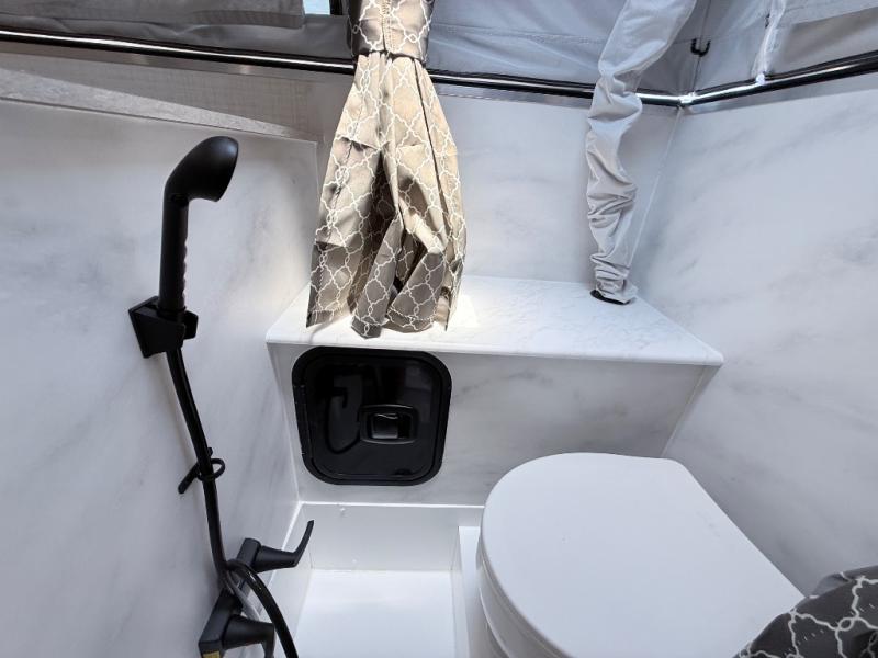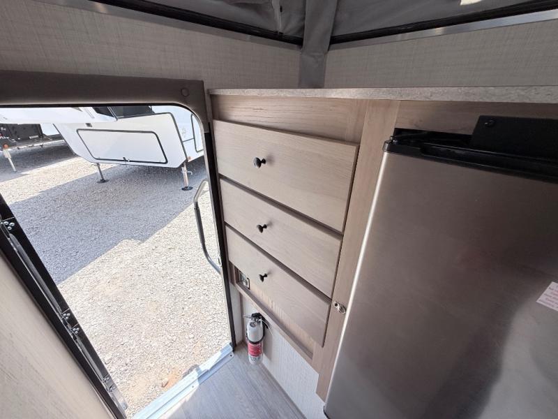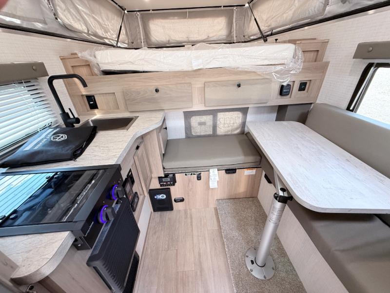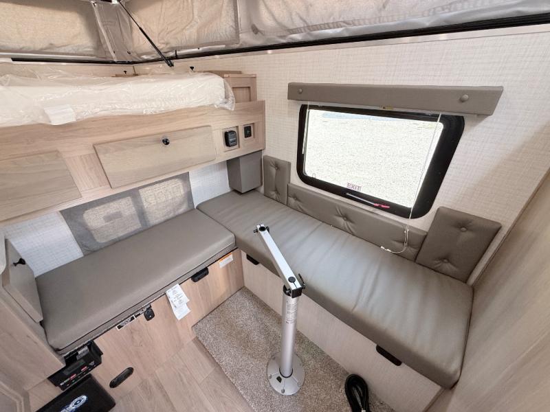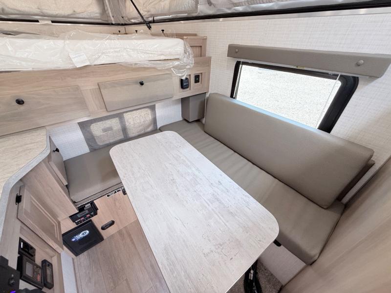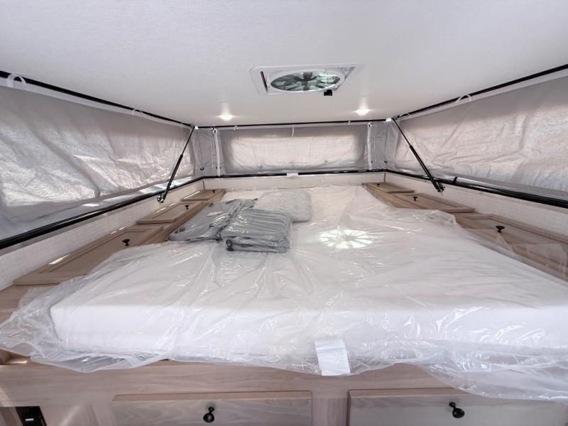 Make the most of all your adventures with this soft side truck camper! Start each morning feeling recharged after sleeping on the front queen bed with foot lockers and bedroom storage on either side of it, and freshen up in the wet bath with storage to keep your towel nearby. There is storage across from the bathroom for your canned goods, a refrigerator to keep your perishables fresh, and a two burner cooktop to prepare your best meals. Enjoy your meals at the seating area with a table then grab a board game from the storage area under the seating!