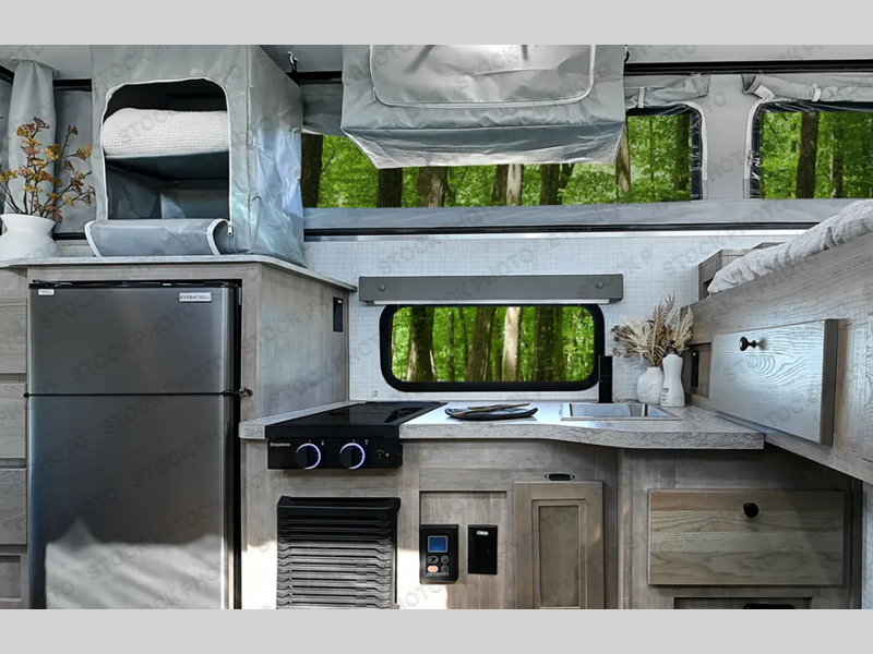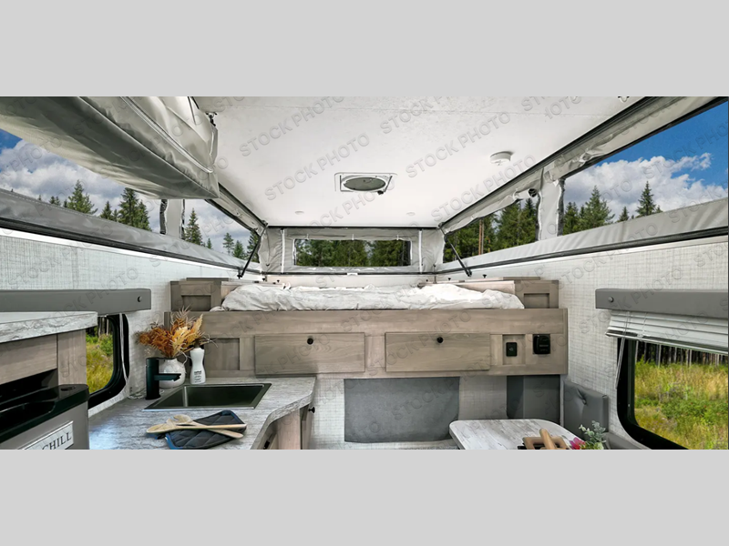 Make the most of all your adventures with this soft side truck camper! Start each morning feeling recharged after sleeping on the front queen bed with foot lockers and bedroom storage on either side of it, and freshen up in the wet bath with storage to keep your towel nearby. There is storage across from the bathroom for your canned goods, a refrigerator to keep your perishables fresh, and a two burner cooktop to prepare your best meals. Enjoy your meals at the seating area with a table then grab a board game from the storage area under the seating!