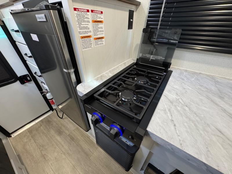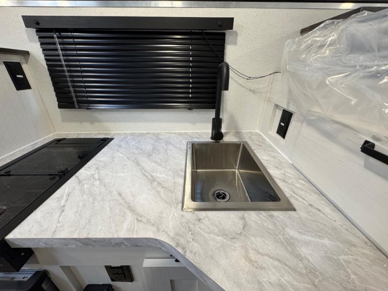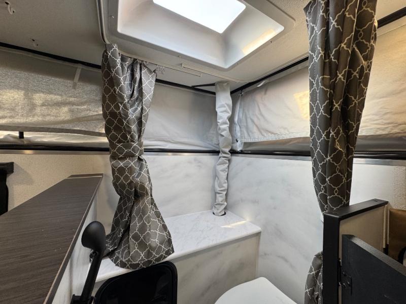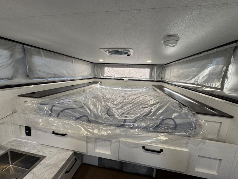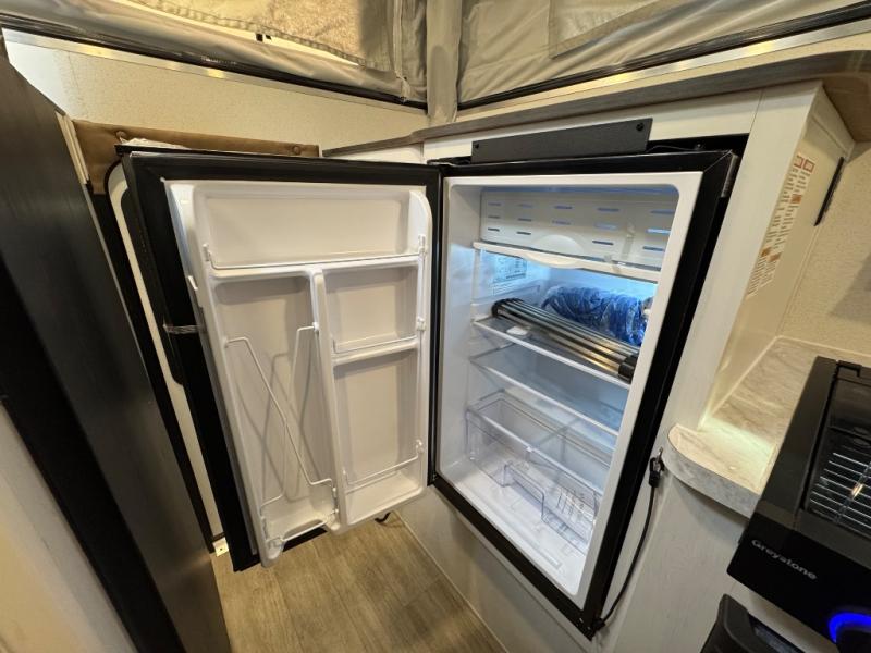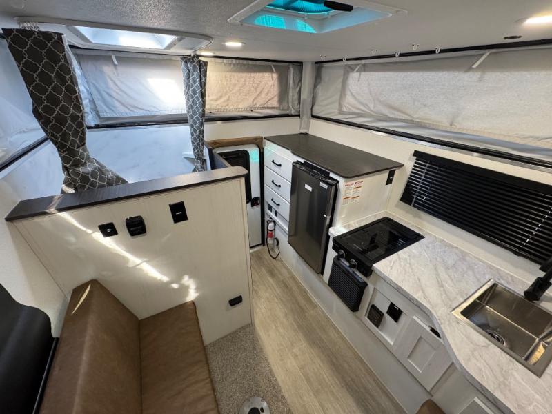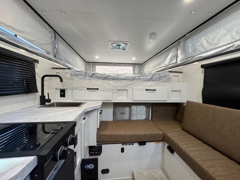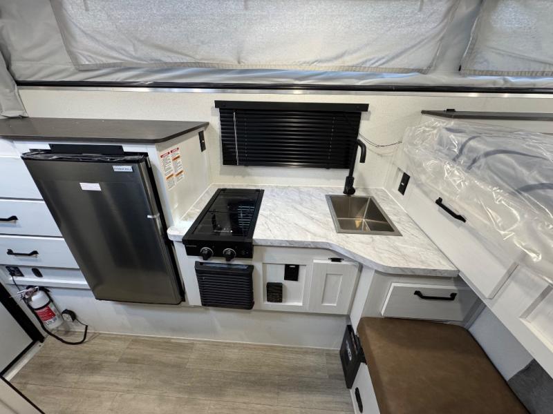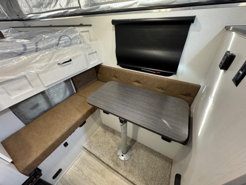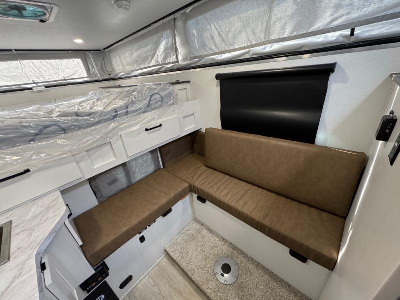 Make the most of all your adventures with this soft side truck camper! Start each morning feeling recharged after sleeping on the front queen bed with foot lockers and bedroom storage on either side of it, and freshen up in the wet bath with storage to keep your towel nearby. There is storage across from the bathroom for your canned goods, a refrigerator to keep your perishables fresh, and a two burner cooktop to prepare your best meals. Enjoy your meals at the seating area with a table then grab a board game from the storage area under the seating!