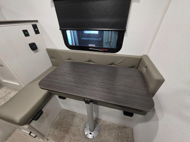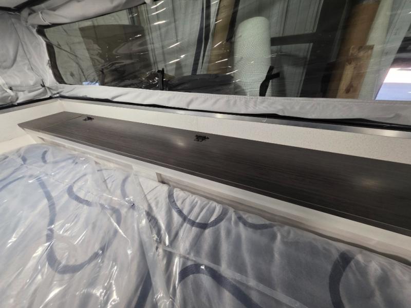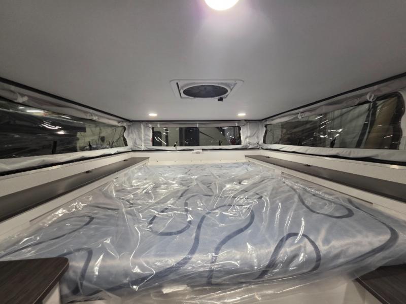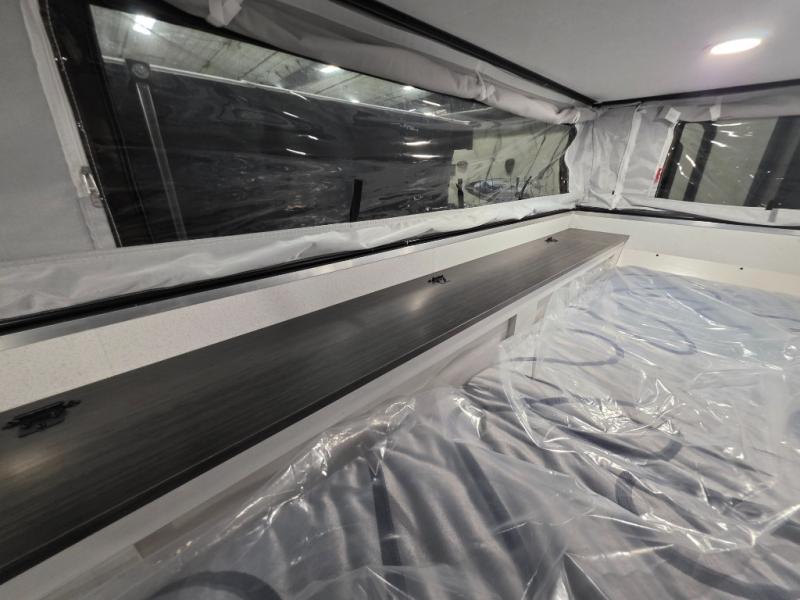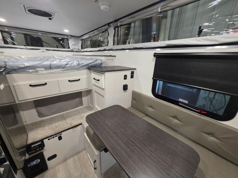 This soft side truck camper was built for 1/2 ton trucks with a 5' 6" to an 8' bed. Wake up feeling recharged after sleeping on the front queen bed with foot lockers and bedroom storage on either side of it. There is even a wardrobe for added storage. You can prepare your best meals with the two burner cooktop, and the refrigerator can hold perishables. Your meals can be enjoyed at the U-shaped seating area with a table and you can transform it into an extra sleeping space for a friend to join the fun!