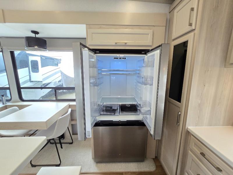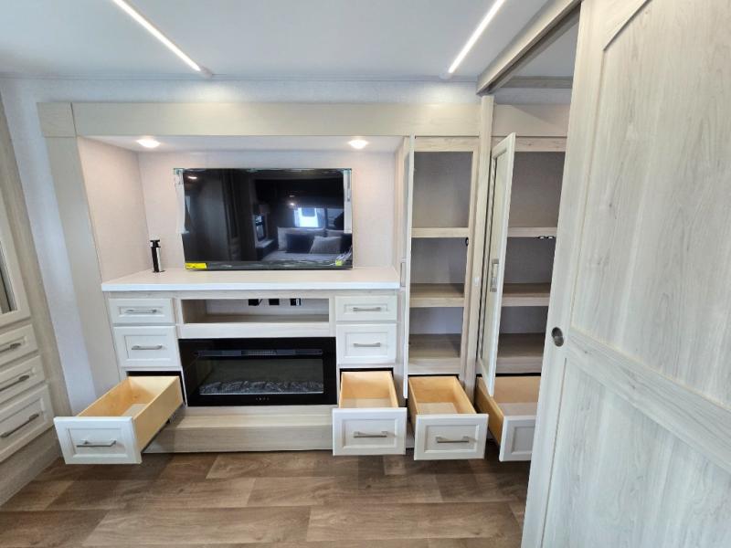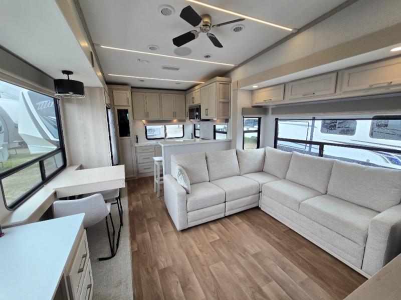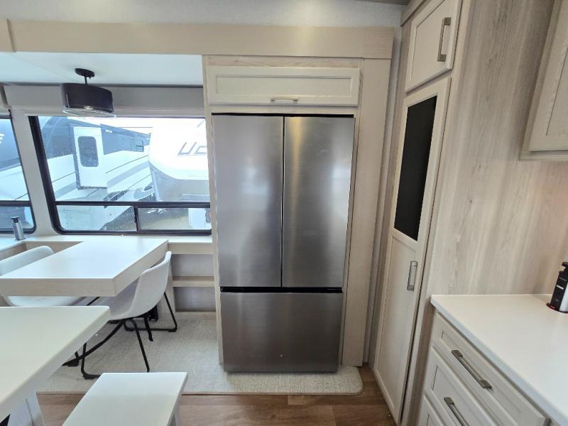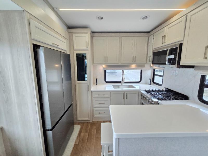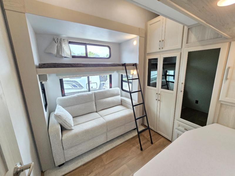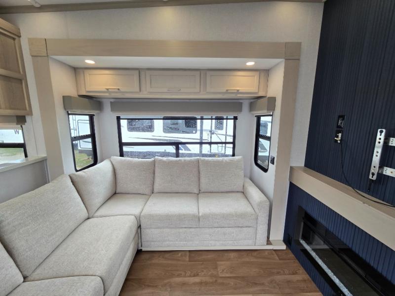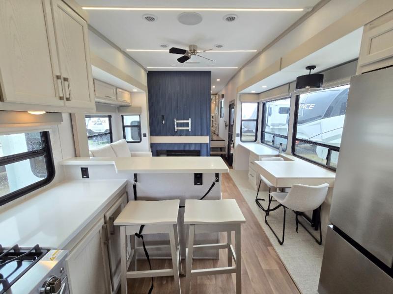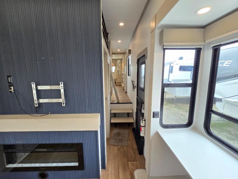 If you enjoy camping with a large group of family or friends, this fifth wheel will be perfect for you! There are five slides, giving your crew plenty of space to relax, plus there is a mid-bunk room with a tri-fold sofa, a 30" x 68" bunk, and a desk. And above this room is a 30" x 68" loft for even more sleeping or storage space. You can claim the front private bedroom all to yourselves which includes a king bed, front bench with dual wardrobes, plus a bedroom fireplace and Smart TV. Everyone can enjoy visiting together in the middle living room on the L-lounge by the entertainment center with a second fireplace. There is a table and chairs for dining space, plus a desk with a chair if you need to get some work done. And don't overlook the rear kitchen with a large refrigerator and pantry, all the appliances to make meals, plus ample counter space, including a bar top that overlooks the main living area!