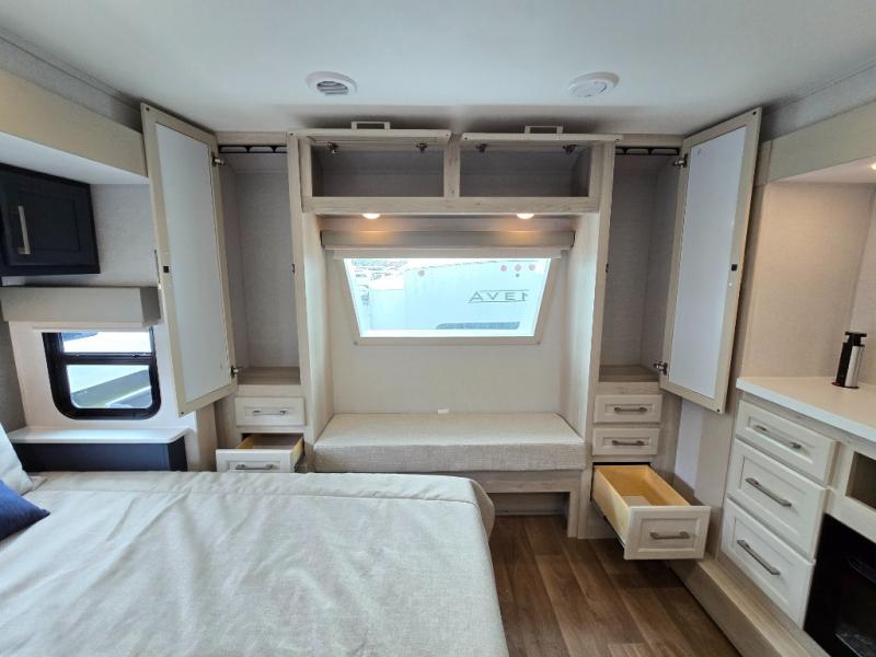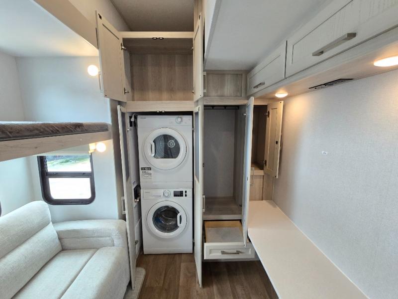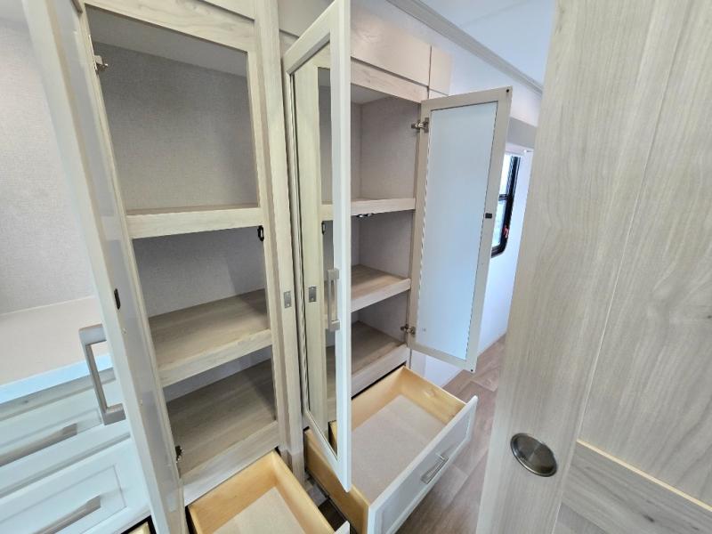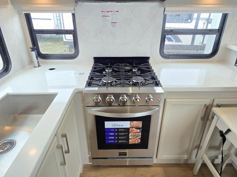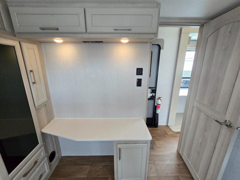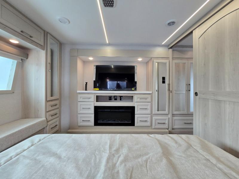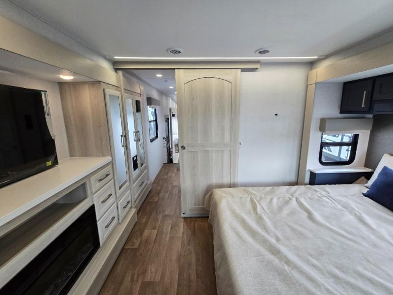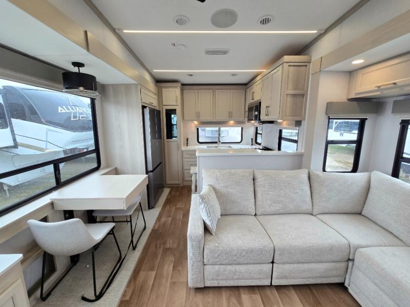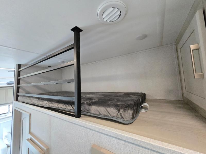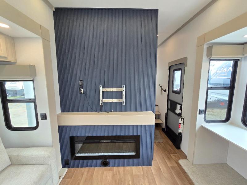 If you enjoy camping with a large group of family or friends, this fifth wheel will be perfect for you! There are five slides, giving your crew plenty of space to relax, plus there is a mid-bunk room with a tri-fold sofa, a 30" x 68" bunk, and a desk. And above this room is a 30" x 68" loft for even more sleeping or storage space. You can claim the front private bedroom all to yourselves which includes a king bed, front bench with dual wardrobes, plus a bedroom fireplace and Smart TV. Everyone can enjoy visiting together in the middle living room on the L-lounge by the entertainment center with a second fireplace. There is a table and chairs for dining space, plus a desk with a chair if you need to get some work done. And don't overlook the rear kitchen with a large refrigerator and pantry, all the appliances to make meals, plus ample counter space, including a bar top that overlooks the main living area!