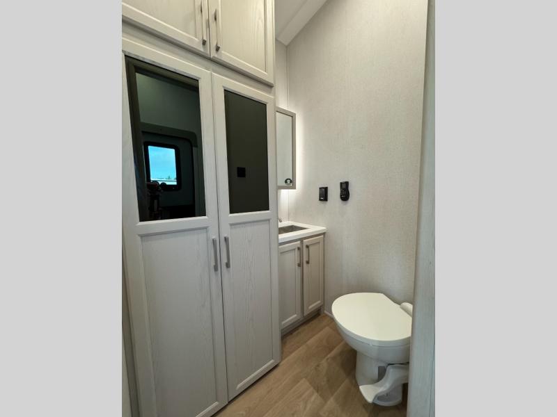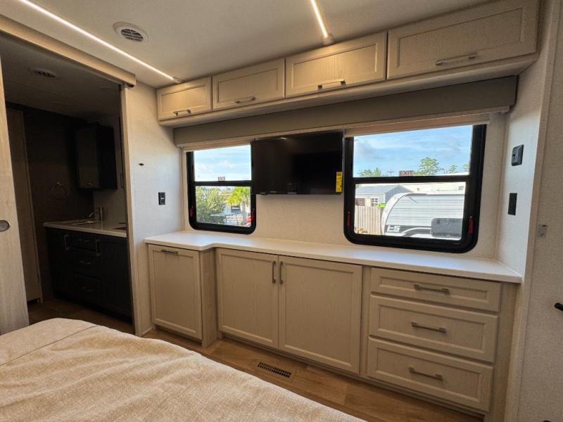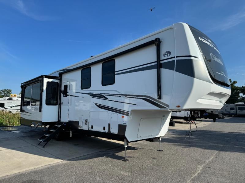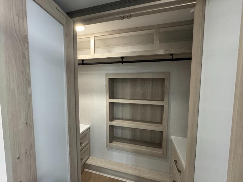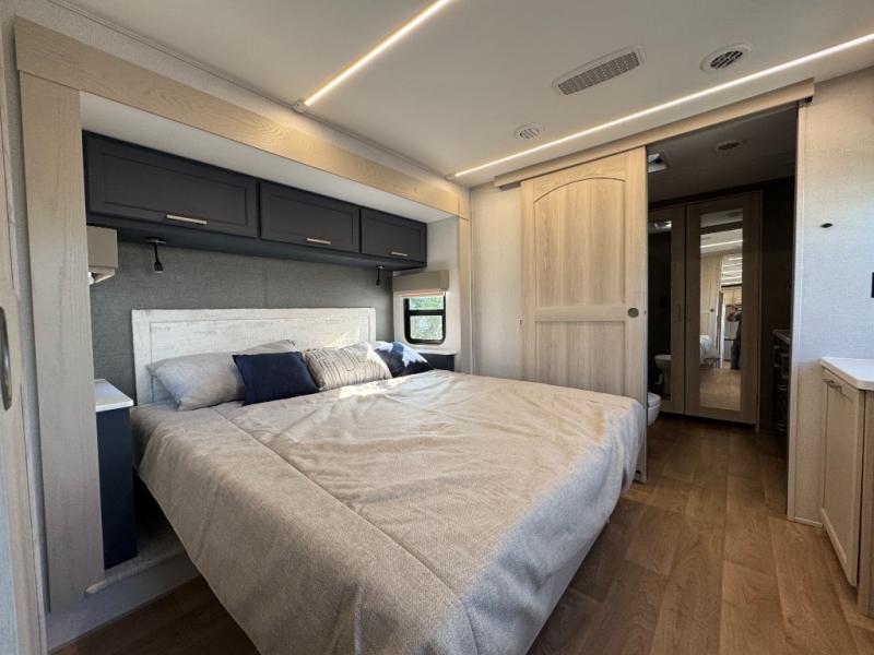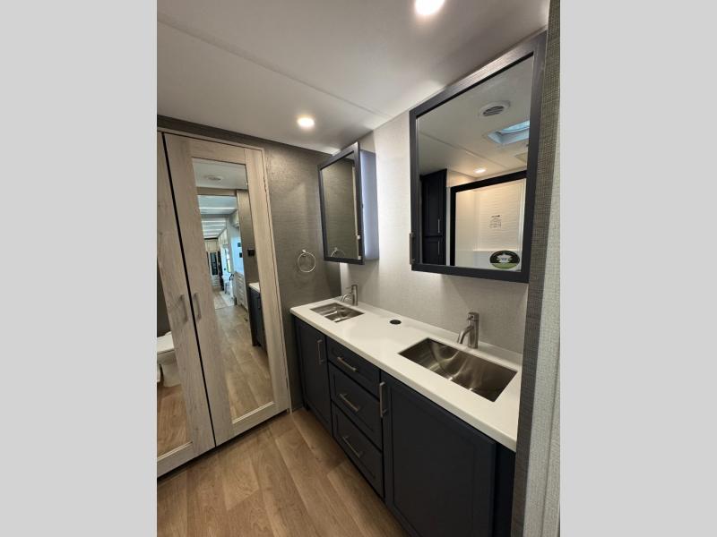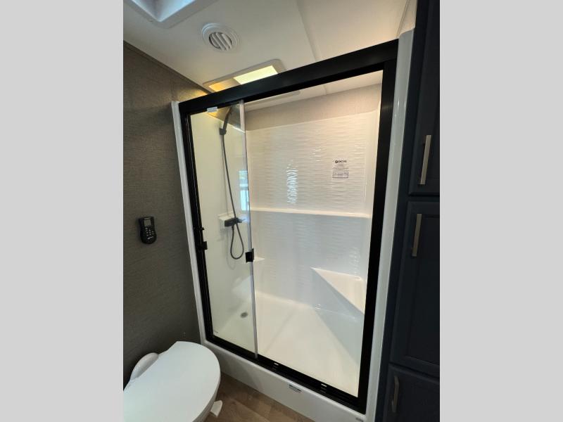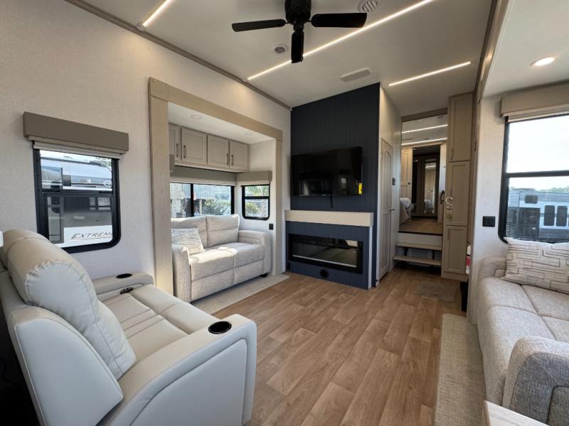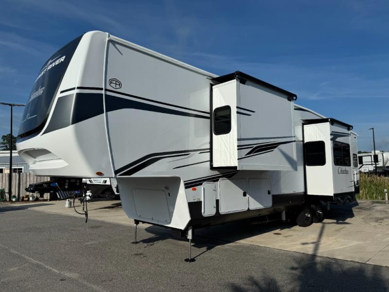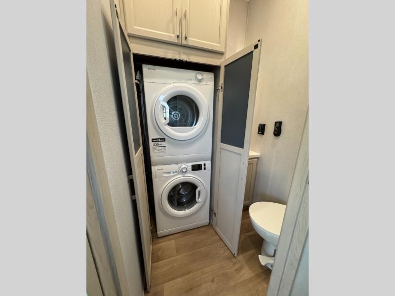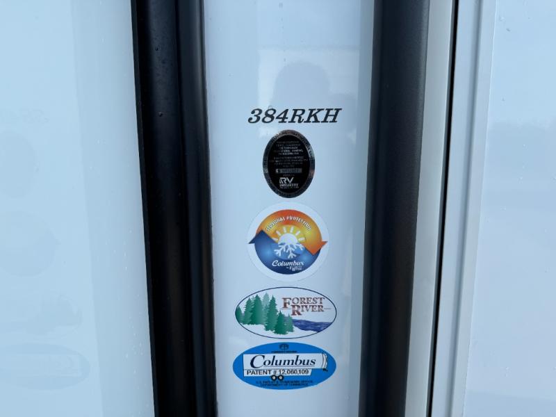 The Columbus 384RKH (Rear Kitchen High-profile) is a dream for full-time RVers and weekend warriors alike. It is built for the South Carolina heat with three 15K BTU A/C units and comes standard with a stackable washer and dryer, so you are ready to hit the road immediately.