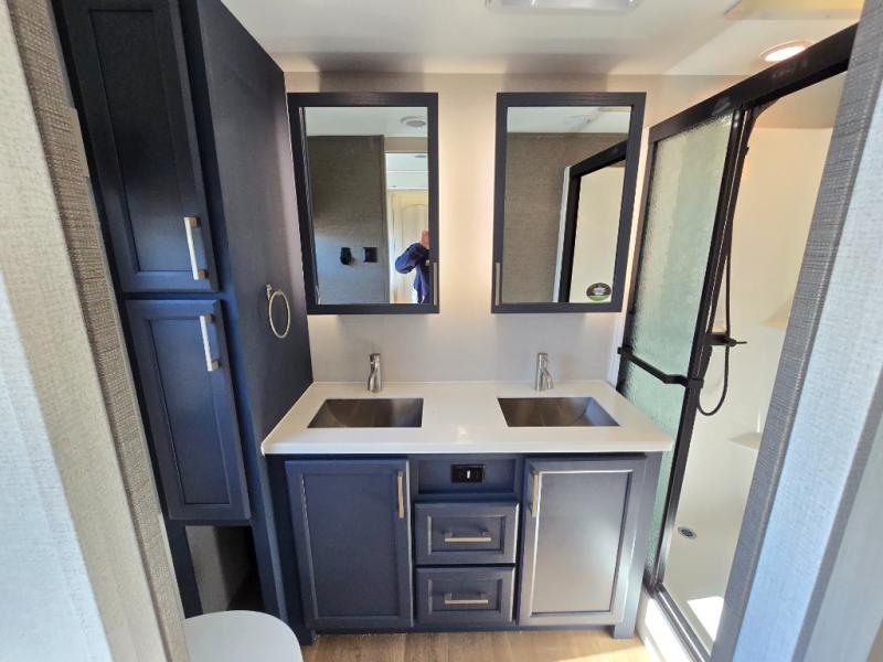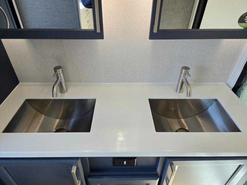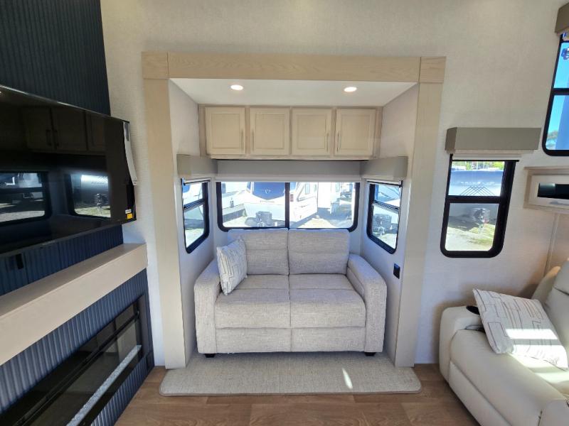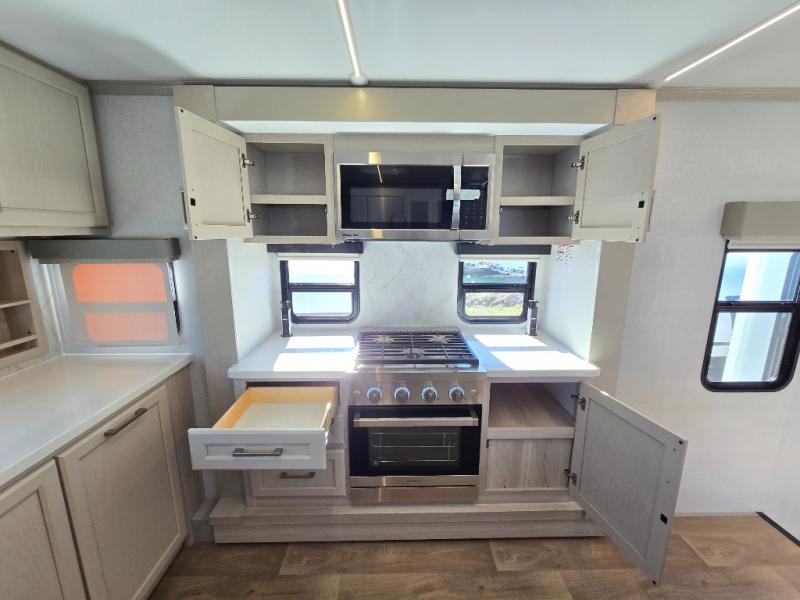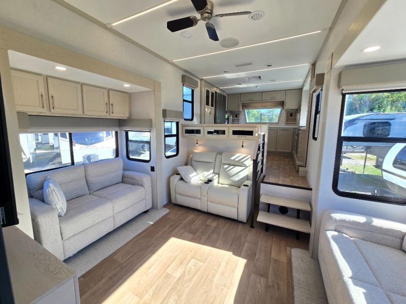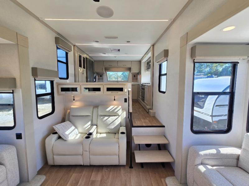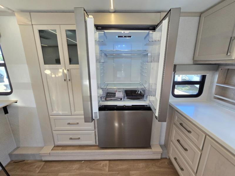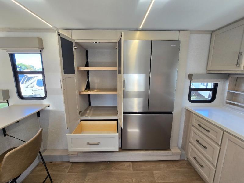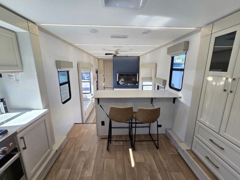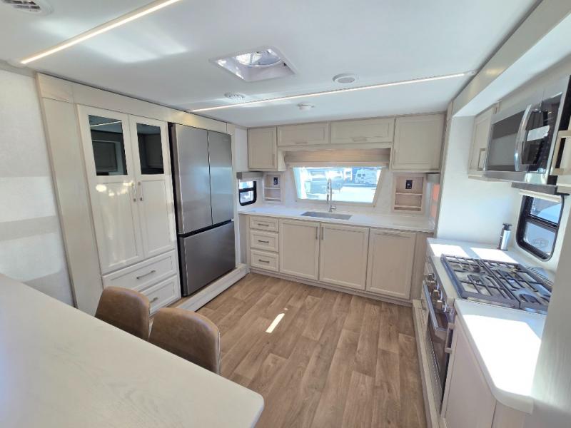 The front kitchen in this fifth wheel is a chef's dream come true while camping! There is generous counter space up front and beside the range, plus a pantry and 12V 18 cu. ft. 3-door refrigerator with ice. There is also a hi-top table with two bar stools that overlooks the living area. Inside the living area there are opposing sofa sleeper slides and power theater seating across from an entertainment center with a 50" Smart TV. A mid-coach half bath is easily accessible, and the full rear bath with dual bath sinks will create a master bedroom you are sure to love. There is a king bed slide out, a wardrobe, hamper, and a TV/storage.