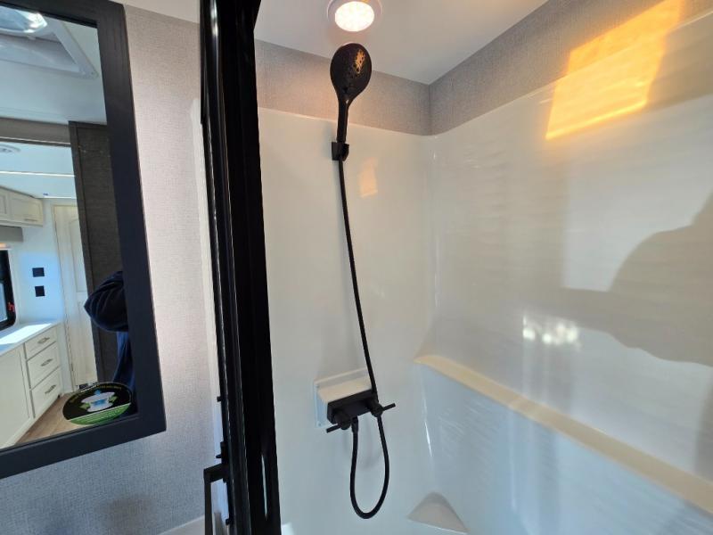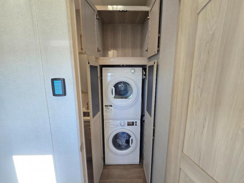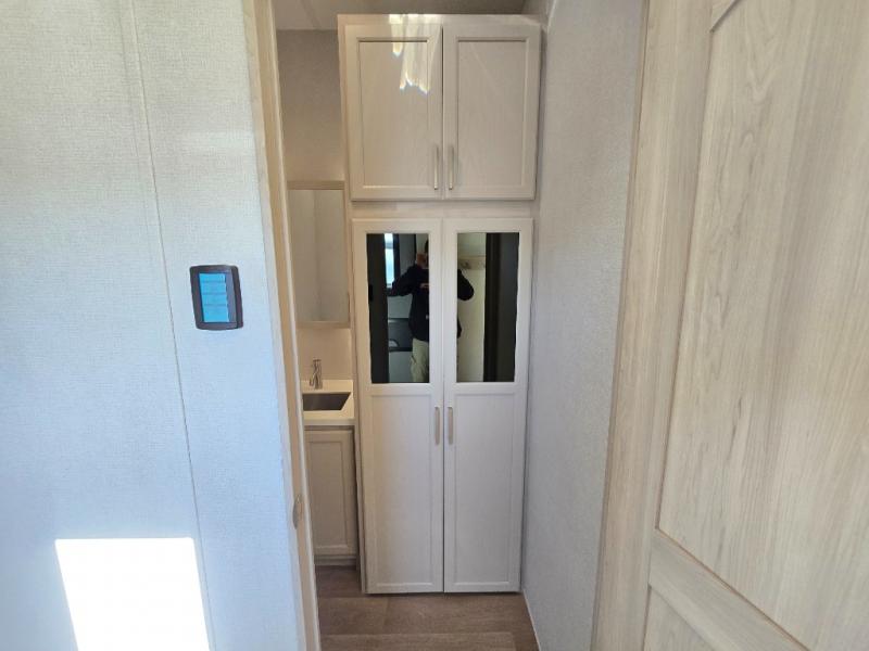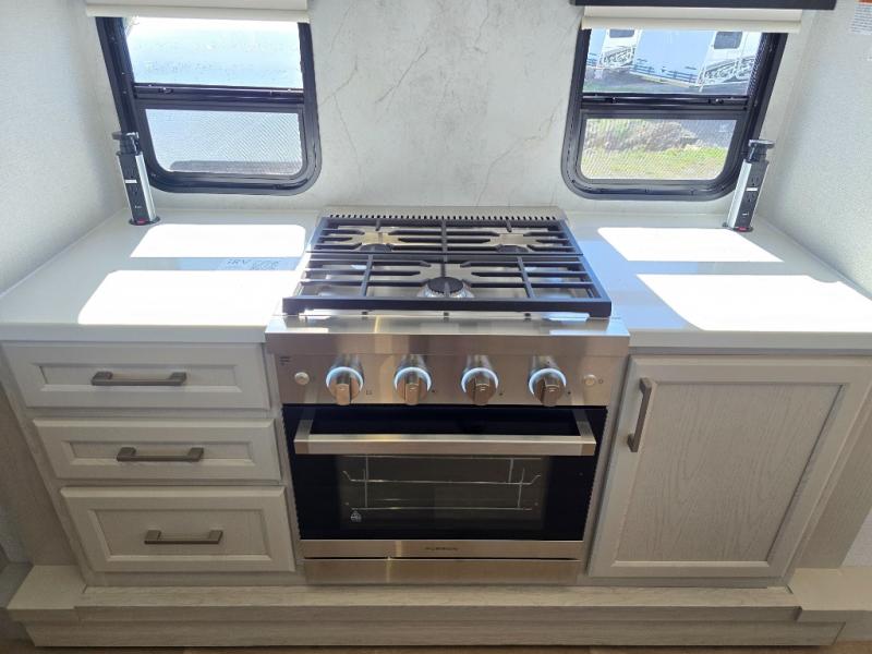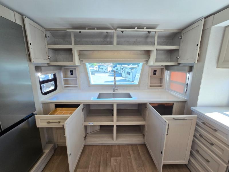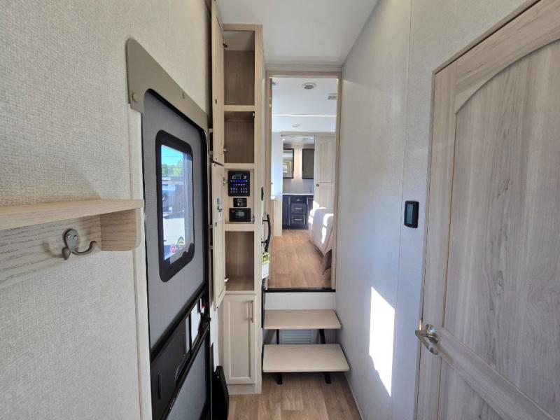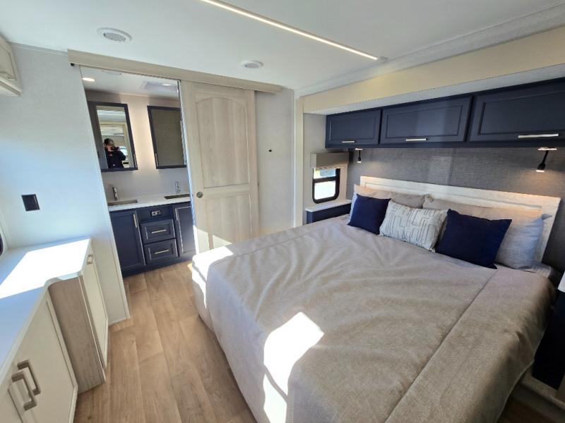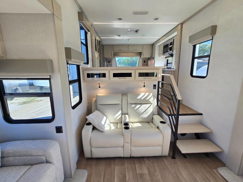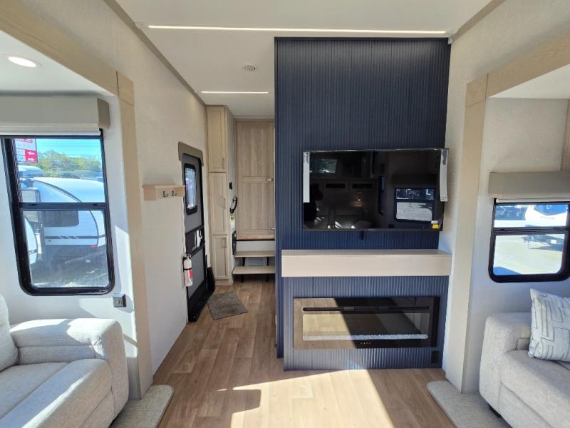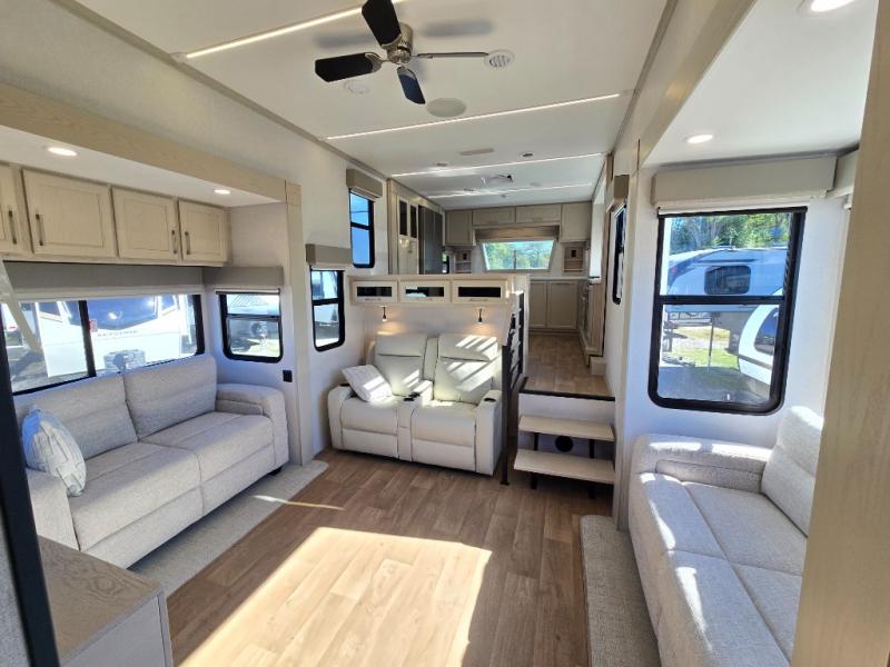 The front kitchen in this fifth wheel is a chef's dream come true while camping! There is generous counter space up front and beside the range, plus a pantry and 12V 18 cu. ft. 3-door refrigerator with ice. There is also a hi-top table with two bar stools that overlooks the living area. Inside the living area there are opposing sofa sleeper slides and power theater seating across from an entertainment center with a 50" Smart TV. A mid-coach half bath is easily accessible, and the full rear bath with dual bath sinks will create a master bedroom you are sure to love. There is a king bed slide out, a wardrobe, hamper, and a TV/storage.