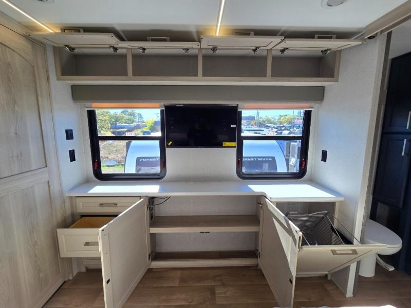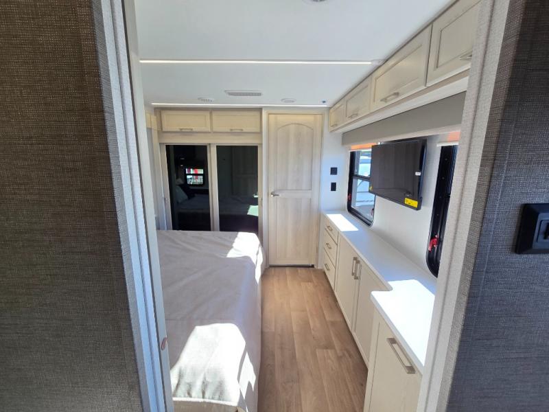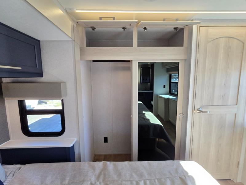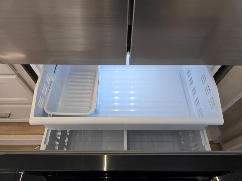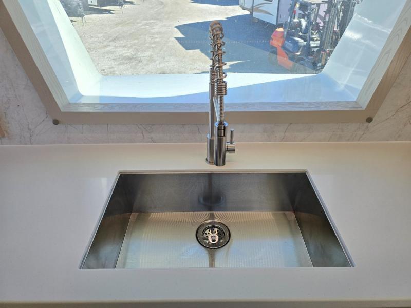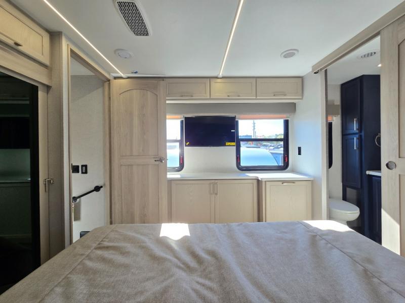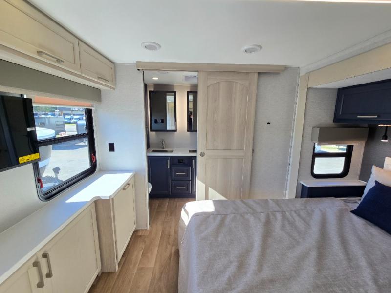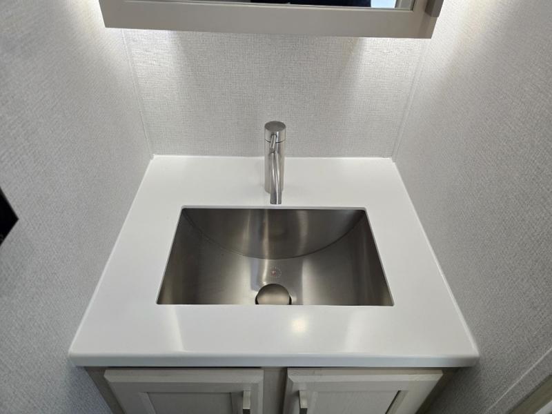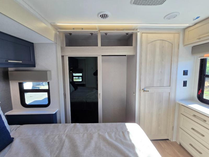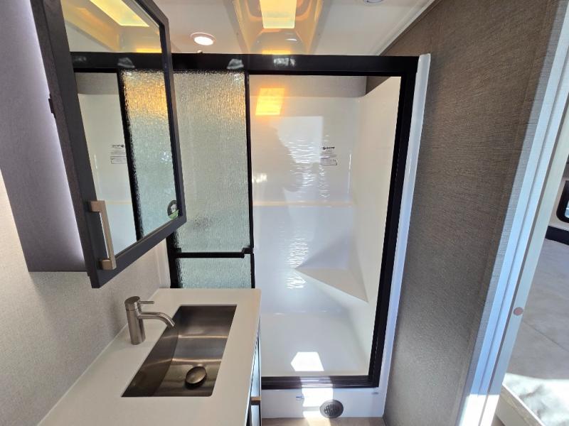 The front kitchen in this fifth wheel is a chef's dream come true while camping! There is generous counter space up front and beside the range, plus a pantry and 12V 18 cu. ft. 3-door refrigerator with ice. There is also a hi-top table with two bar stools that overlooks the living area. Inside the living area there are opposing sofa sleeper slides and power theater seating across from an entertainment center with a 50" Smart TV. A mid-coach half bath is easily accessible, and the full rear bath with dual bath sinks will create a master bedroom you are sure to love. There is a king bed slide out, a wardrobe, hamper, and a TV/storage.