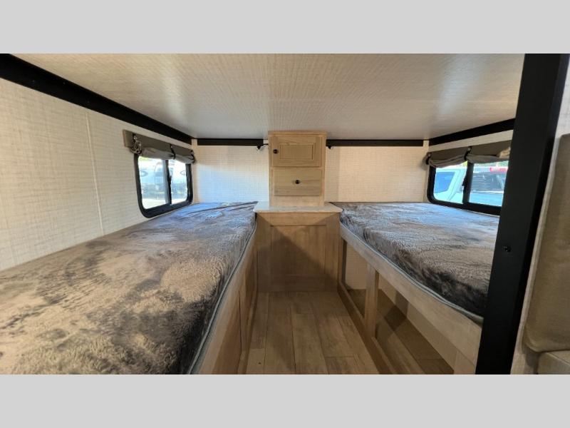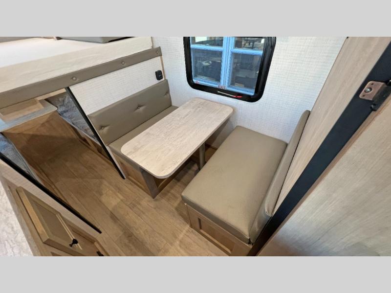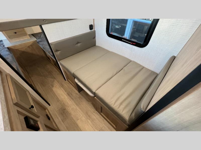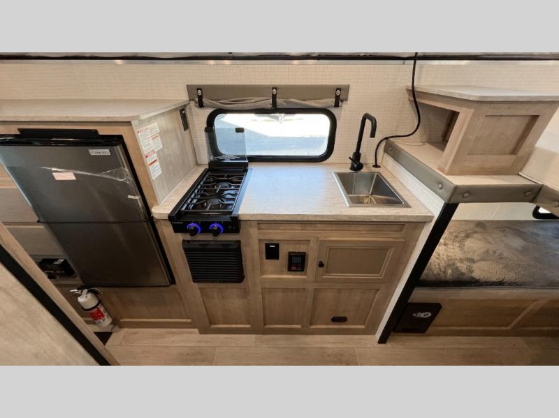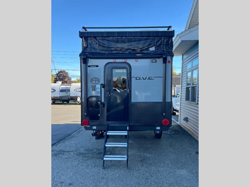Adventure on with this O.V.E travel trailer! There is a rear entry door, with a private cassette toilet and 24" x 32" shower just inside the door, allowing you to quickly get back outside. You can prepare your meals on the two burner cooktop, clean up in the sink, then store perishables back in the refrigerator. There is also storage by the fridge for extra kitchen necessities. A booth dinette provides a place to dine together each day or play a game of cards in the evening. You will love the front queen bed for a great night's rest, and there are two lower beds under the queen bed for additional campers!