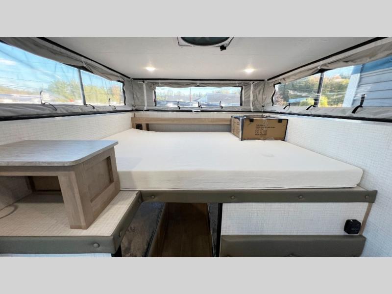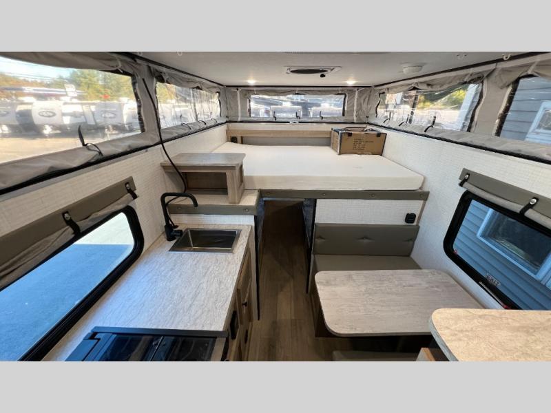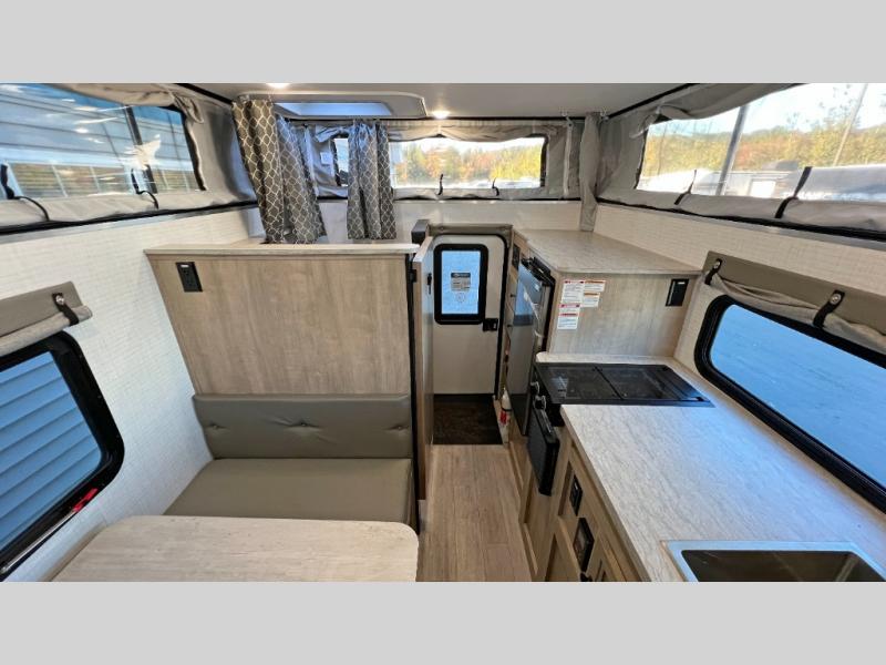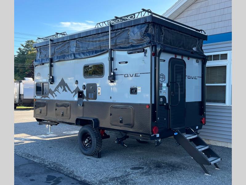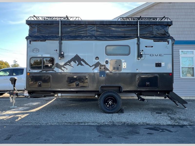 With any Palomino O.V.E (on vehicle equipment) travel trailer, you can plan to go off grid and off the beaten path! There is a Curt independent suspension axle, and a 400-watt solar panel that makes this possible. The gel coat fiberglass exterior is sure to be eye-catching, and the diamond plate adds protection against rock and debris. Each model also includes an electric pop top roof and a dual roof rack, which means you can bring along extra adventure gear. You will also enjoy many interior comforts, including a Create-A-Breeze fan for better ventilation!