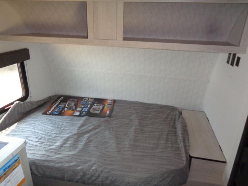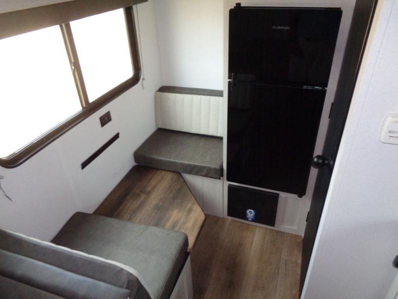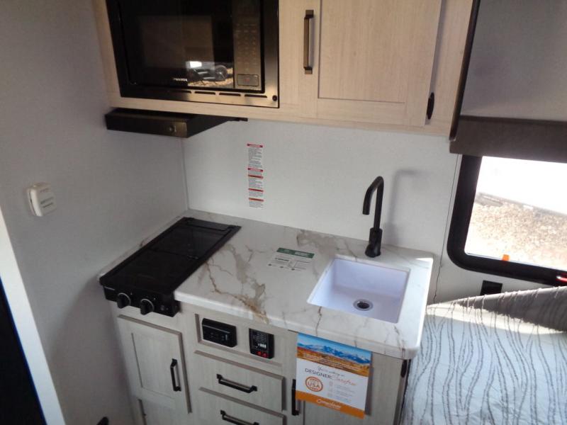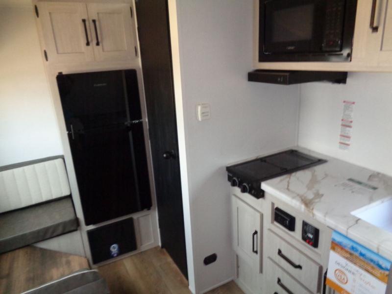 It will be so easy to enjoy camping trips in this single axle travel trailer! There is a front RV queen bed with flip-up storage at the foot of the bed for your belongings, and any additional guests can sleep on the booth dinette with an open shelf above. A full kitchen includes a stainless two burner cooktop and stainless microwave to cook meals each day, and the 4.3 cu. ft. 12V black glass refrigerator will keep your food fresh. And a private bath includes a 24" x 32" shower to clean off after a day outdoors!