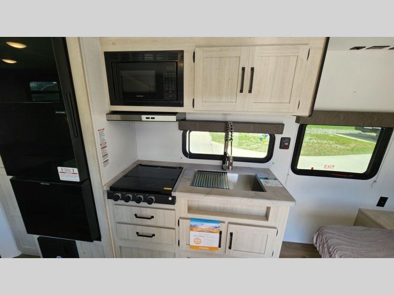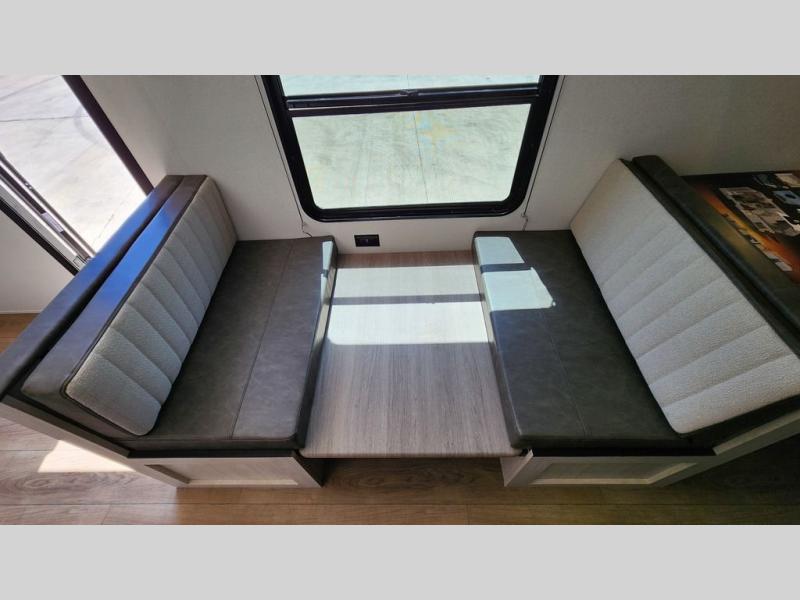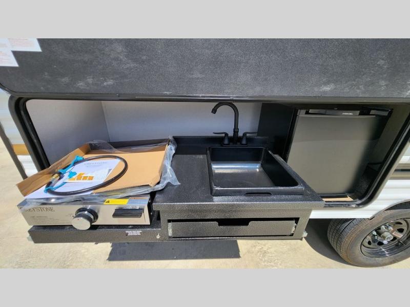 If you're looking for more sleeping space, this double axle unit features double-size bunks with storage under the bunks for your bags. The full kitchen includes a stainless microwave and three burner cooktop to make meals, plus a pantry and 12V refrigerator for food storage. And an optional outside mini kitchen with a griddle can be added if you enjoy cooking outdoors! Up front, you'll find a 60" x 74" queen bed with an optional Murphy bed if you're needing more seating space during the day!