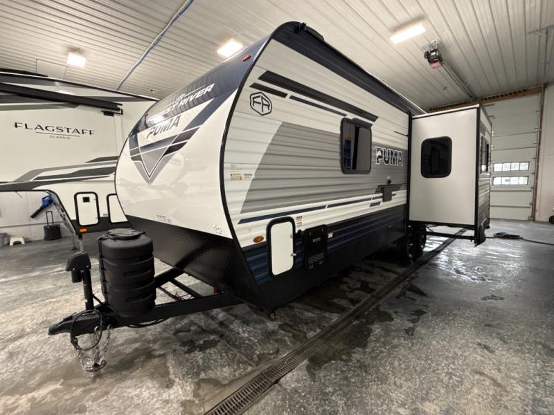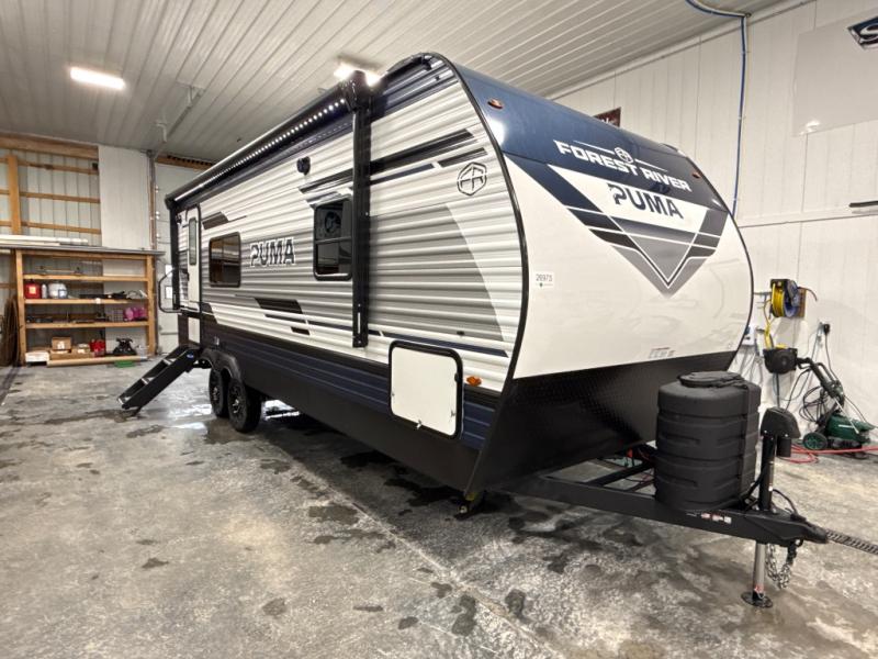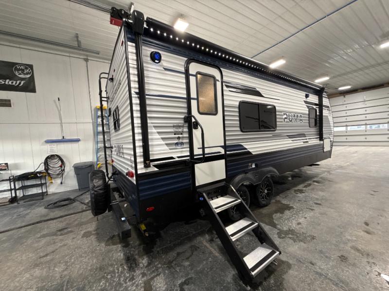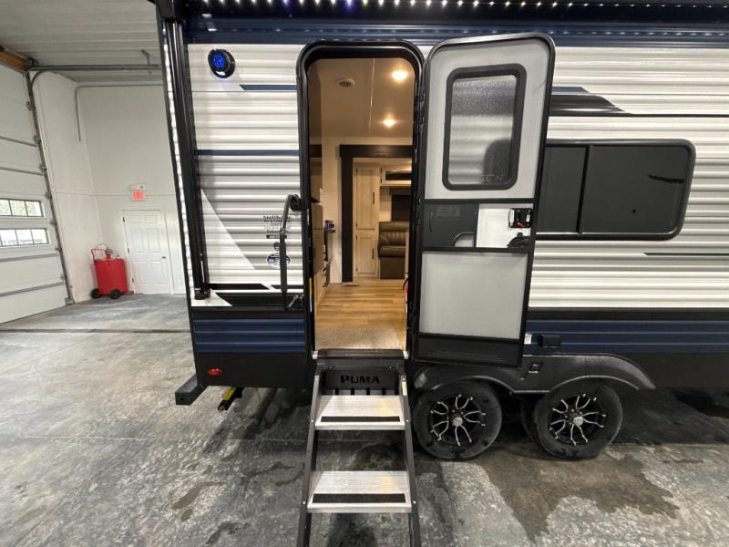 If you're looking for family-fun adventures then you need one of these Palomino Puma fifth wheels or travel trailers! They are built rugged, easy to tow, and jam packed with features. The Darco wrapped underbelly will protect your units vitals and the AlphaPly roofing membrane covers it. They also have new aluminum wheels and a powder coated steel I-beam frame. Inside, the Congoleum linoleum will be easy to keep clean, and the night roller shades will provide privacy when it's time to turn in. You'll also enjoy an electric awning with an LED light strip plus an AM/FM/Bluetooth stereo and two outside speakers to keep the party going!