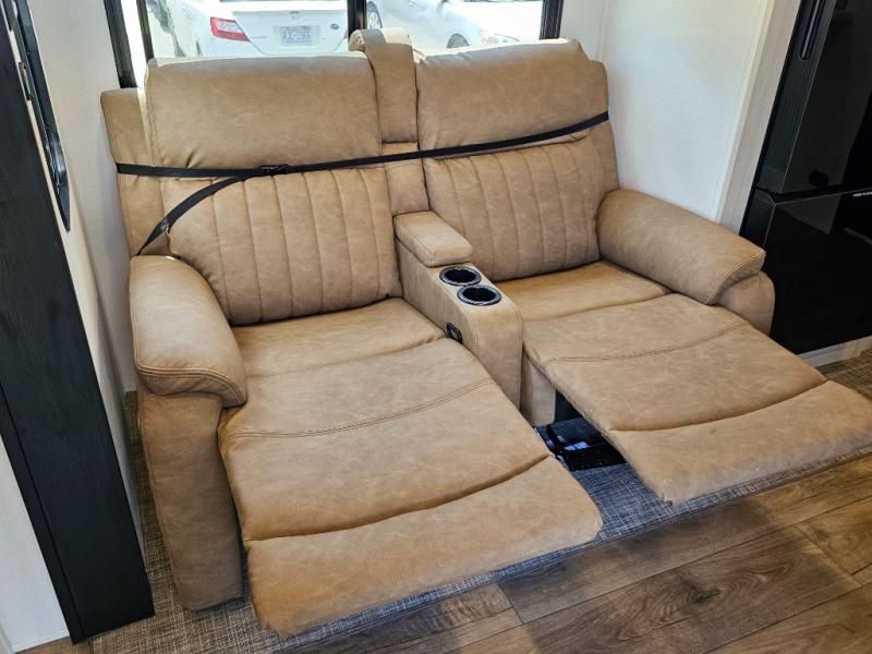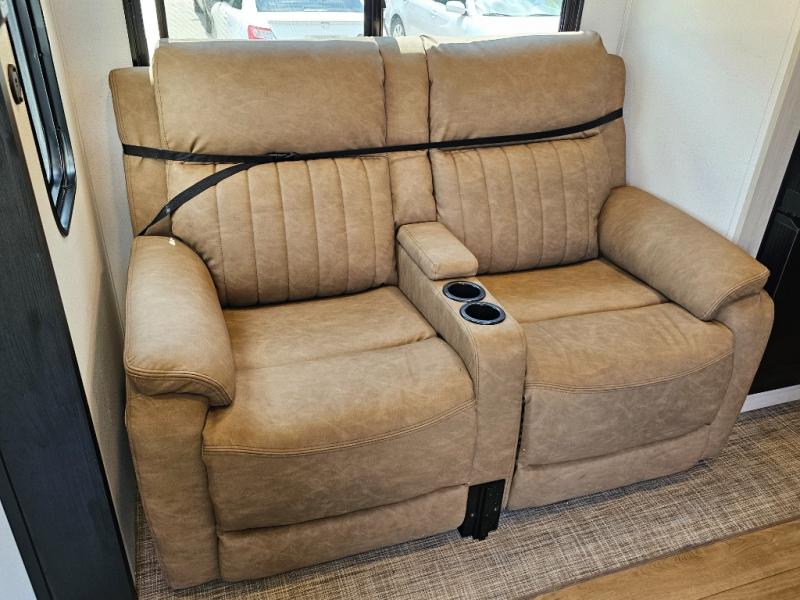 Comfortable theater seating positioned across from the electric fireplace