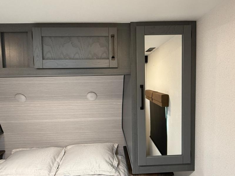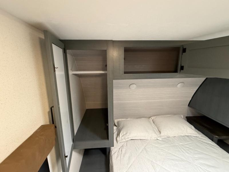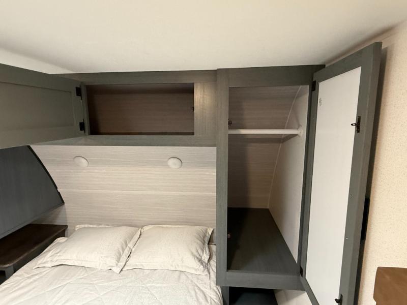 Private front bedroom with queen bed, dual wardrobes, overhead storage, sliding or solid door for privacy.