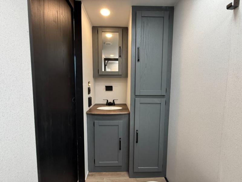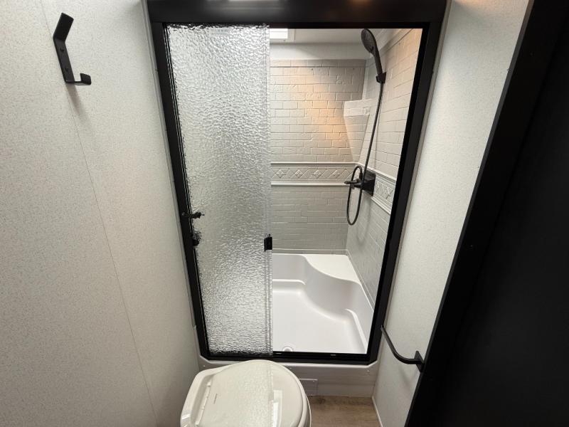 Rear full bathroom: 32" × 34" (or similar) shower, vanity & medicine cabinet, skylight in some models.